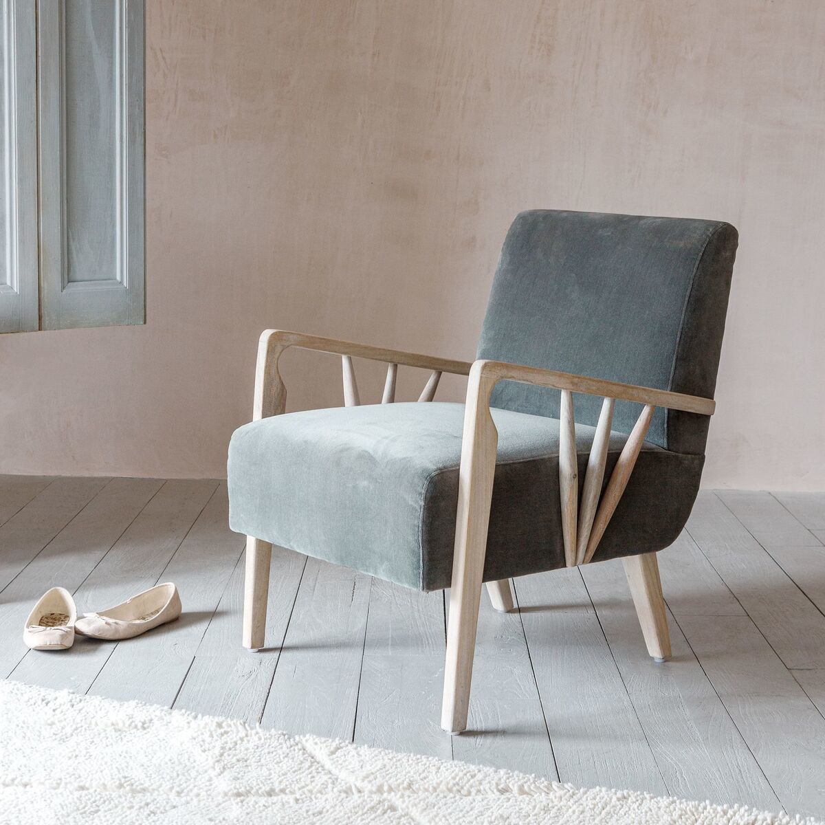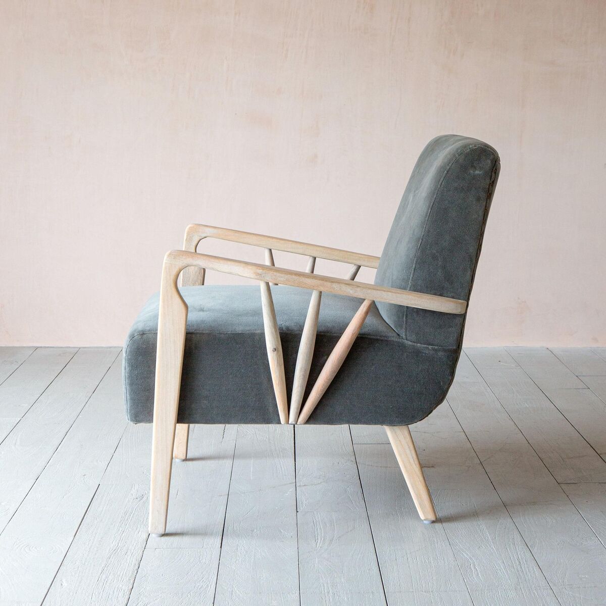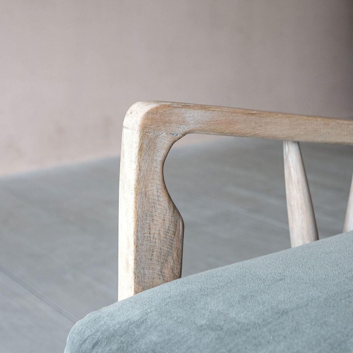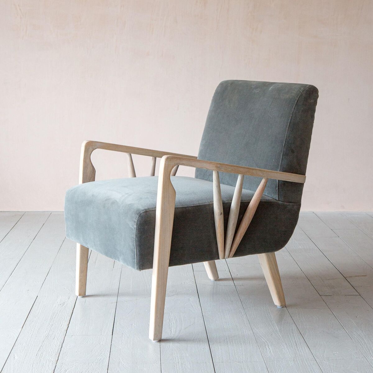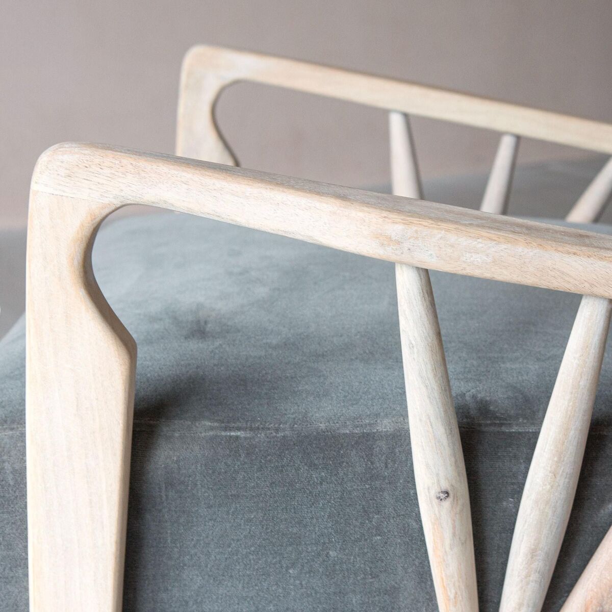 A mid-century inspired armchair handcrafted from mango wood with a whitewash finish and upholstered in sumptuous grey velvet. Complete with exposed arms, the Braun armchair has a subtle Scandinavian twist.