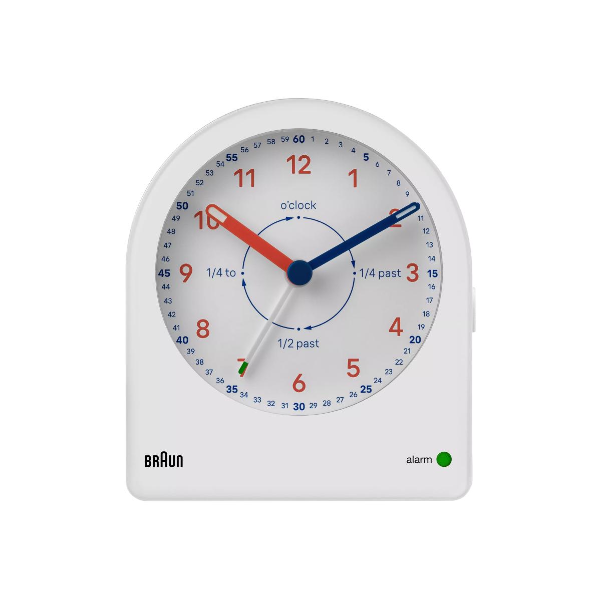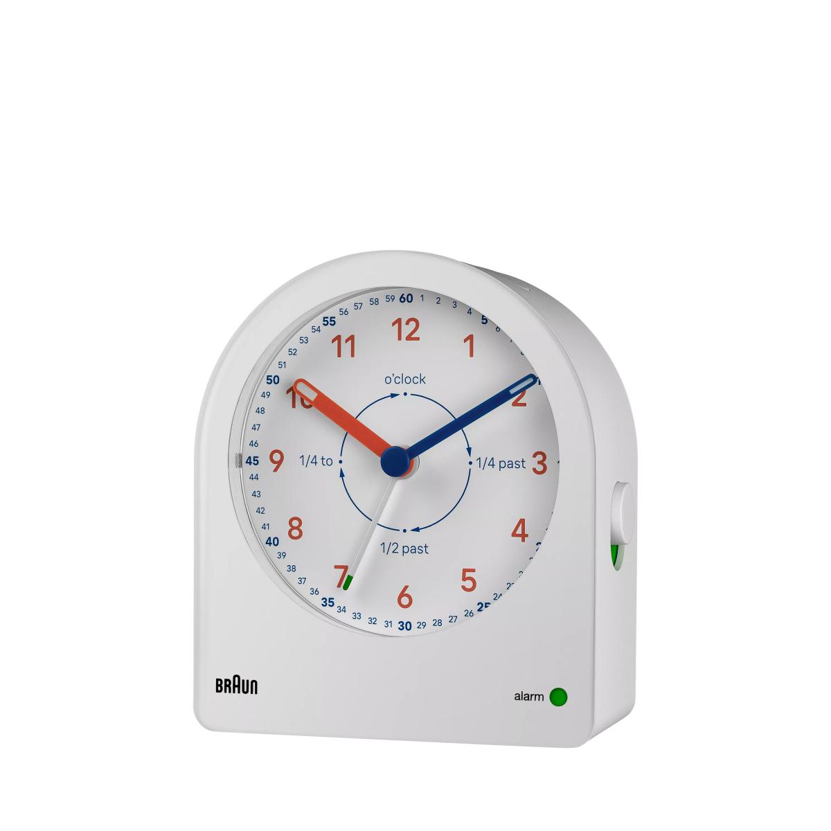 This Braun classic analogue alarm clock has an easy-to-read dial layout. Great for learning to tell the time. The clean, simplistic dial and contrasting hands with luminous tips offer great legibility, and the quartz step movement is quiet and precise. The continuous backlight function illuminates the dial when in a low-light environment to ensure the time can be read at night. This feature can be disabled. Key features: Crescendo beep alarm — The beep alarm gets more frequent and louder if you do not turn it off Snooze/backlight function — Snooze interval is 5 minutes. Backlight illuminates for 5 seconds once manually activated Continuous backlight function — Illuminates the dial when in a low-light environment. The unobtrusive backlight means the time can easily be read at night. This feature can be disabled Luminous tipped hands Quiet precision quartz movement Simple timekeeping — This classic clock has an easy-to-read dial with descriptions for telling the time and coloured markers that correspond to the minute and hour hands. This makes learning and telling the time easy Battery efficiency — For optimal performance in timekeeping, backlight and alarm functions, use only new alkaline batteries