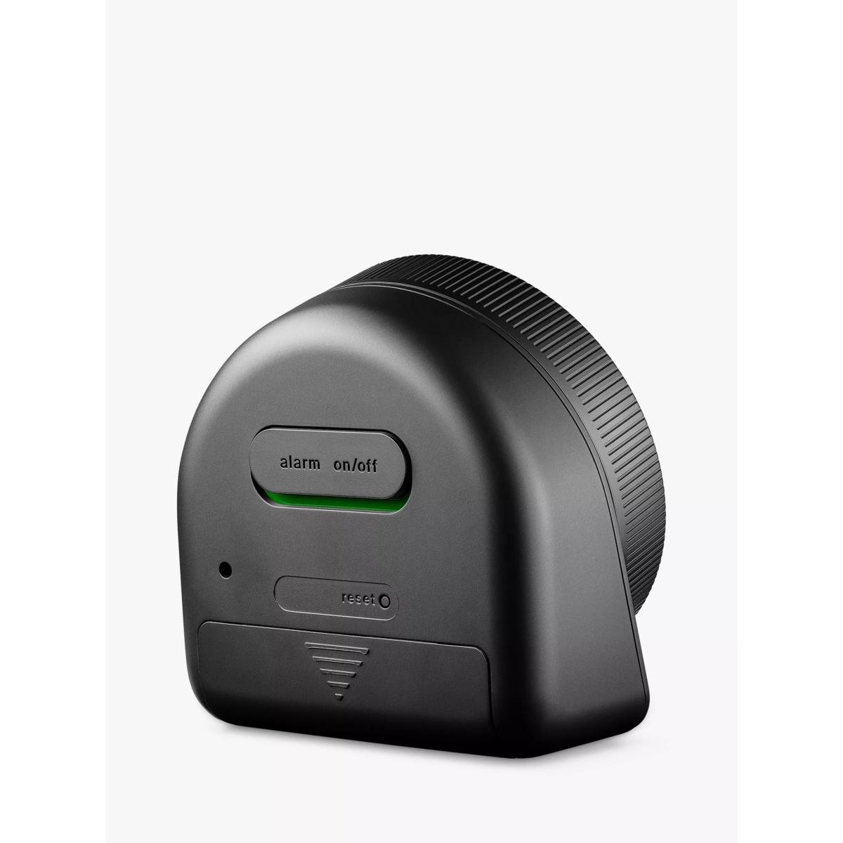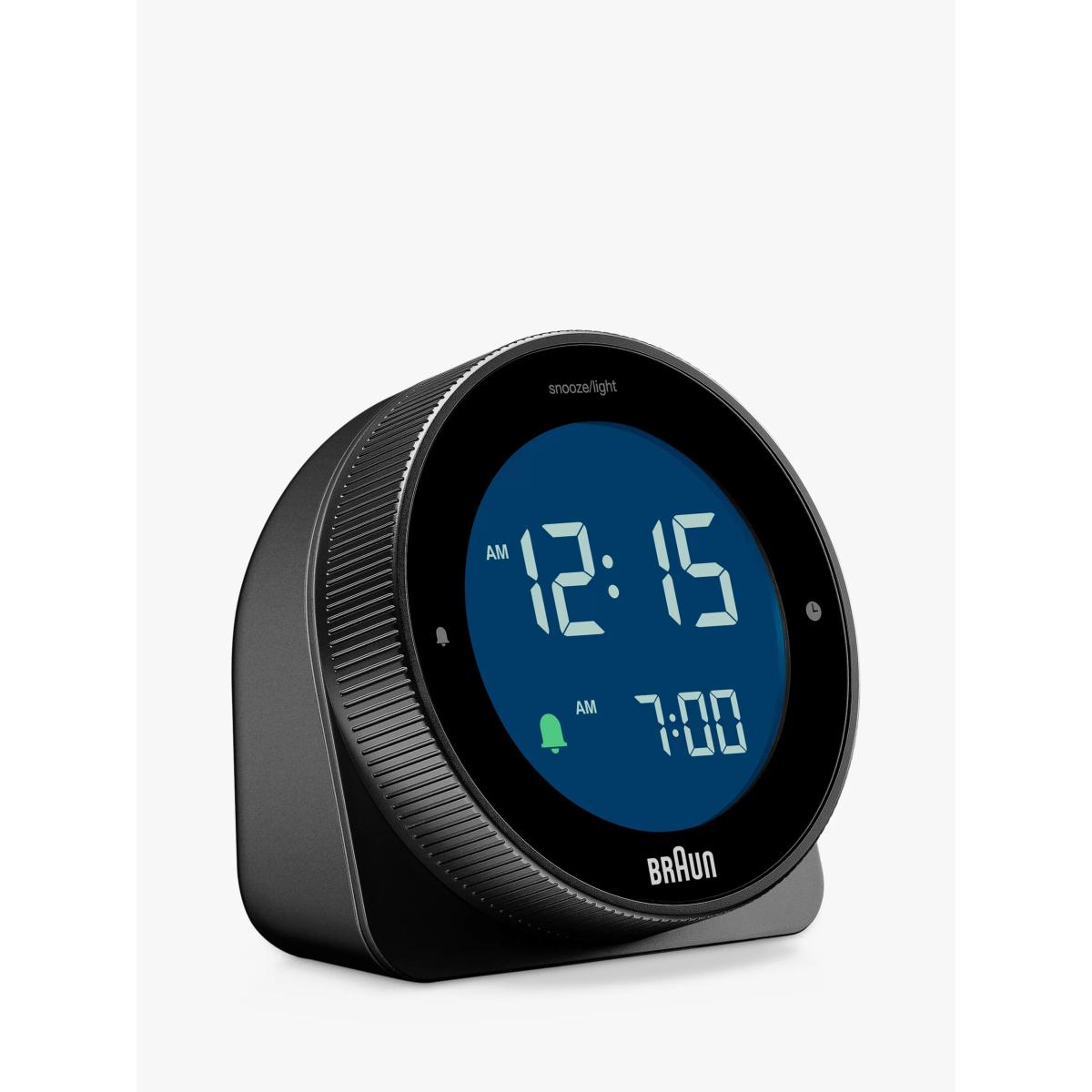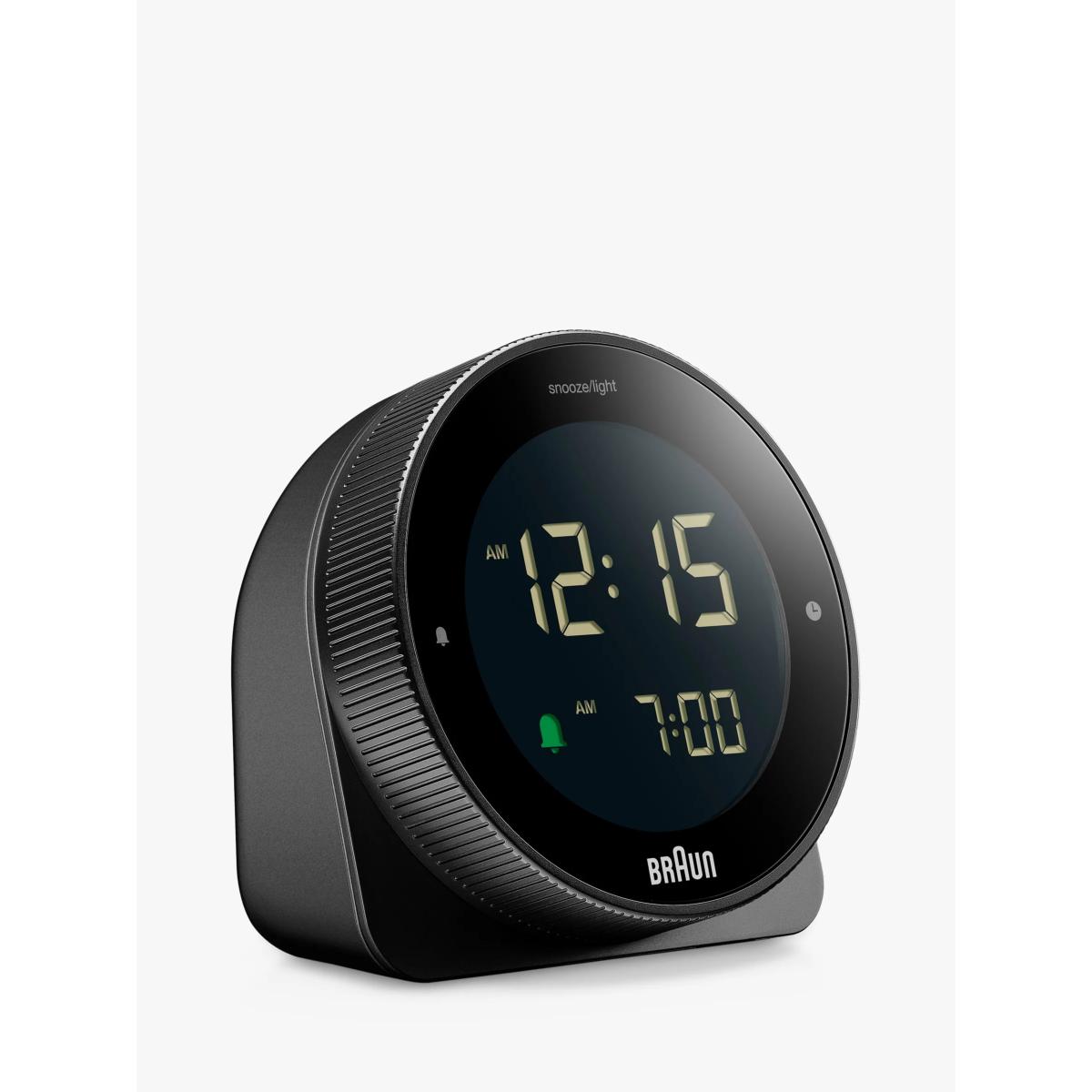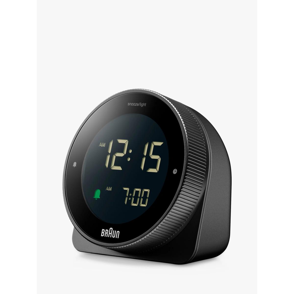 Braun digital alarm clock with a rotating round bezel for quick time setting. A compact design that's ideal for travel and bedside tables, it has a snooze function, negative LCD display and a crescendo beep alarm.