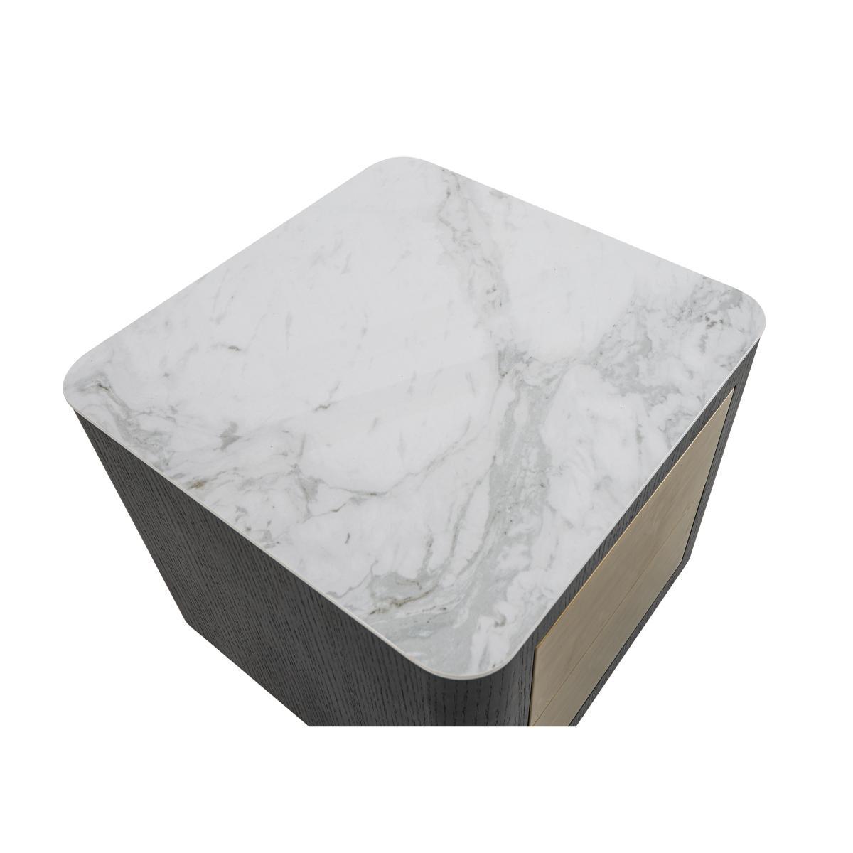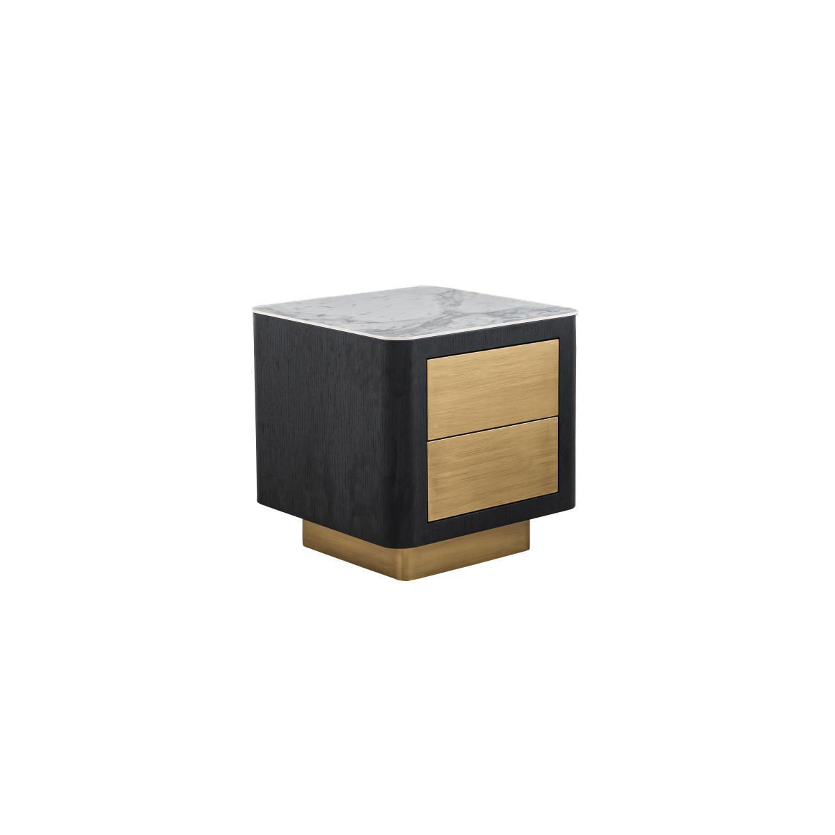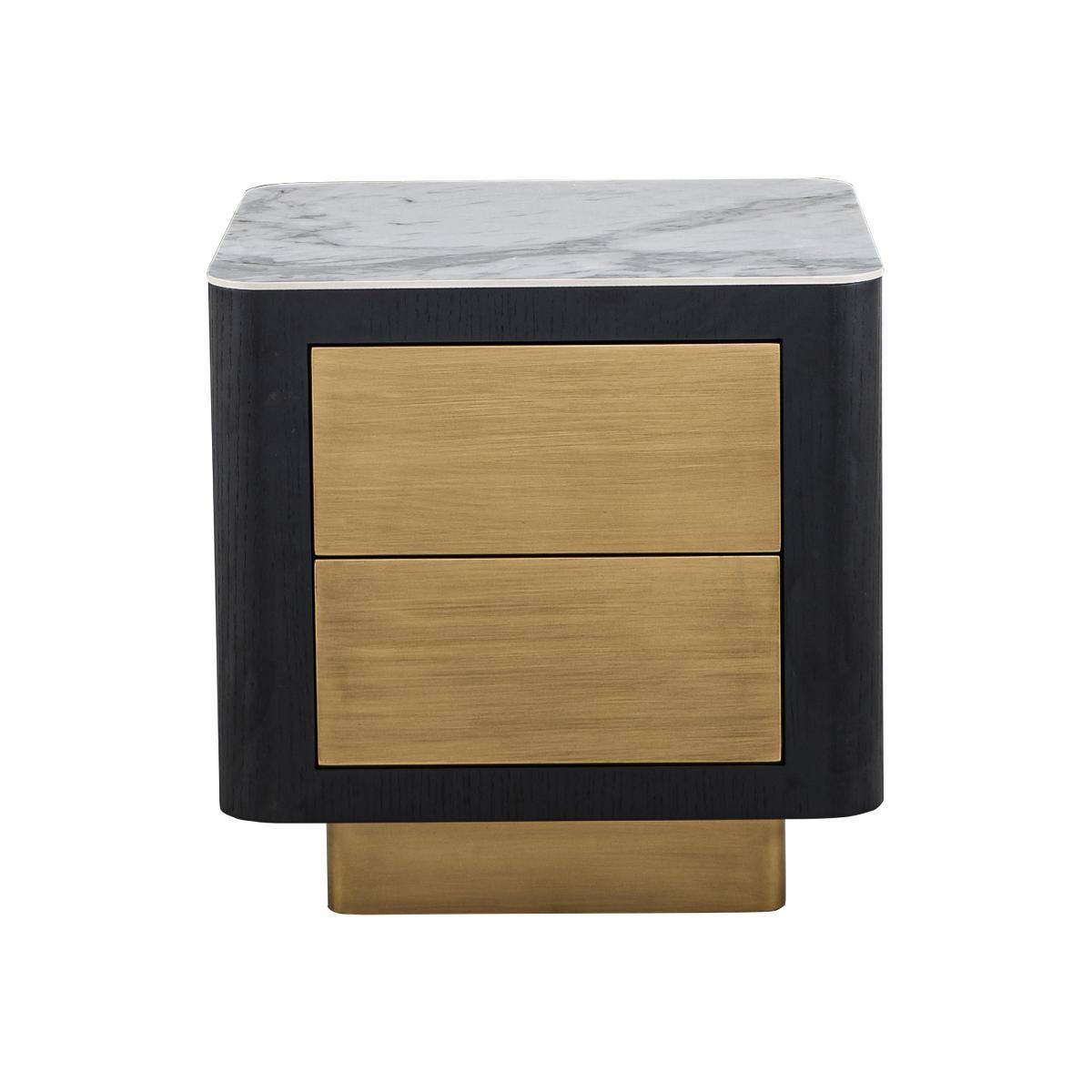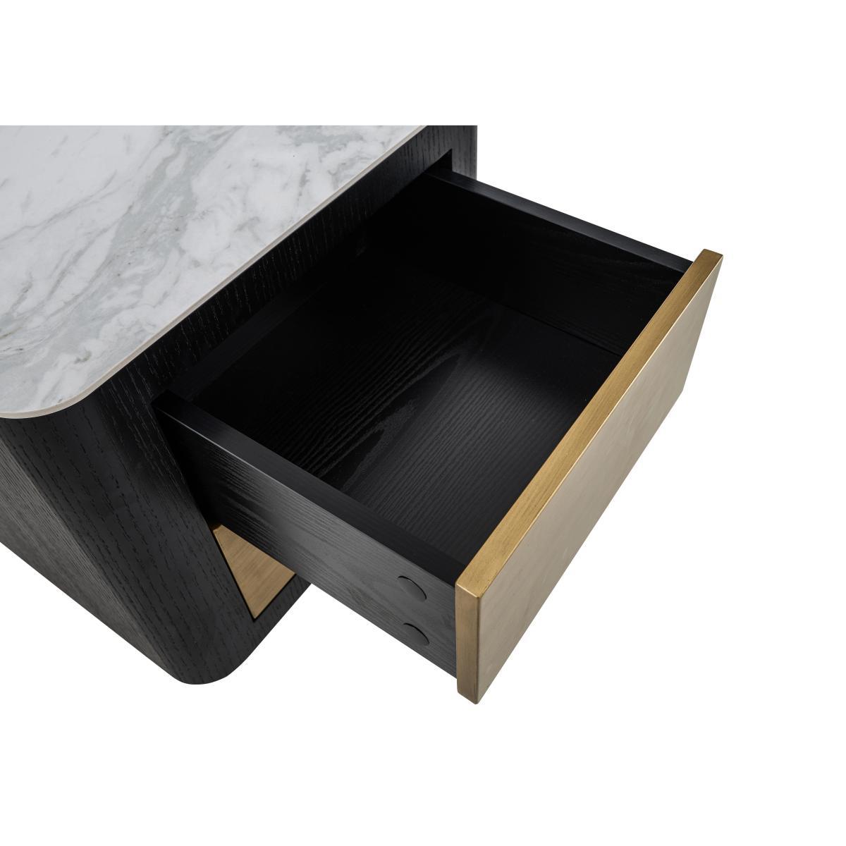 The Brava lamp table is so glamorous, it also works as a bedside table. Made from a rich mix of high quality materials including white marbled ceramic. Why you'll love it. Glamorous and functional. White marbled ceramic, black oak and brushed brass. High quality workmanship in every detail. Square with gently rounded corners. Two drawers offer plenty of useful storage. Versatile, also works as a bedside table. Coordinates with the Brava coffee table, available separately. What you need to know. Ceramic top with a white Carrara marble finish. Frame is MDF finished with black oak veneers. The 2 drawers have push-to-open mechanisms. Drawer fronts and modern pedestal base finished in brushed brass. This table should be wiped clean with a damp cloth then dried using a soft duster. Do not use abrasive cleaners or the product could scratch.