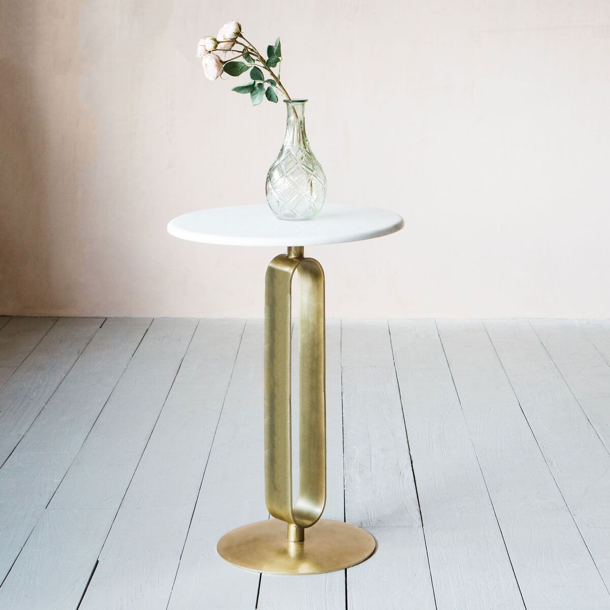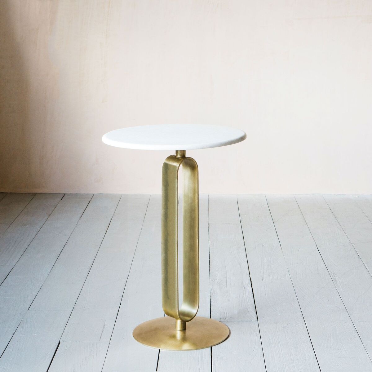 A modern take on a classic piece of furniture. A smooth marble top sits on top of a cutout brass base. With a charming hand-made finish, this sophisticated table will sit perfectly next to your favourite armchair.