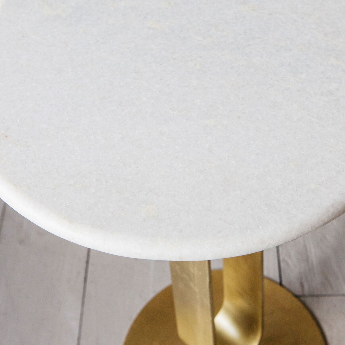 I love this side table because of its sleek, contemporary design that combines a marble top with a metallic base, making it versatile for a range of interiors. It works particularly well in modern or minimalist settings, where the marble adds a touch of luxury and the brass finish injects warmth. For styling, consider pairing it with a statement lamp or a small decorative object to keep it functional yet visually appealing. It also works beautifully as a bedside table or alongside a sofa, and its slender profile ensures it doesn't dominate smaller spaces. Keep accessories neat and understated to let the materials shine.