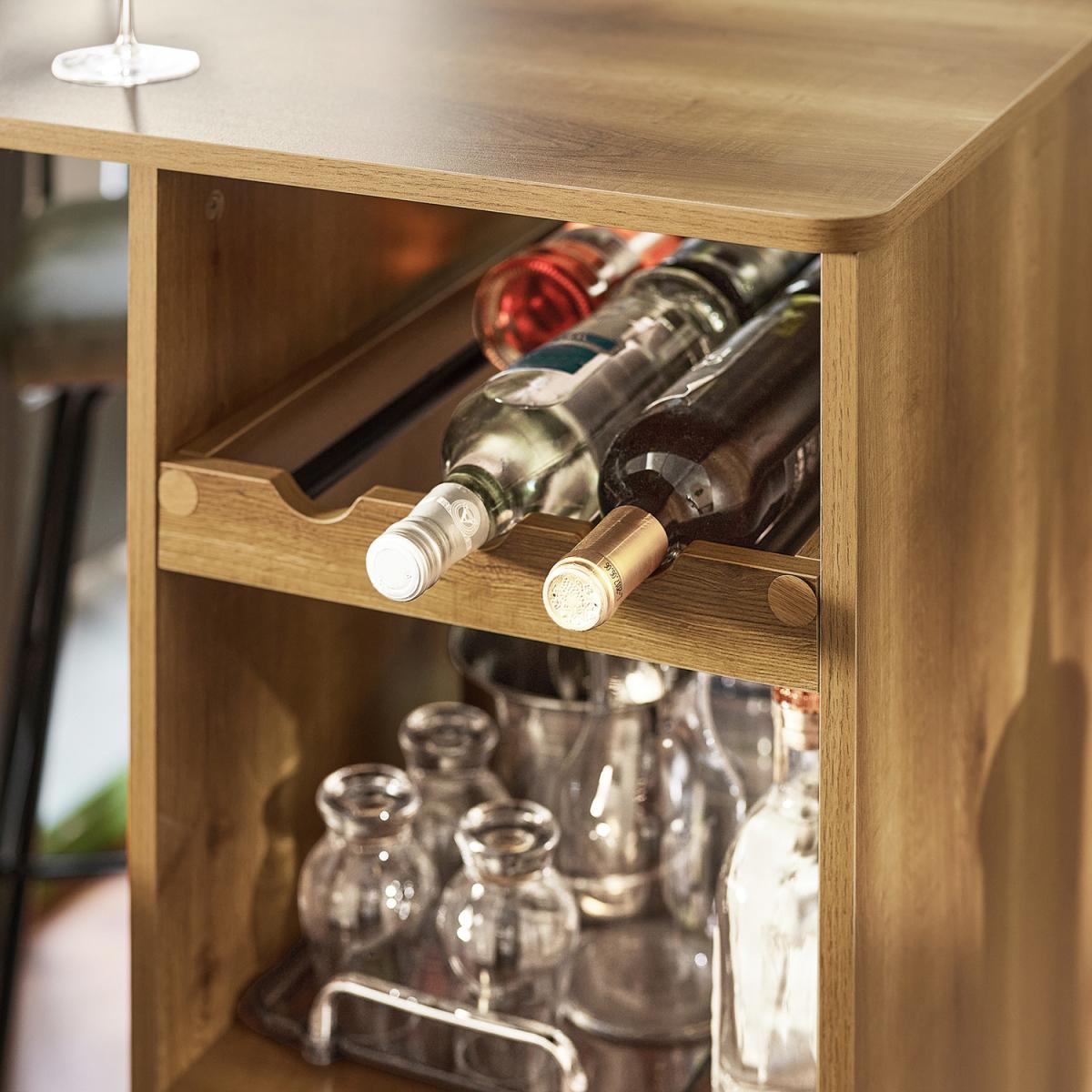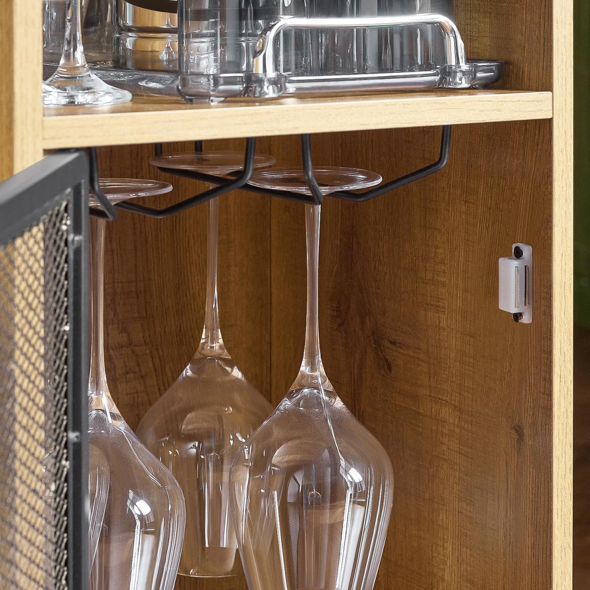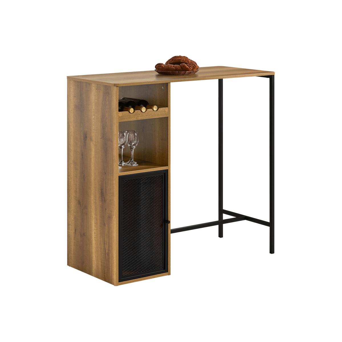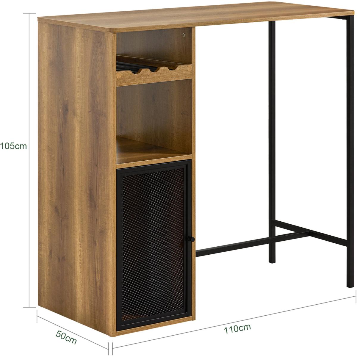 This Industrial Vintage Style Bar Table creates a distinctive and modern atmosphere and adds more storage space to your home. A diverse and contemporary product, good choice for the kitchen, dining room, living room, etc. The large table surface area offers enough space for you. It has various storage options, providing ample storage space for wine bottles, wine glasses and other items. A wine rack can hold 3 wine bottles. The storage compartment beneath the wine rack offers you additional storage space. The cabinet has a metal grid door. There are 2 wine glass holders inside, which can hold 4 wine glasses. There is also a storage compartment on the back of the cabinet. Made of high quality particle board with wooden effect and black powder coated steel frame. Stable and durable. Practical and fashionable, this bar table will provide a functional as well as relaxing place to eat and drink with family and friends, or just enjoy your own leisure time.