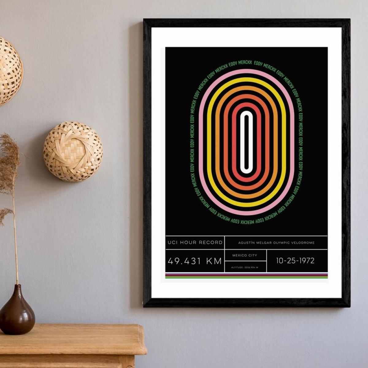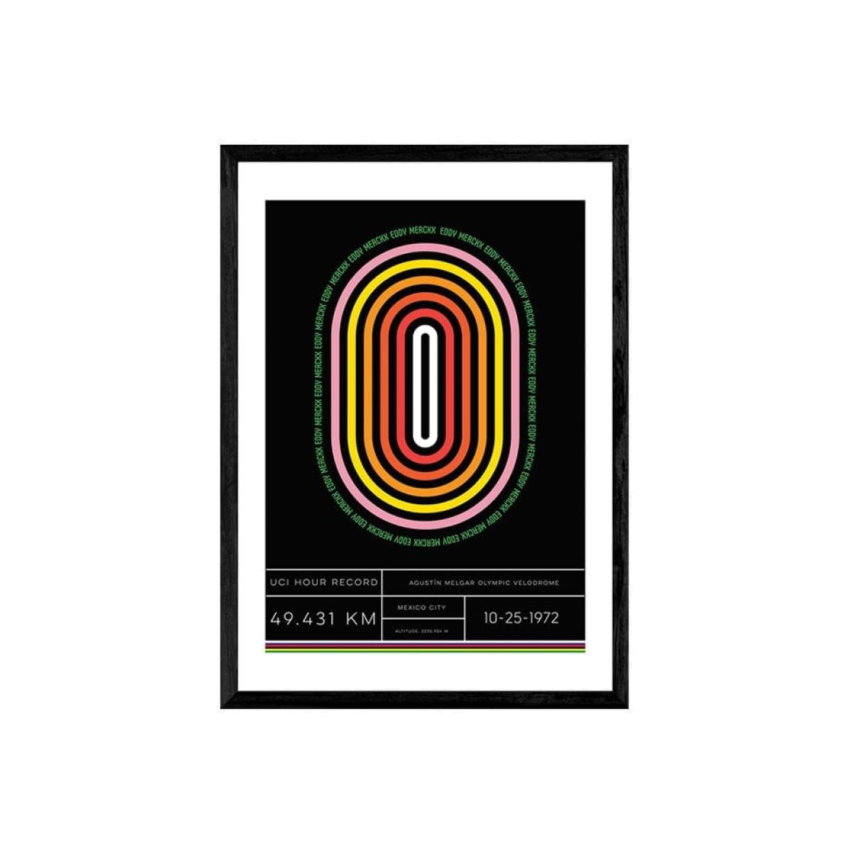 For Sports Enthusiasts everywhere, this graphic print depicts the iconic hour record set by Eddy Merckx in Mexico City, in 1972. The colours in this graphic print really pop against the black background, with record details listed along the bottom. Only giclée printing processes are used for this print resulting in the highest quality museum-level colours and sharpness. Choose between a number of different coloured frames and three sizes for the perfect print for your space.