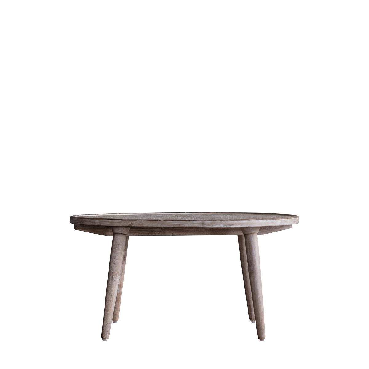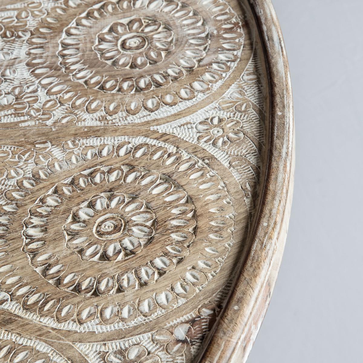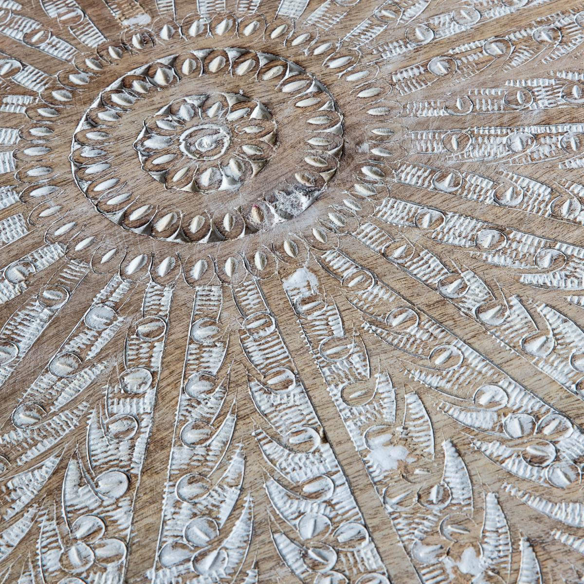 * Hand carved details* White-wash finish* Mango wood frame This coffee table features a soft natural finish and hand-carved detailing in a white-wash finish, making it a standout addition to any room. The intricate and shallow carvings on the tabletop allow for safe placement of glasses and ornaments, blending functionality with artistic design. Supported by hand-turned tapered legs, this coffee table creates a stylish and elegant presence.