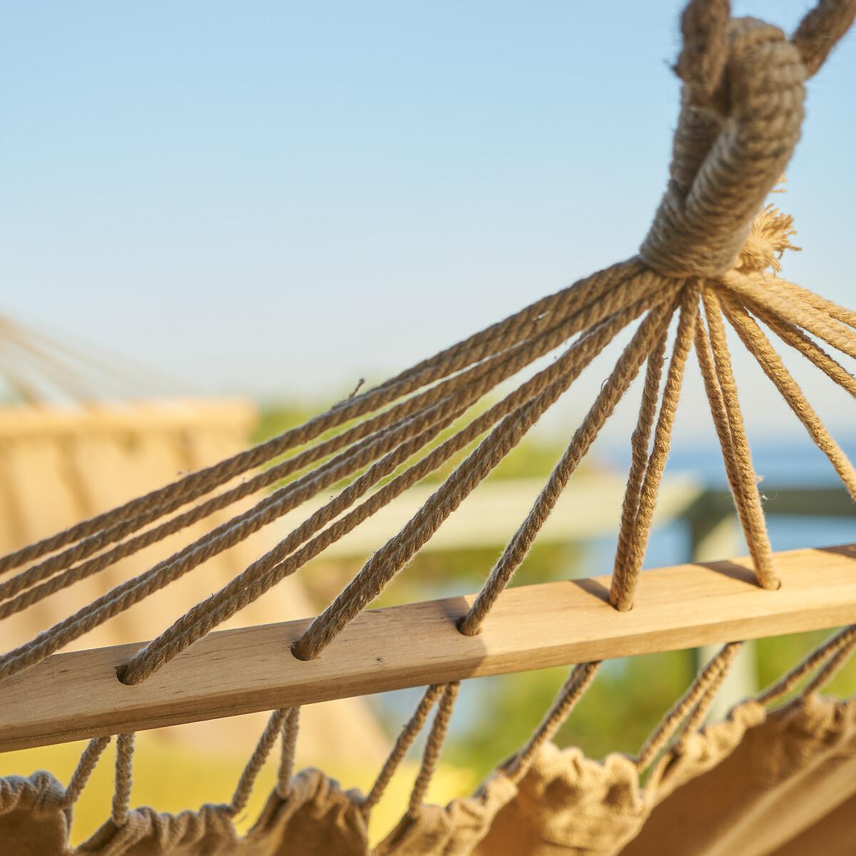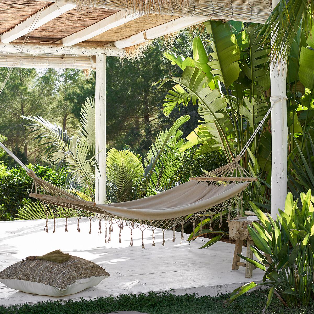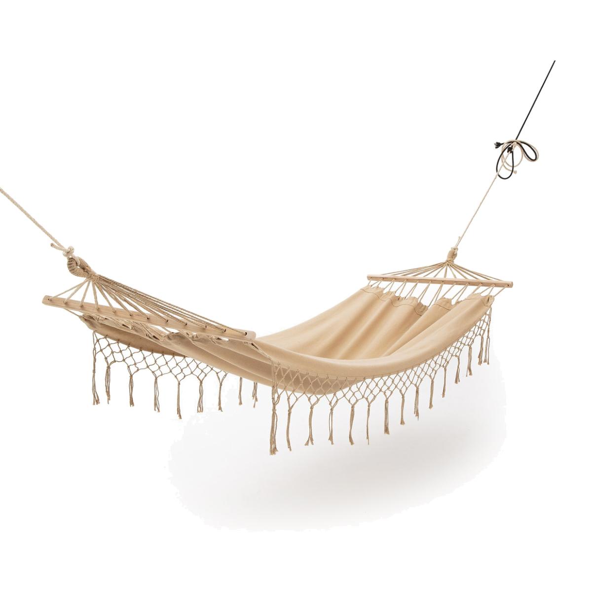 The Bregnac polycotton hammock. Product Details • In thick polycotton • Knotted fringing at the sides • Woven fixings • FSC® certified birch bars. Dimensions • L200 x W100cm