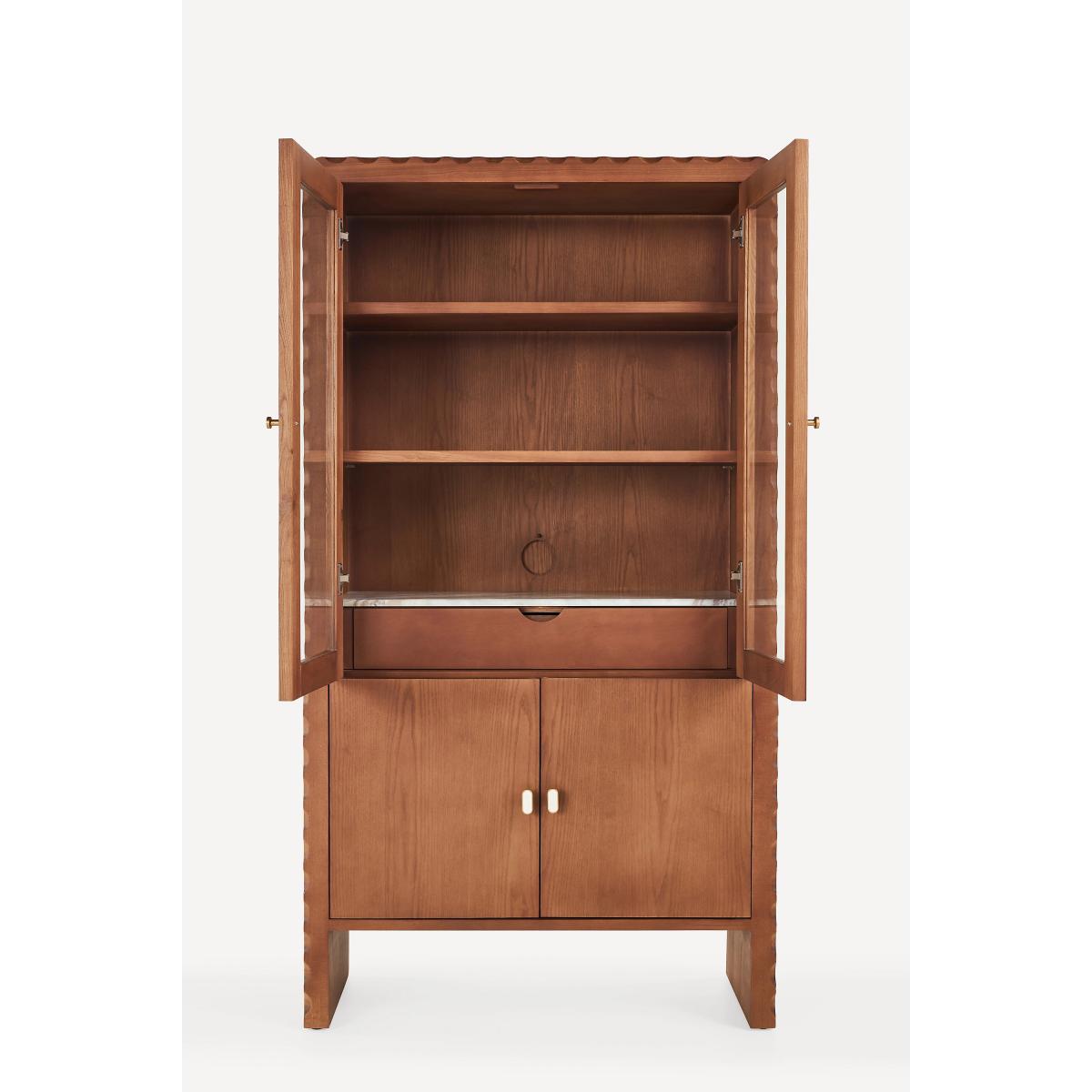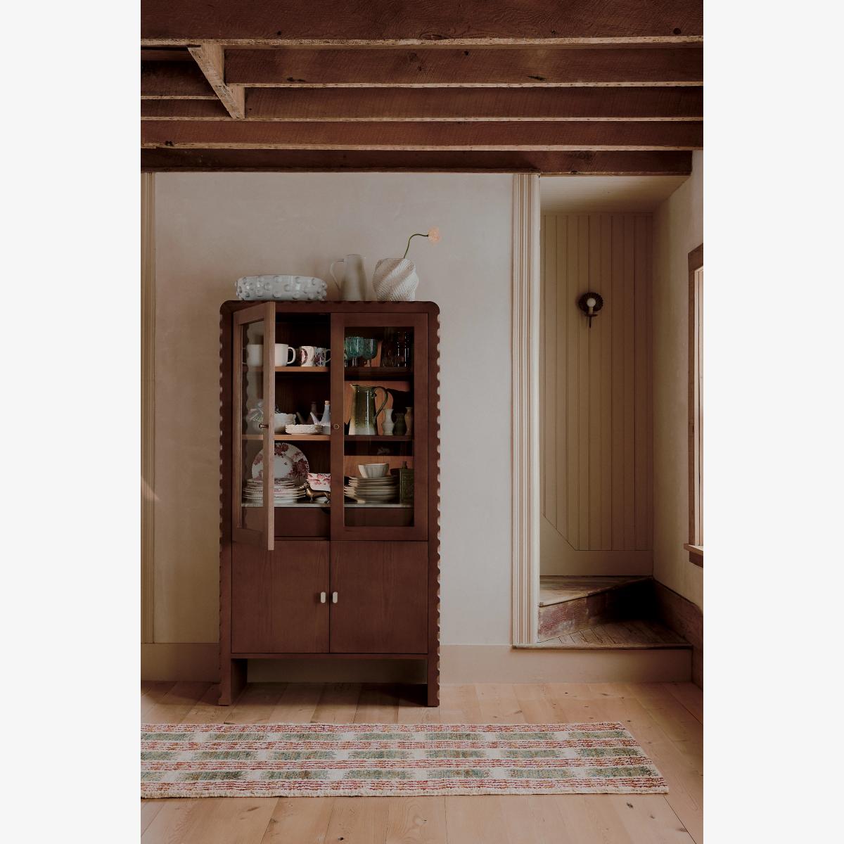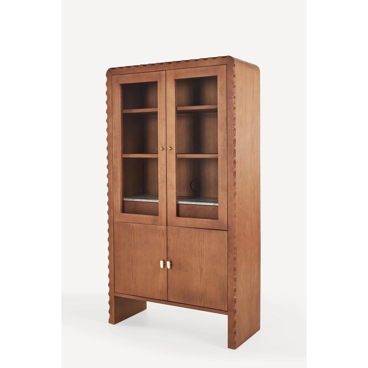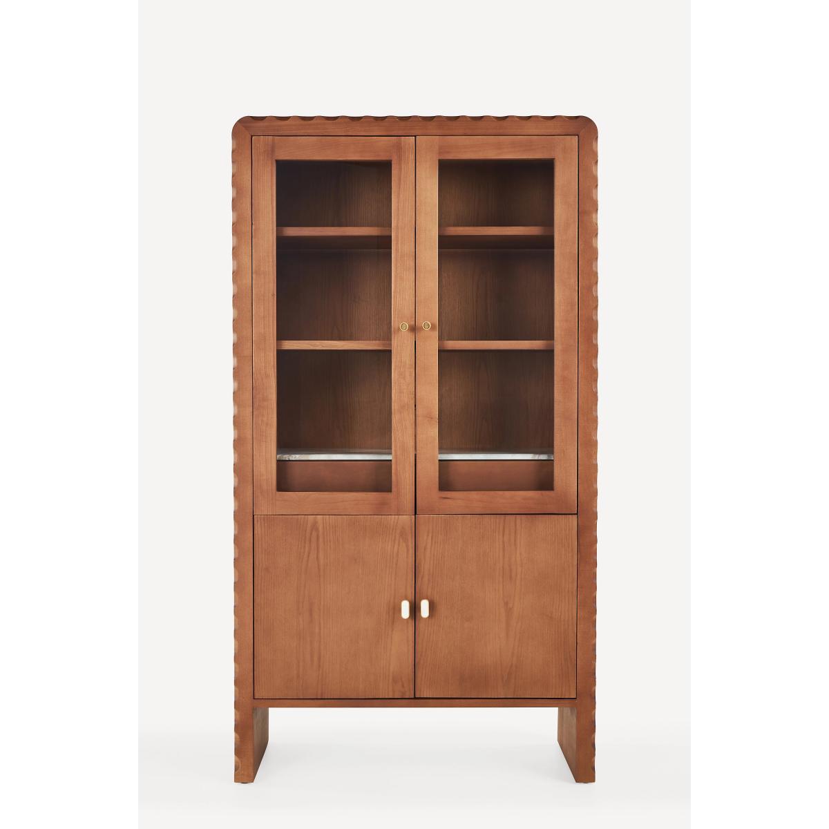 This stately cabinet features a warm wood finish, delicate scalloped edges, and glass-paneled doors to display your finest china. * Ash wood and marble top hutch * Metal hardware * Includes three shelves * Wipe clean with dry cloth; avoid using chemical cleaners * No assembly required * Imported
