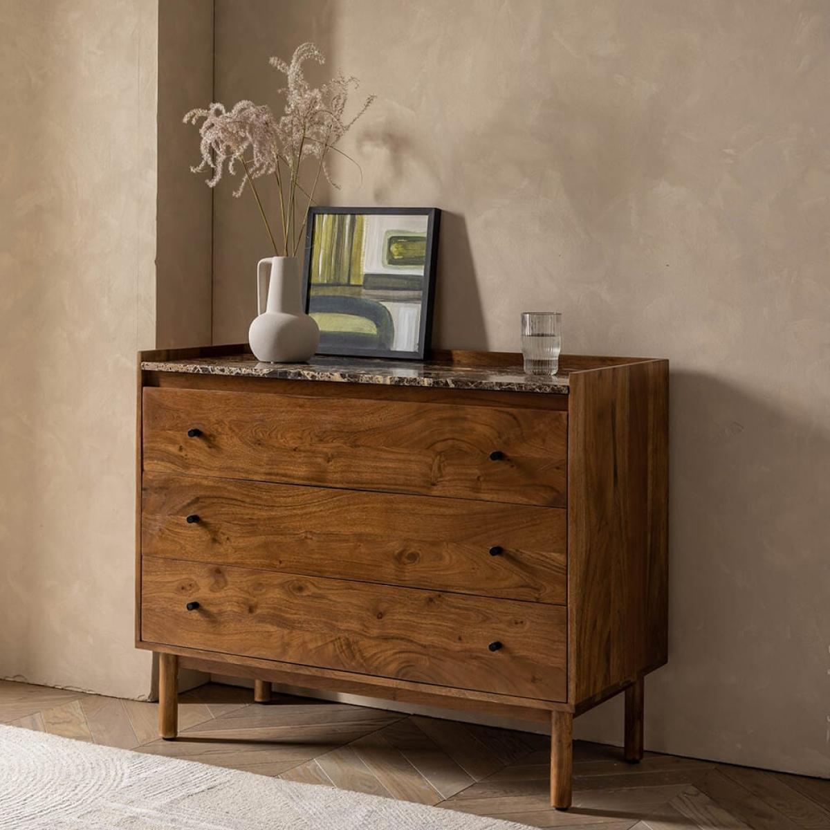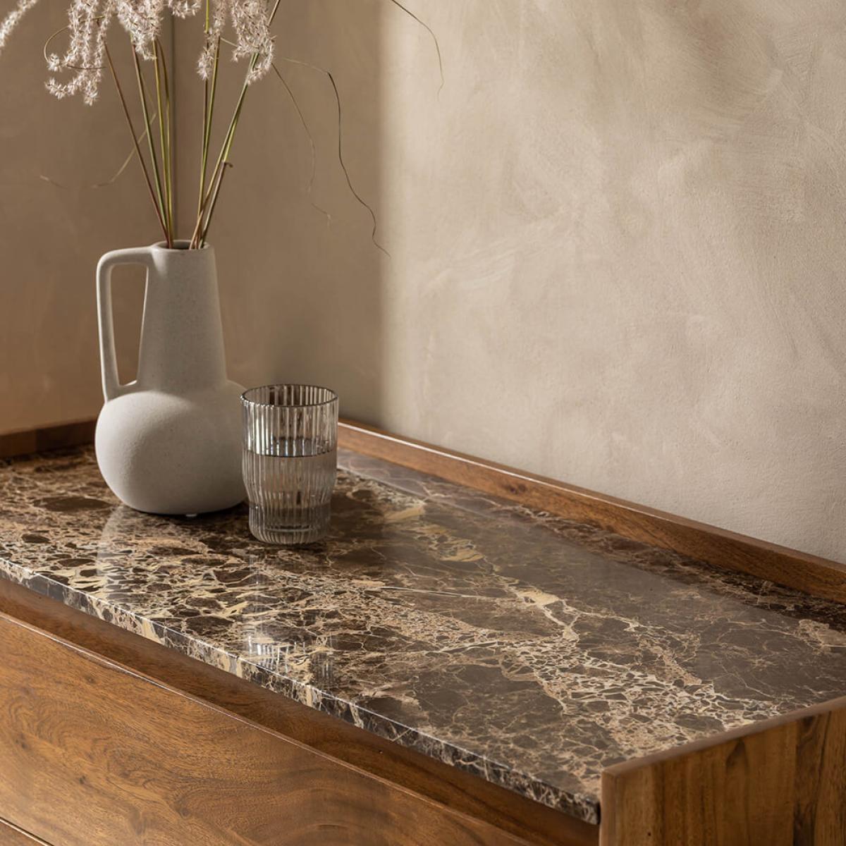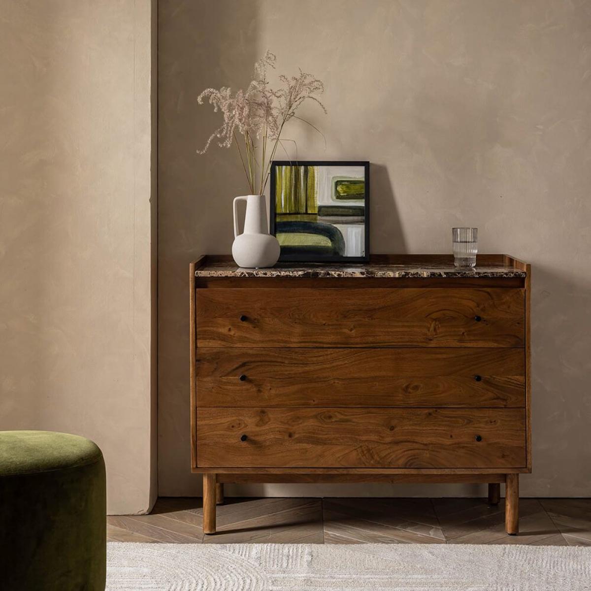 Serving classic good looks with a nod to Mid Century styling, this chest of drawers complements both traditional and modern spaces. Brera is made from acacia wood in a walnut finish and topped with Emperador marble with distinctive latte-coloured veining. Because it’s a natural material, the surface of each large chest of drawers is completely unique, meaning you’ll never see yours anywhere else. It’s not just pretty, either: four drawers provide generous storage, whether for accessories or clothing, finished with blackened metal barrel handles. Elegant cylindrical legs complete the look. Why not style yours by topping with artwork and accessories?