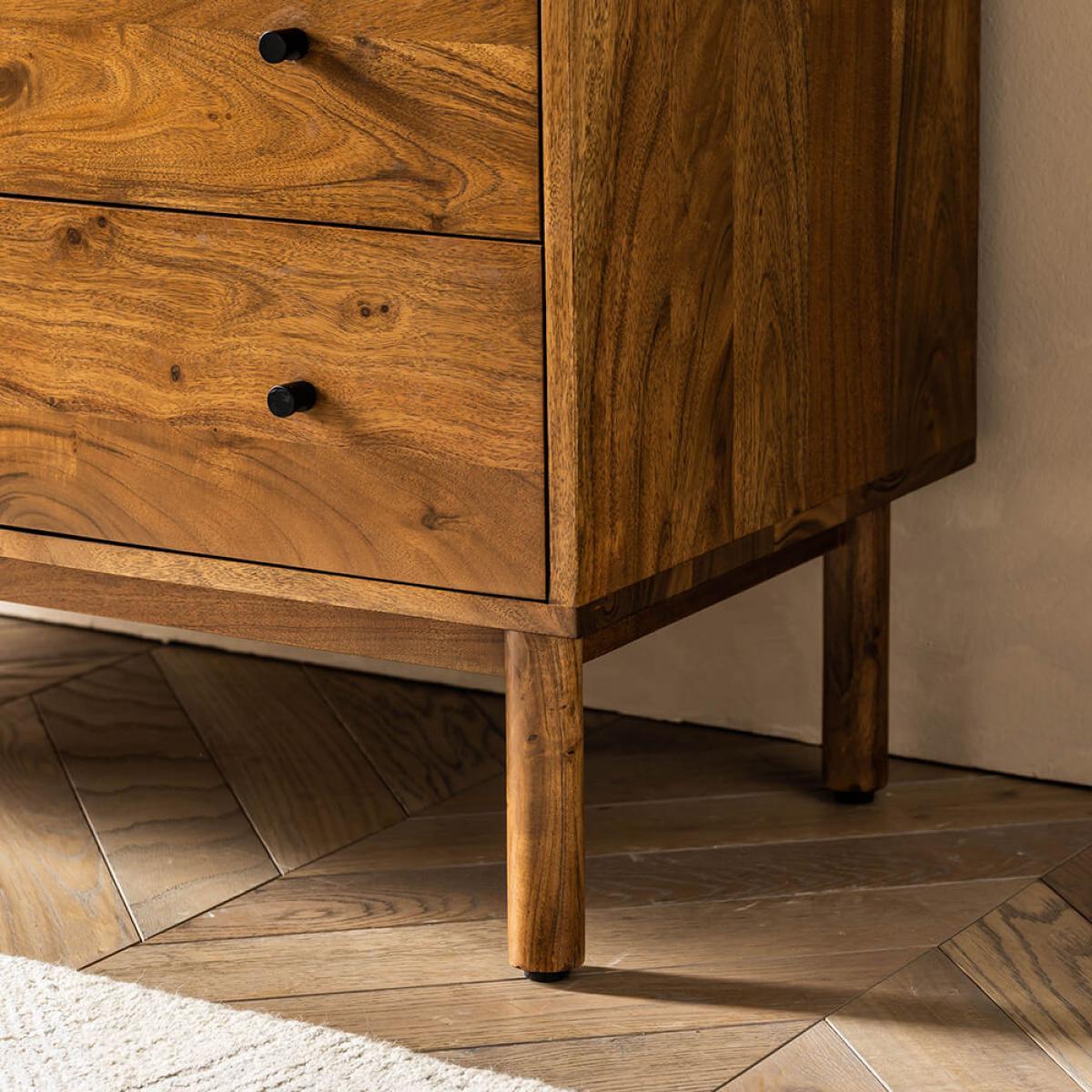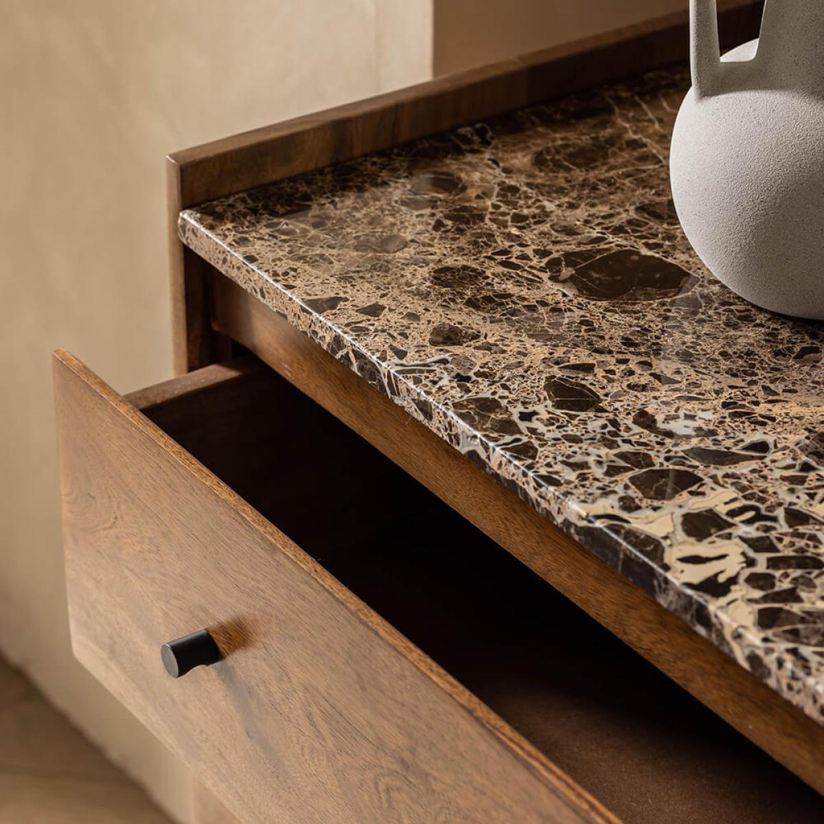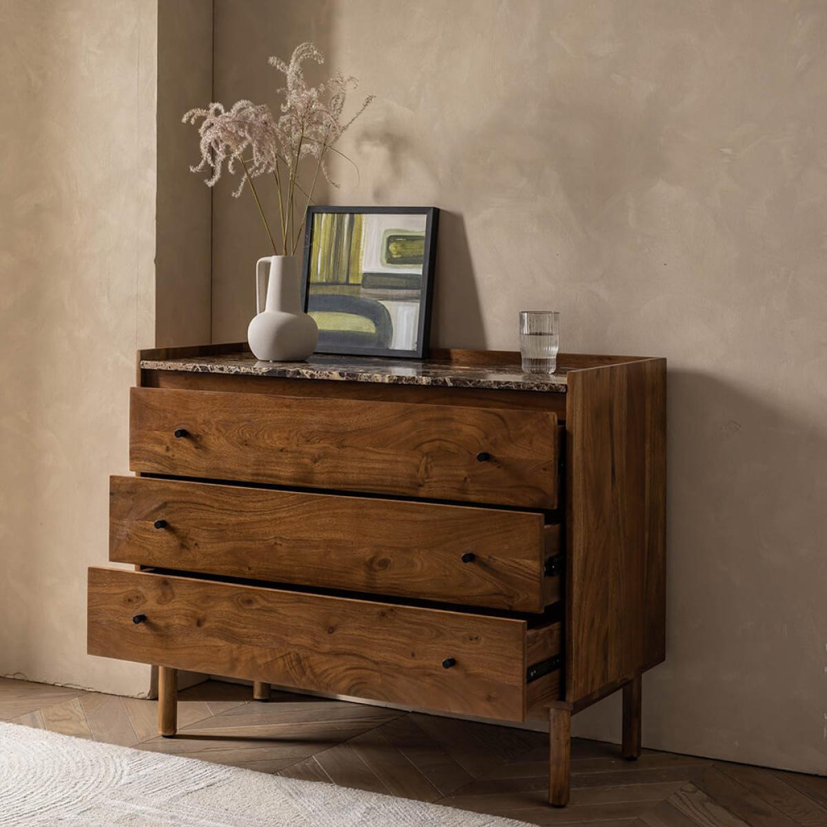 Serving classic good looks with a nod to Mid Century styling, this chest of drawers complements both traditional and modern spaces. Brera is made from acacia wood in a walnut finish and topped with Emperador marble with distinctive latte-coloured veining. Because it’s a natural material, the surface of each large chest of drawers is completely unique, meaning you’ll never see yours anywhere else. It’s not just pretty, either: four drawers provide generous storage, whether for accessories or clothing, finished with blackened metal barrel handles. Elegant cylindrical legs complete the look. Why not style yours by topping with artwork and accessories?
