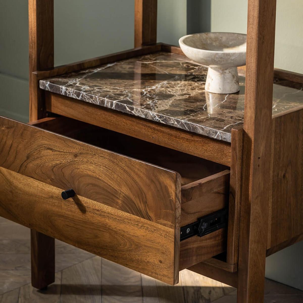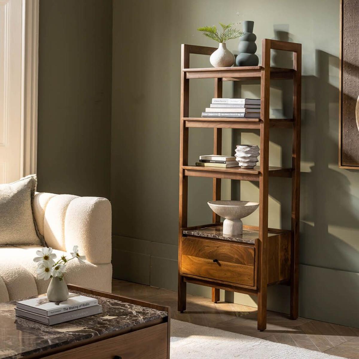 Serving classic good looks with a nod to Mid Century styling, this narrow shelving unit – which complements both traditional and modern spaces – is just the thing for storing or displaying books and accessories. Brera is made from acacia wood in a walnut stain with a slimline frame that means it will fit in even the tightest of spaces. Handily, it features a single drawer finished with blackened metal barrel handles and topped with Emperador marble with distinctive latte-coloured veining. Because it’s a natural material, the surface is completely one-of-a-kind. It’s not just pretty, either: in addition to the deep drawer, the small wooden shelving unit features three shelves with plenty of surface for arranging objects. Elegant cylindrical legs complete the look. Top tip: change up the accessories displayed on its shelves as a quick and easy way to refresh your room.