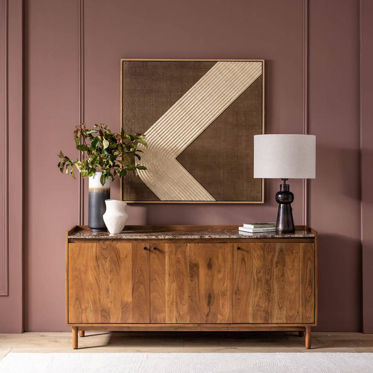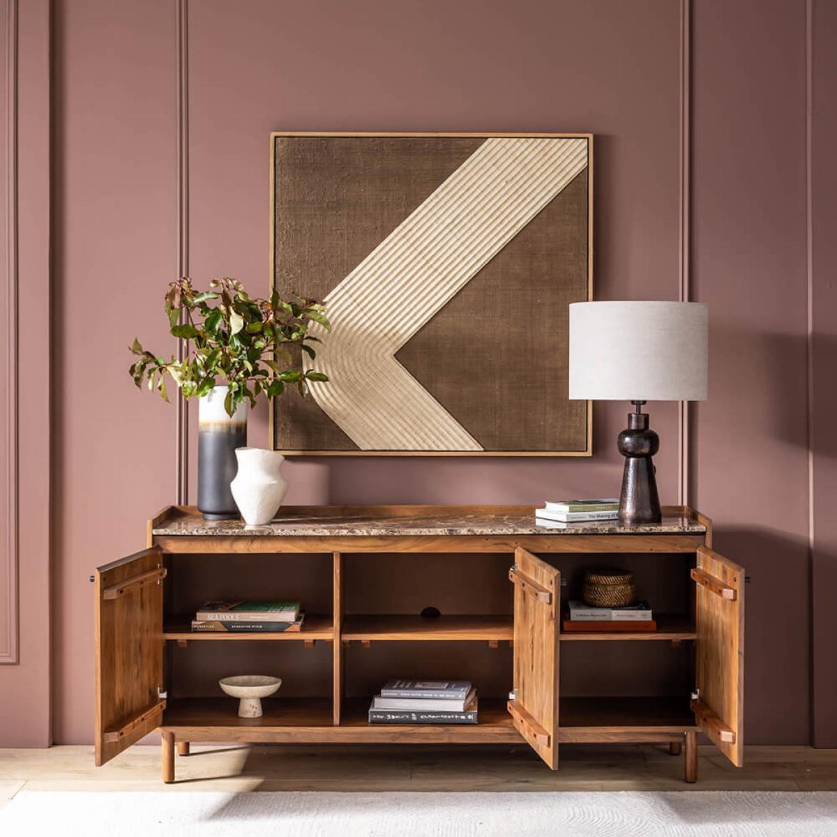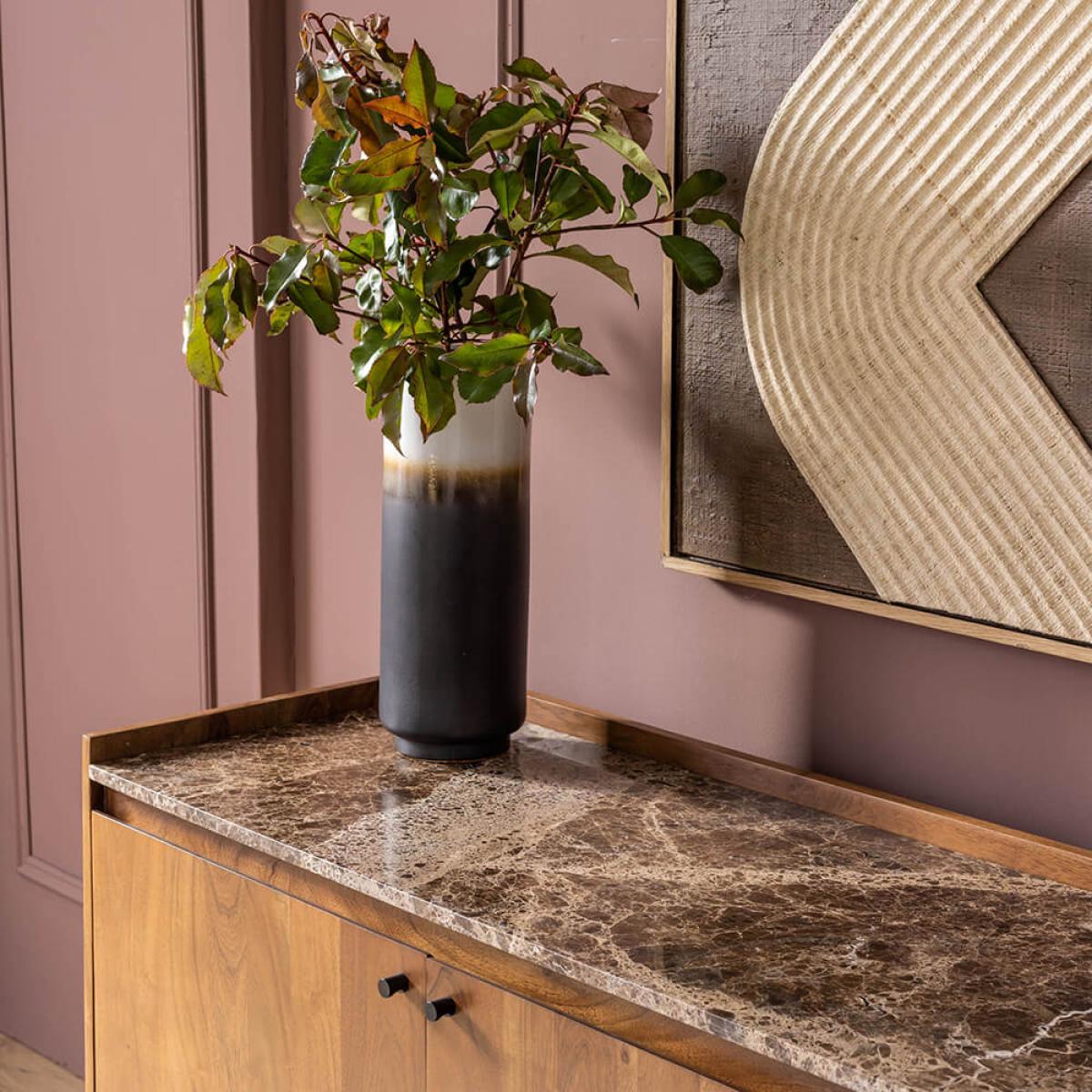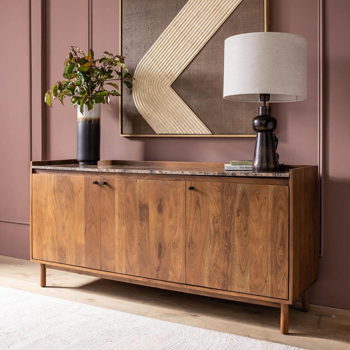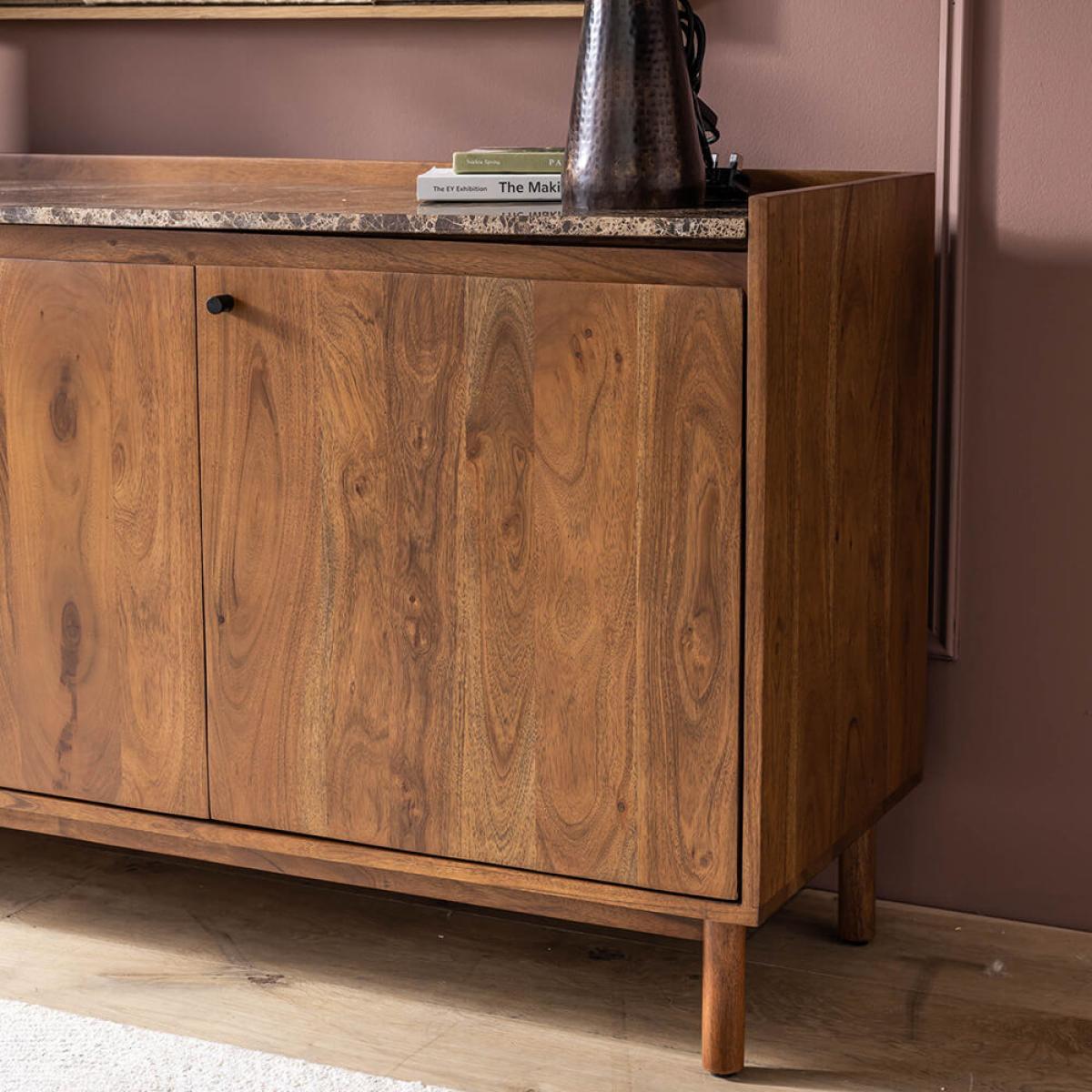 Combining Mid Century styling with classic good looks, this large sideboard with cupboards and shelves is perfect for storing and displaying items in your dining room. Featuring generous proportions and three compartments, Brera can accommodate everything from crockery to glassware and linen. Behind each door, a shelf cleverly divides the space, meaning belongings can be categorised and stored with ease. Blackened metal handles and cylindrical legs complete the look. The sideboard is made from acacia wood in a walnut finish and topped with Emperador marble with distinctive latte-coloured veining. The natural material means the surface of each is completely unique to ensure yours is the star of the show at any gathering. Top tip: set up a bar station on top to allow guests to help themselves to nightcaps.