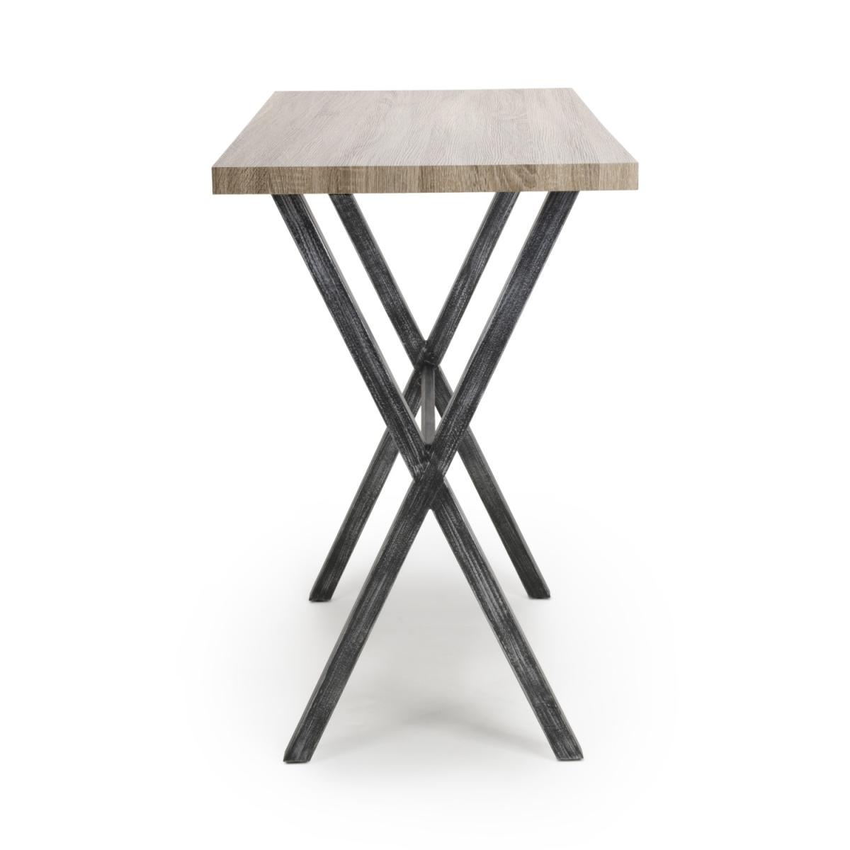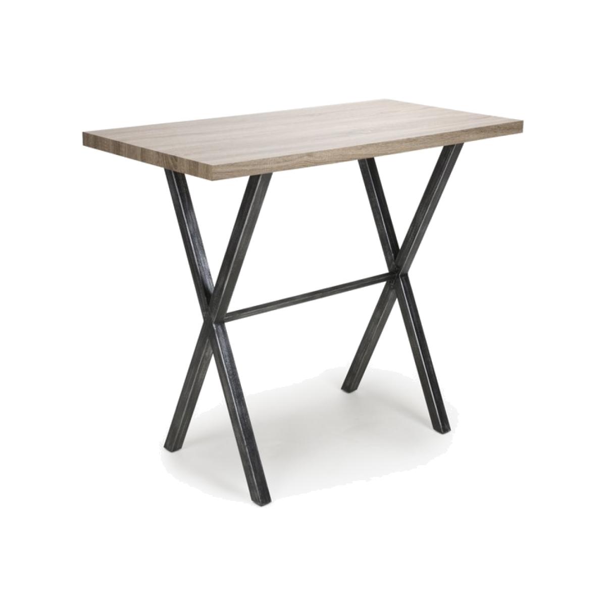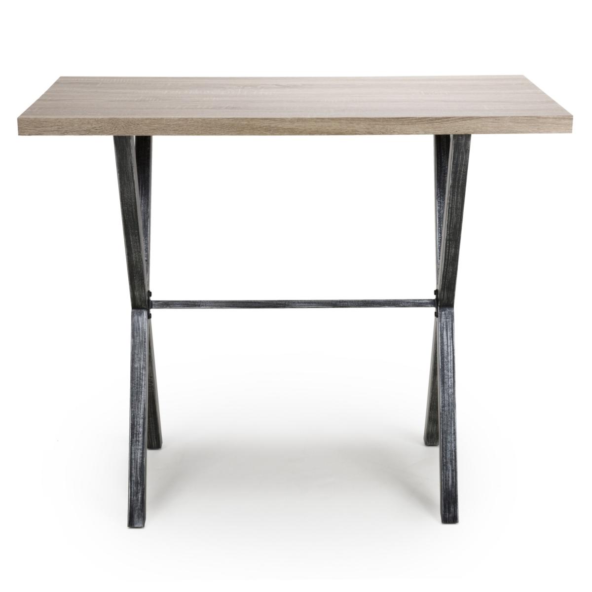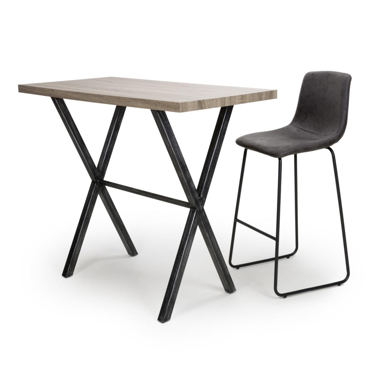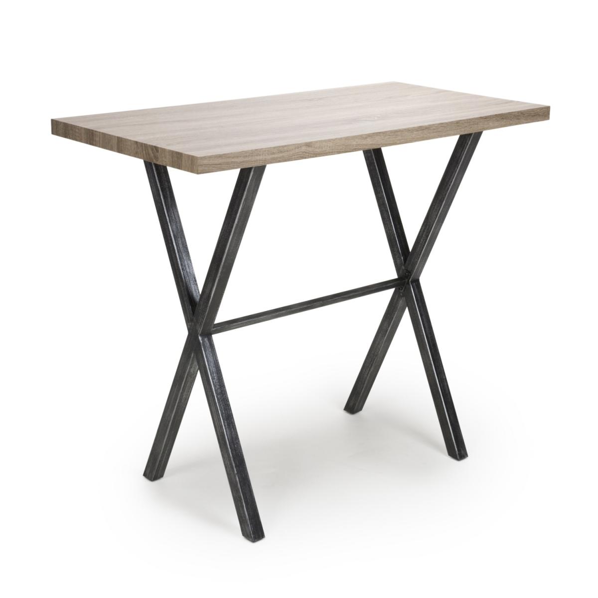 This 1.2m bar table brings industrial chic to the kitchen with a distinctive metal frame. The rectangular oak effect top is the ideal height to combine with stools. Antique painted black cross frame metal legs complete the rustic look. Assembly required. Sold individually.
