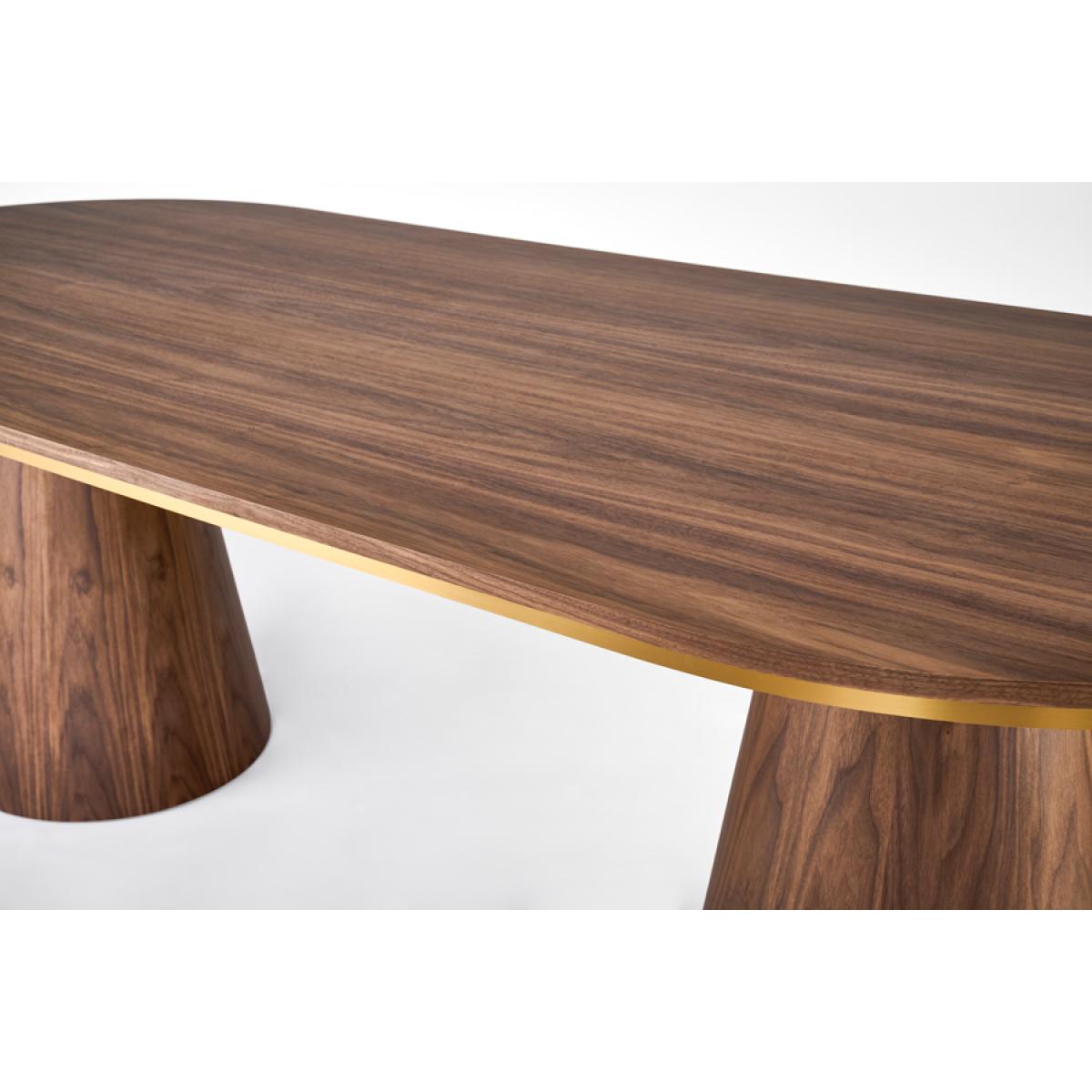 Dining table and six chair set. Walnut veneer twin pedestal dining table with satin lacquer finish. Brushed brass trim detail. Chairs with stainless steel frame and brushed brass finish. Velvet upholstery fabric. Simple assembly of table required; chairs supplied fully assembled.