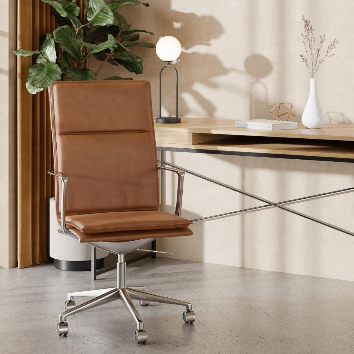 This is the Bria Office Chair; built with productivity in mind. The padded faux leather seat and high backrest in a vintage tan hue sits within a sturdy, height-adjustable chrome metal frame on wheels, making it easy for you to move and swivel throughout the day; the perfect contemporary vibe to your home office.