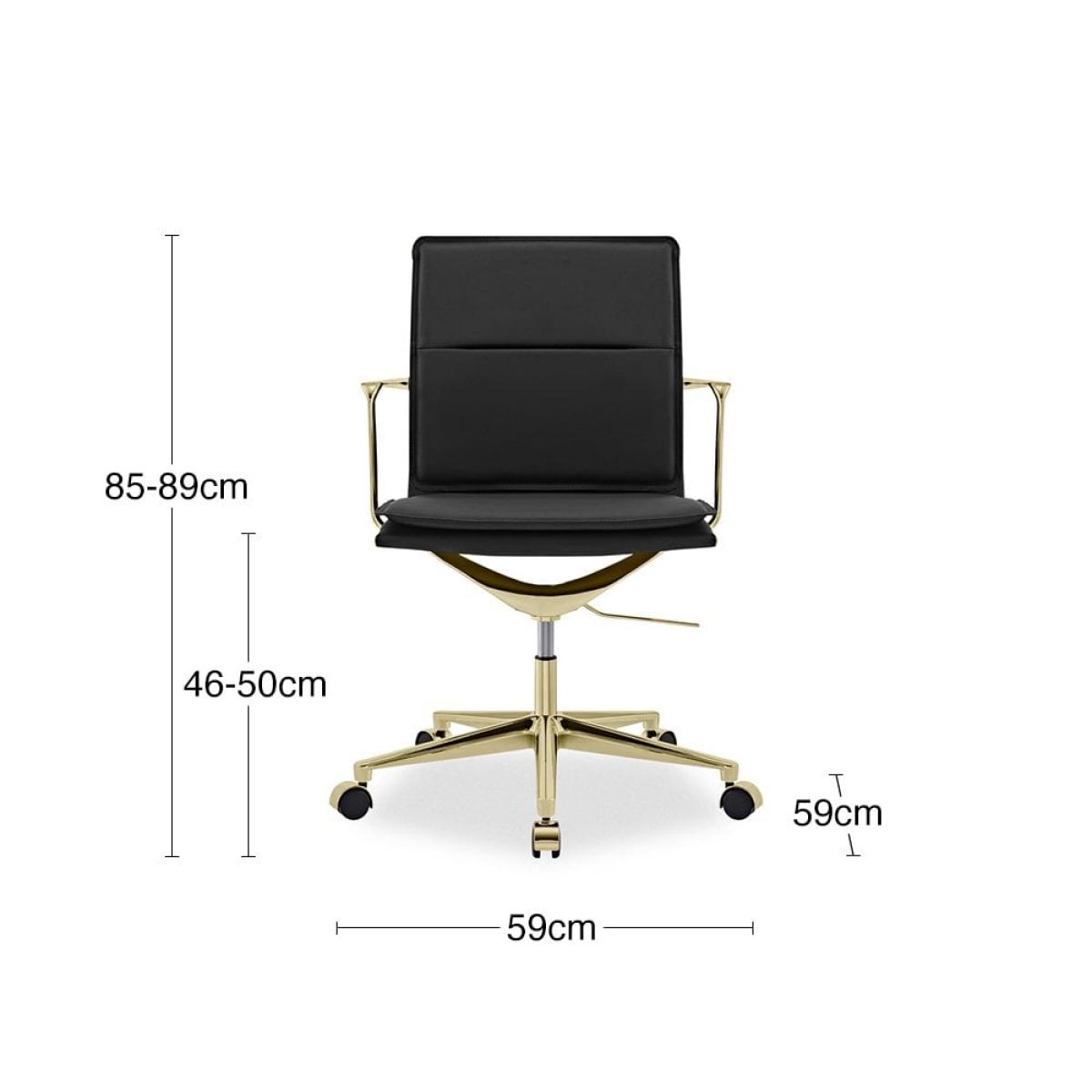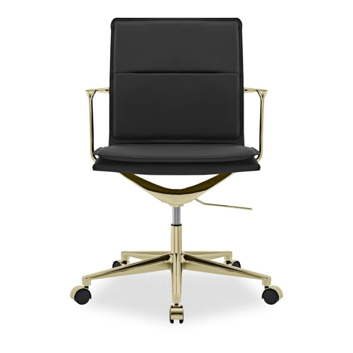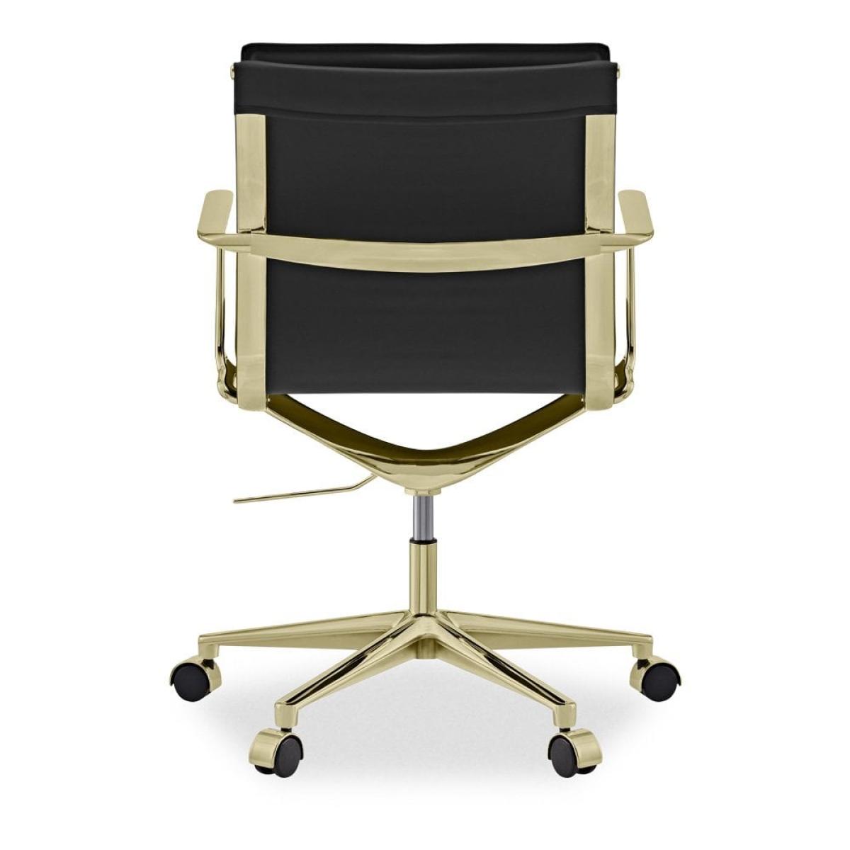 This is the Bria Office Chair; built with productivity in mind. The padded faux leather seat and low backrest in a sleek black hue sits within a sturdy, height-adjustable shiny brass metal frame on wheels, making it easy for you to move and swivel throughout the day; the perfect contemporary vibe to your home office.