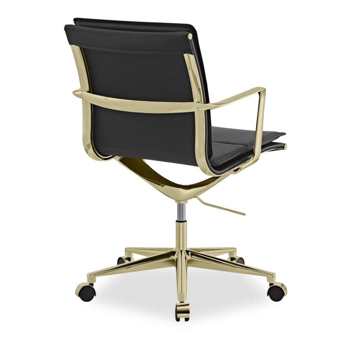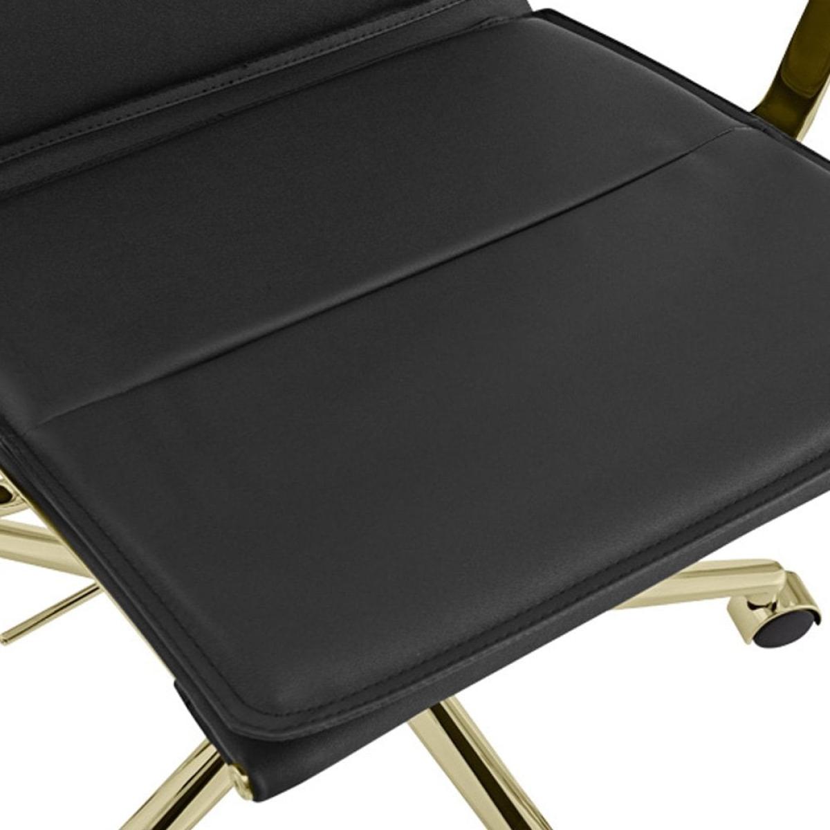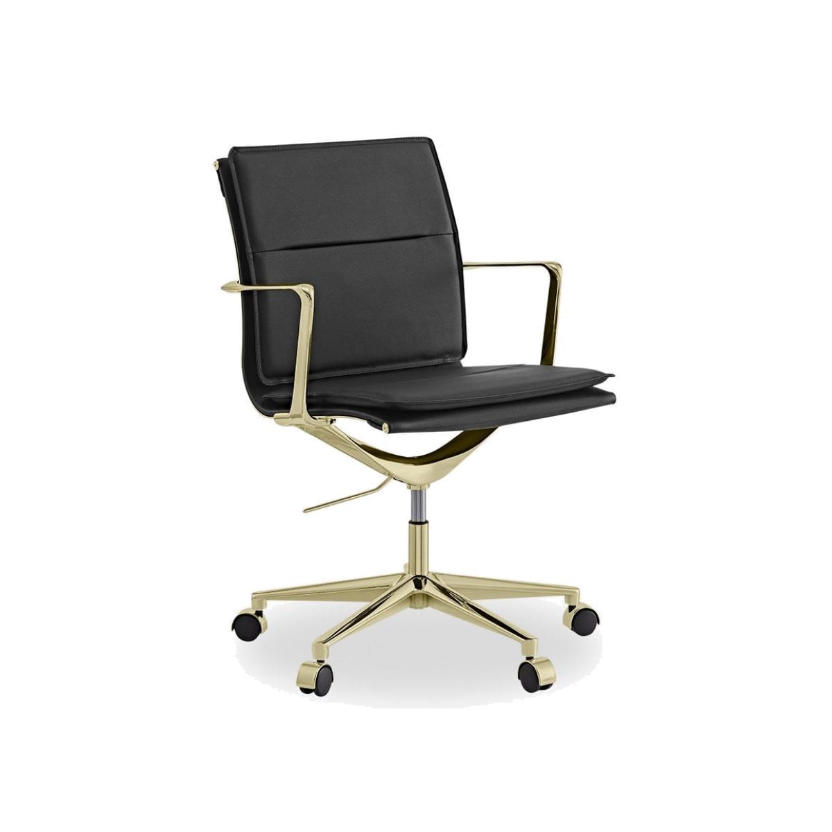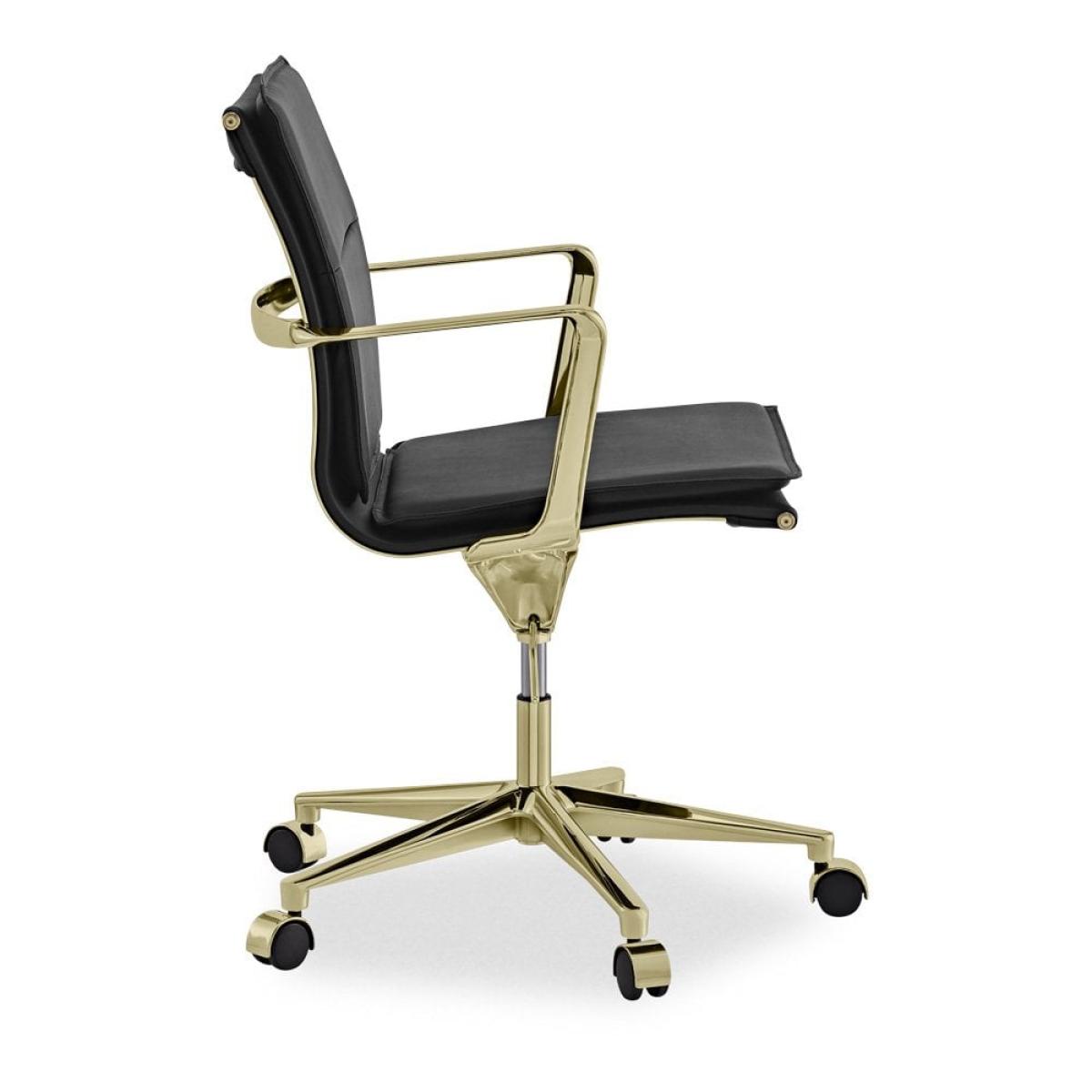 This is the Bria Office Chair; built with productivity in mind. The padded faux leather seat and low backrest in a sleek black hue sits within a sturdy, height-adjustable shiny brass metal frame on wheels, making it easy for you to move and swivel throughout the day; the perfect contemporary vibe to your home office.