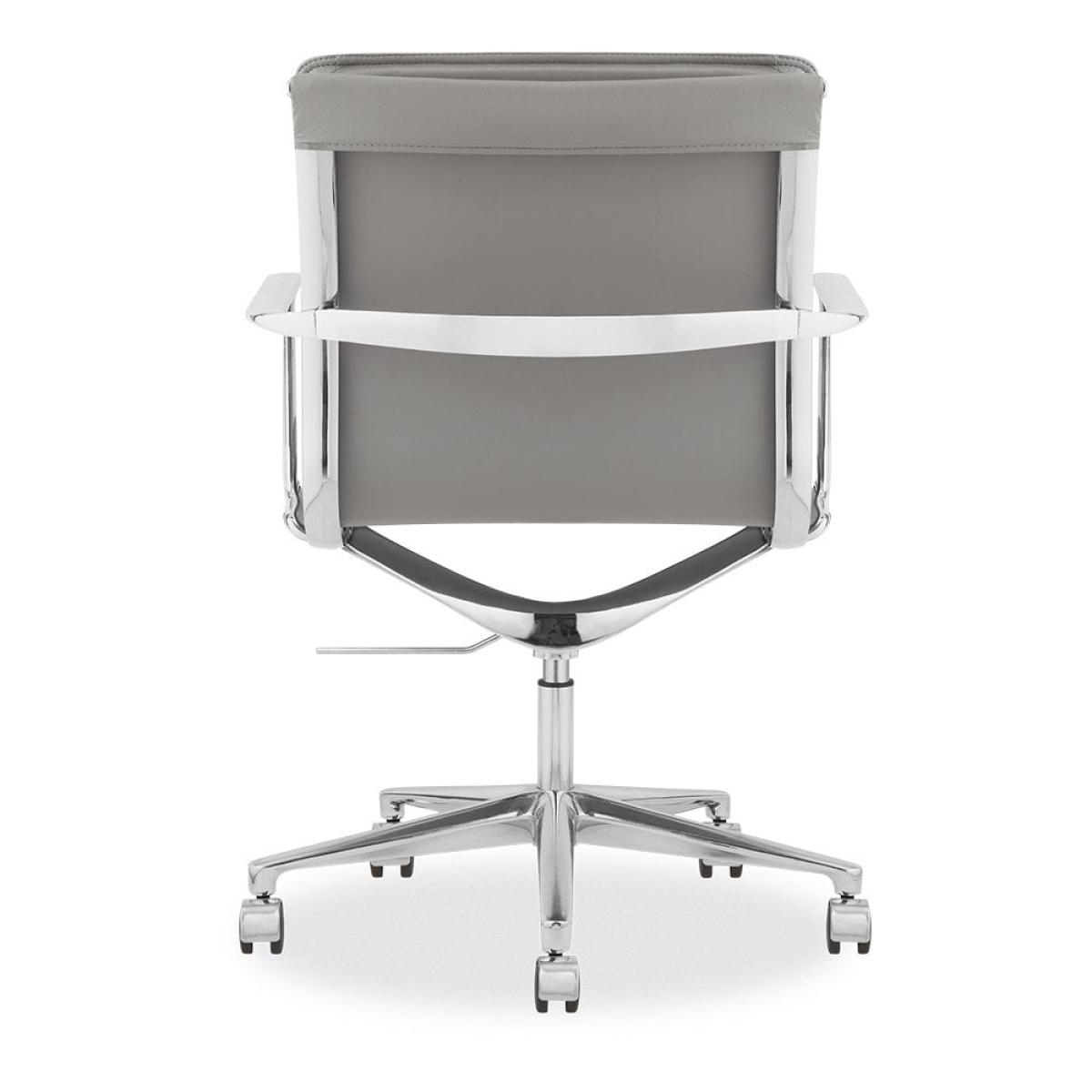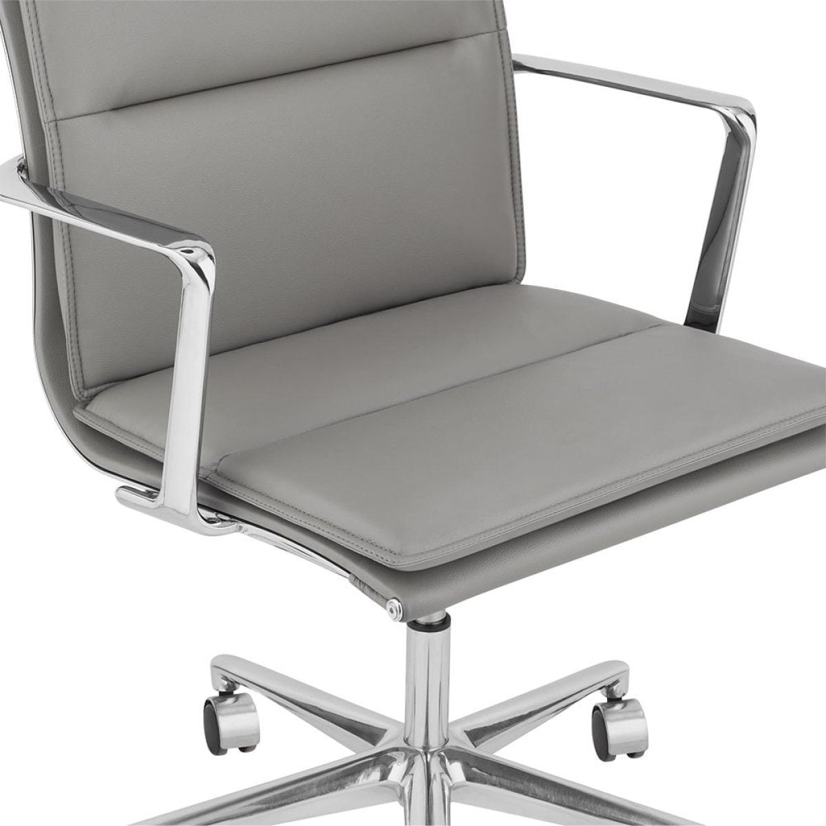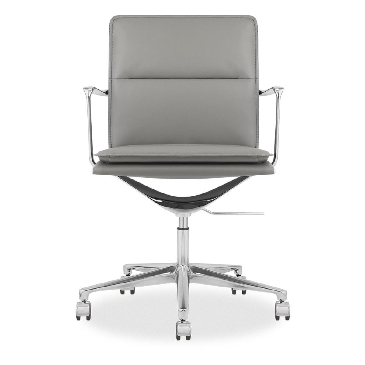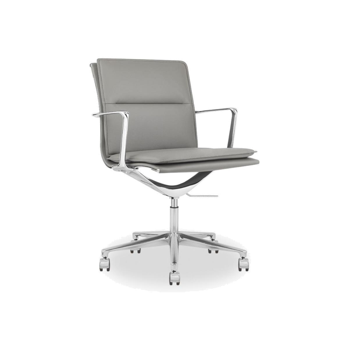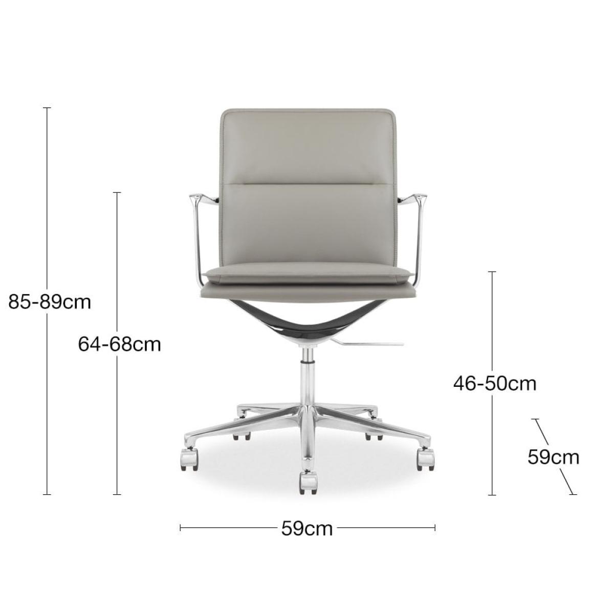 This is the Bria Office Chair; built with productivity in mind. The padded faux leather seat and low backrest in a cool grey hue sits within a sturdy, height-adjustable chrome metal frame on wheels, making it easy for you to move and swivel throughout the day; the perfect contemporary vibe to your home office.