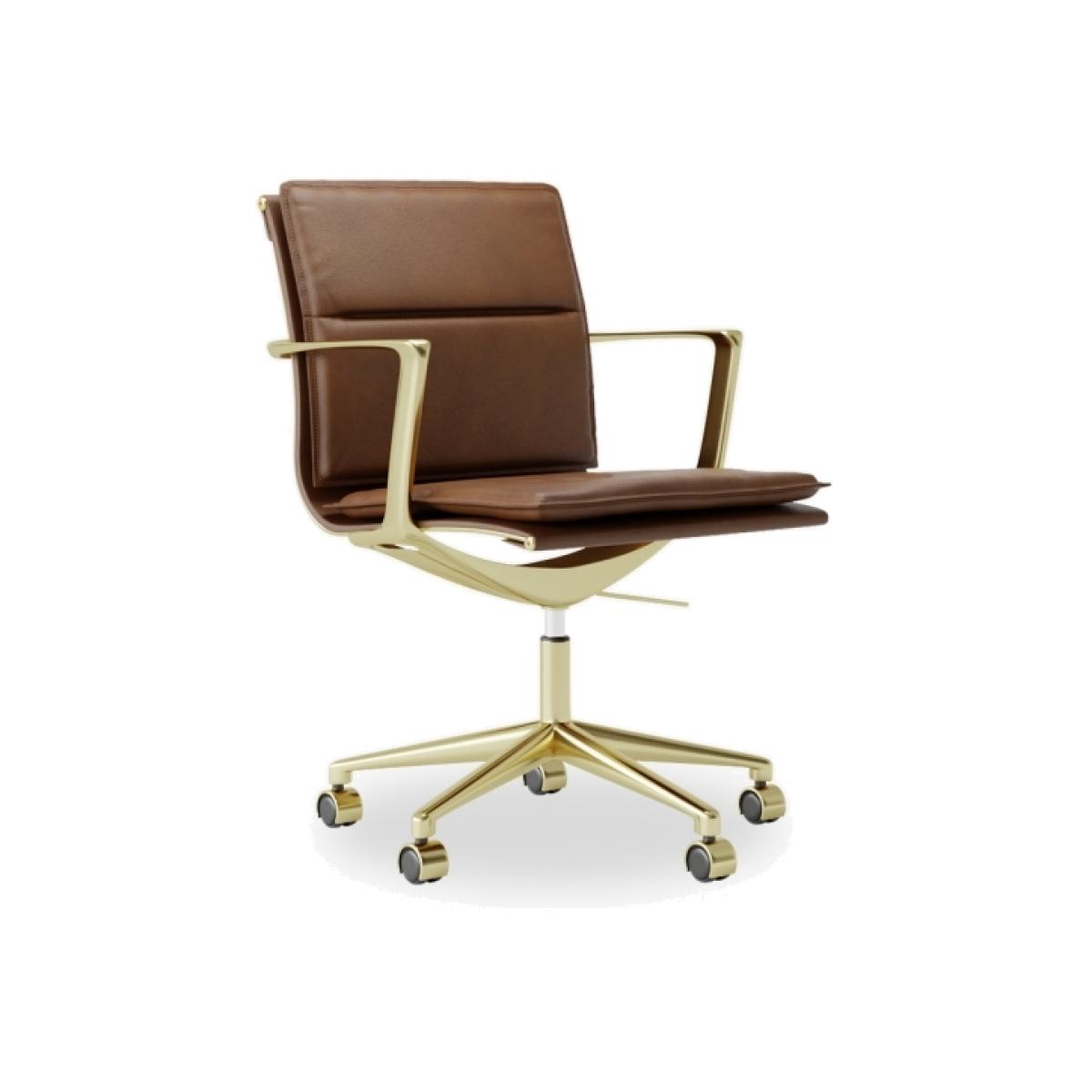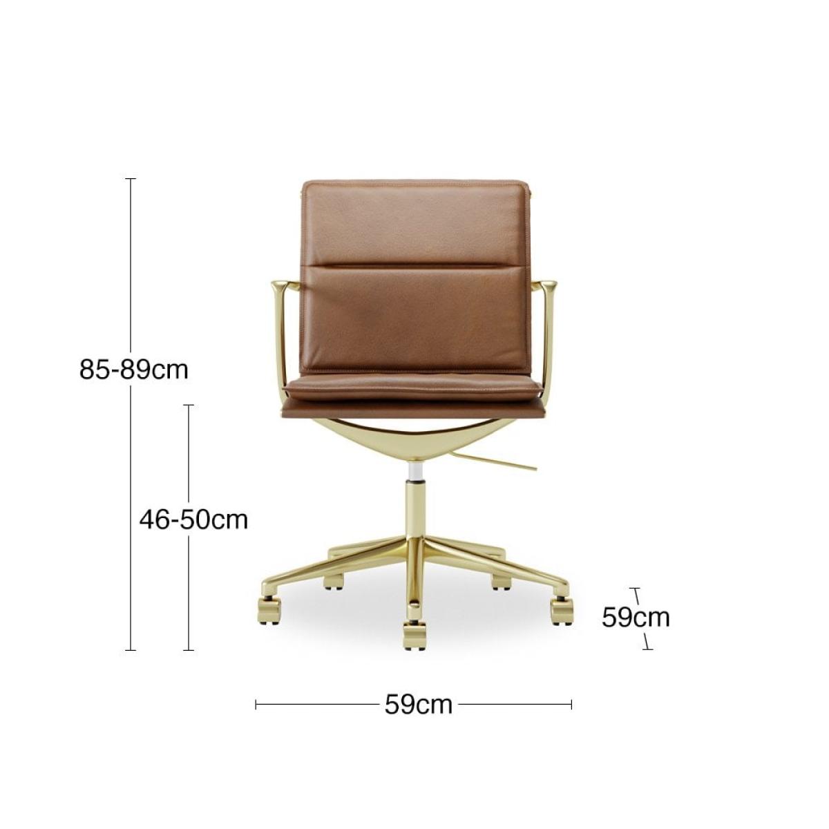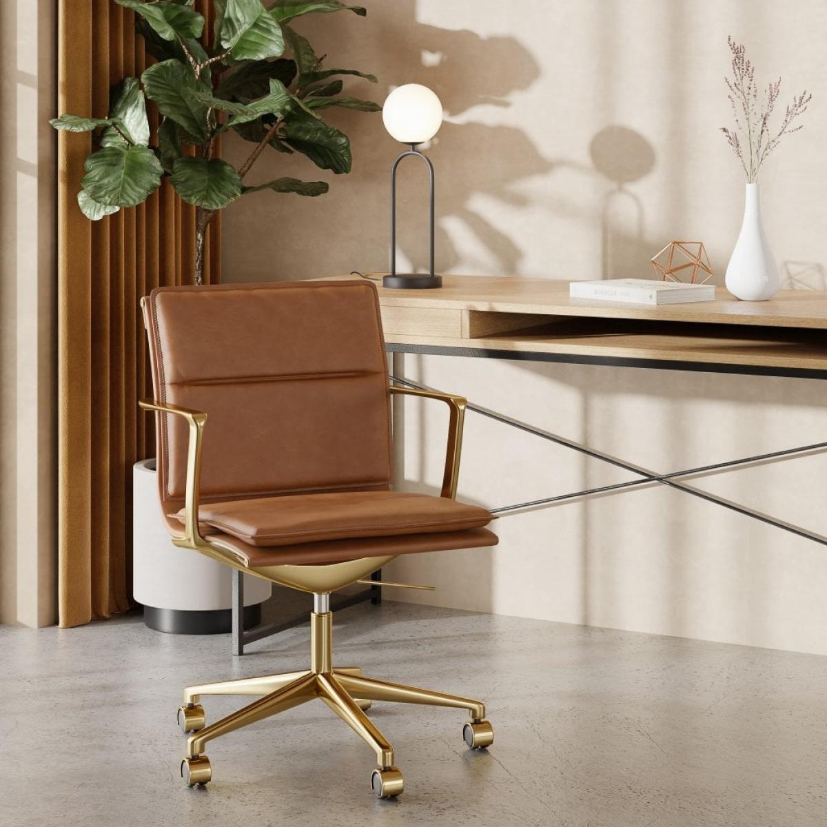 This is the Bria Office Chair; built with productivity in mind. The padded faux leather seat and low backrest in a vintage tan hue sits within a sturdy, height-adjustable brass metal frame on wheels, making it easy for you to move and swivel throughout the day; the perfect contemporary vibe to your home office.