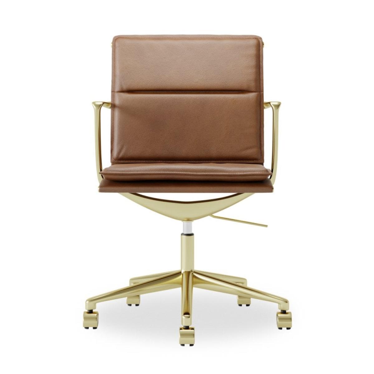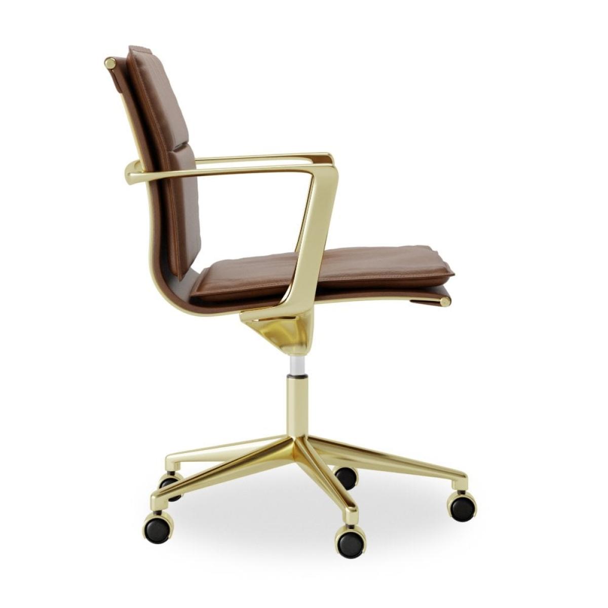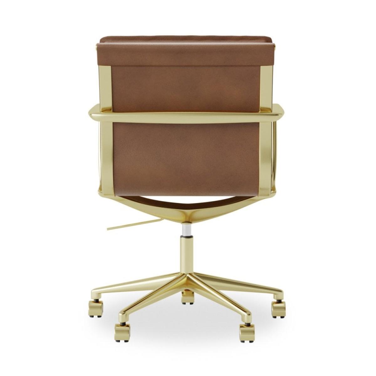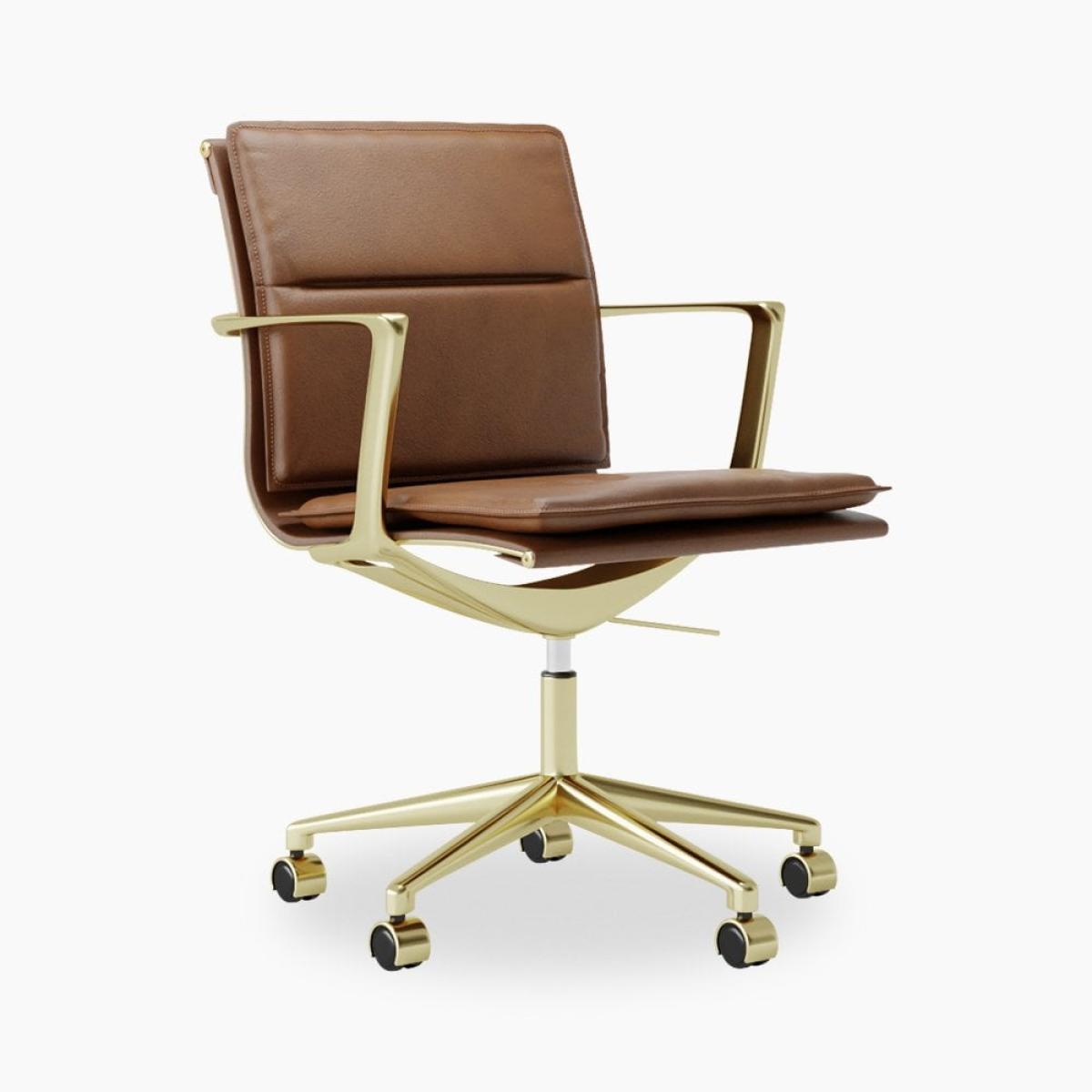 This is the Bria Office Chair; built with productivity in mind. The padded faux leather seat and low backrest in a vintage tan hue sits within a sturdy, height-adjustable brass metal frame on wheels, making it easy for you to move and swivel throughout the day; the perfect contemporary vibe to your home office.