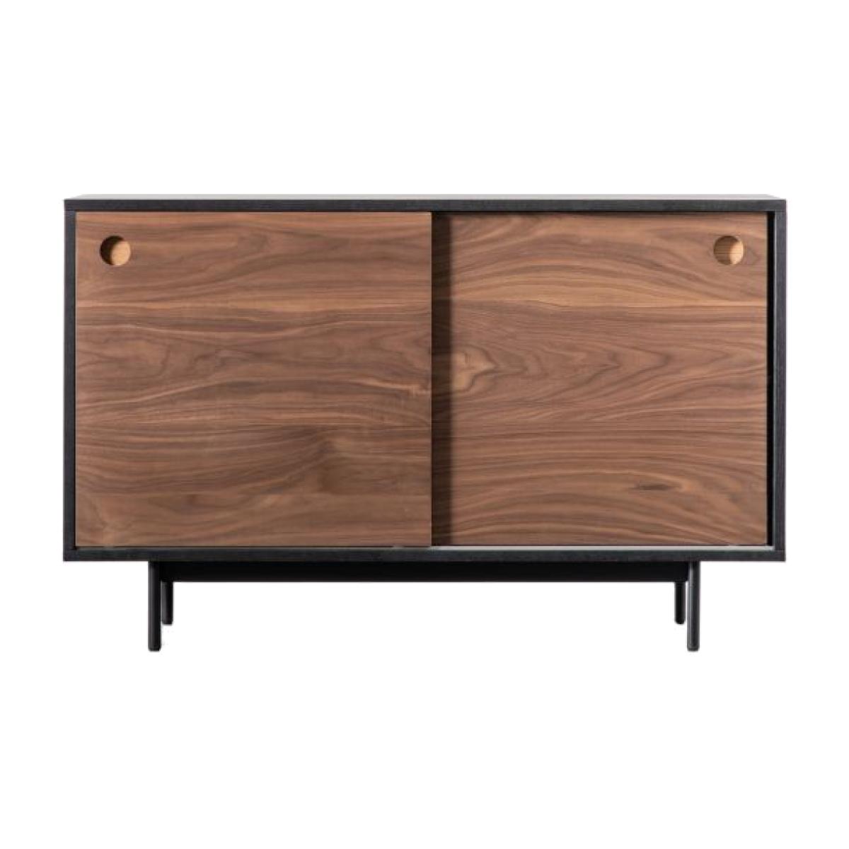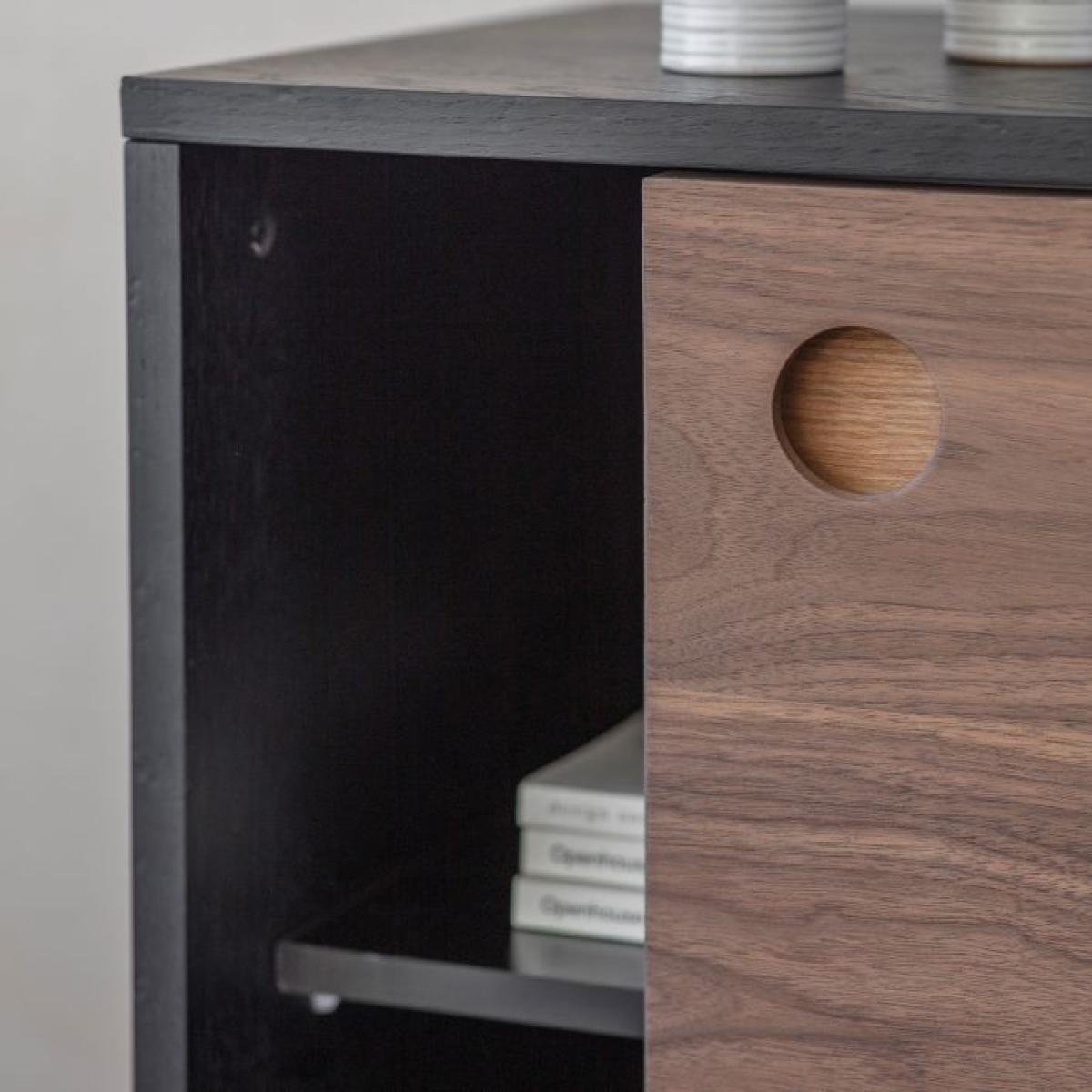 This eye-catching 2 door cabinet combines oak stained in a black finish and walnut veneers with black metal legs to create a stunning contemporary look. Cut out circular handles with a wood panel behind add an interesting and unusual design feature. The doors slide to open and each cupboard has an adjustable shelf for added practicality. It is part of a collection which offers a selection of cabinet pieces, is part of our Packed-Flat Design Project, offering easy delivery to any room in any property, whilst reducing the packaging needed. Assembly is required, but all the tools needed are supplied. Material: Oak. Colour/Finish: Brown. Number of Doors: 2.