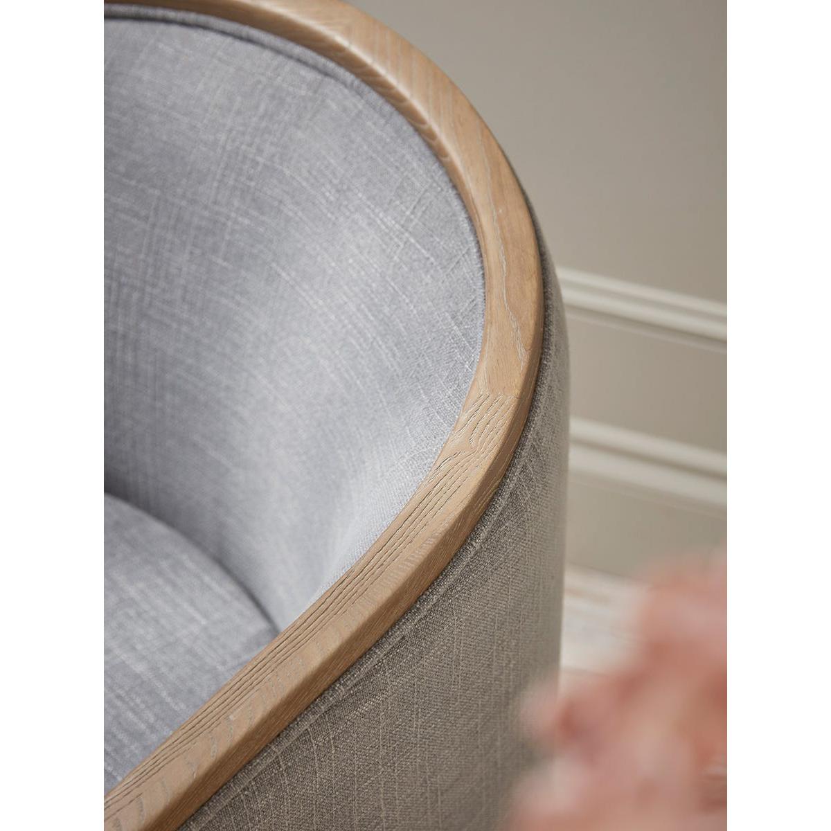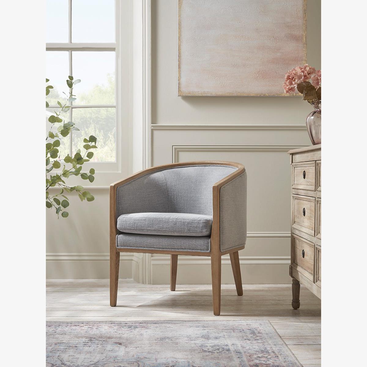 A simple shape is enhanced with a curved wooden frame in our Briar occasional chair. The slightly distressed warm wood gives a relaxed feel to a slightly more traditionally shaped armchair. The grey upholstery surrounds the chair for a unified and seamless look. radiating elegance, perfect for a vintage inspired interior.