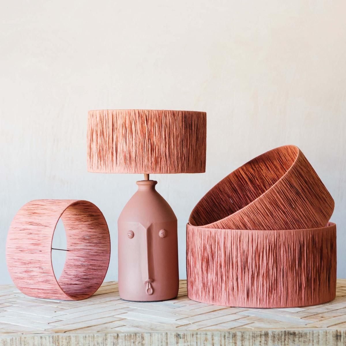 A classic drum shade handcrafted from natural raffia with a bold brick red finish, perfect for adding an organic texture to your space.