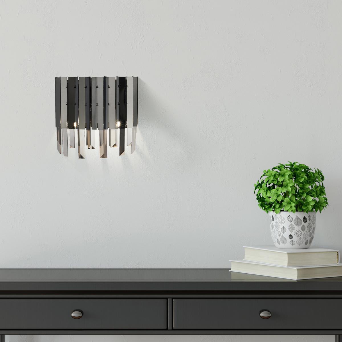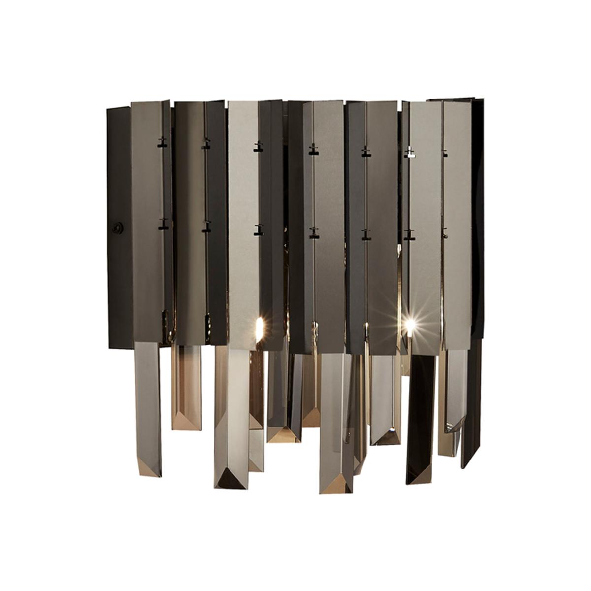 Update your interior with this striking 2 light wall light. The generous spread of lights provide a brightening glow to warm the entire room. A mix of metal, black chrome and smoked crystal drops cascade over the lights illuminating any room beautifully.