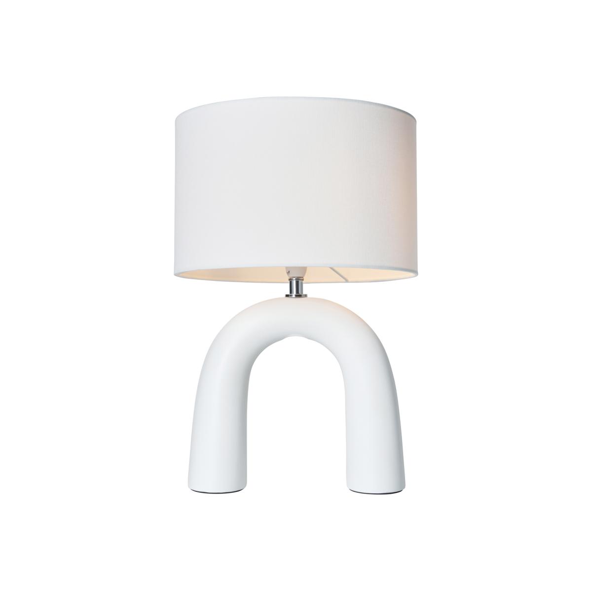 The Bridget Sculptural Table Lamp in white combines artistic design with soft lighting. Its modern sculptural arch-shaped base creates a striking point of visual interest, while the white shade diffuses warm ambient light. Perfect for bedside tables or desks, it adds style and comfort to any space.