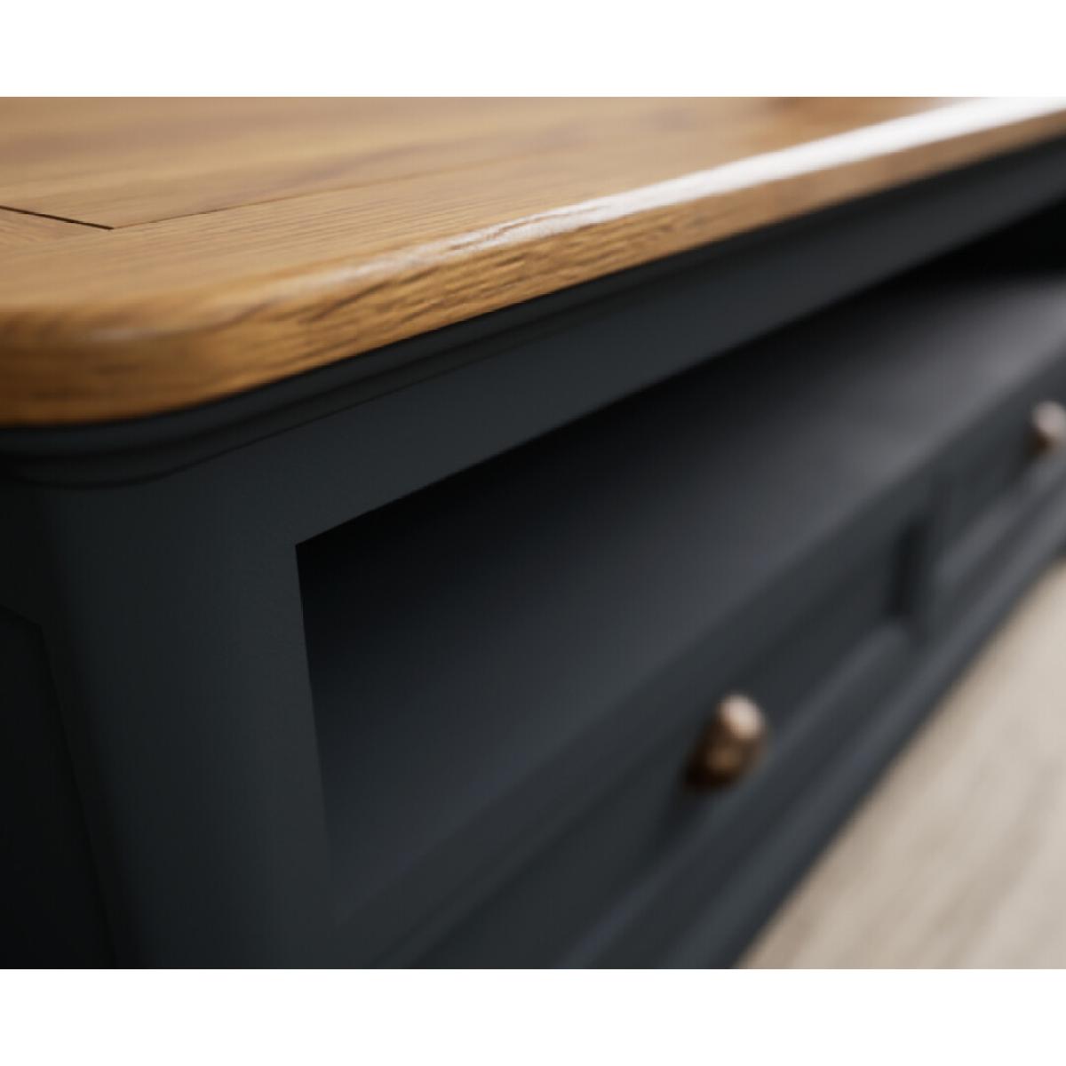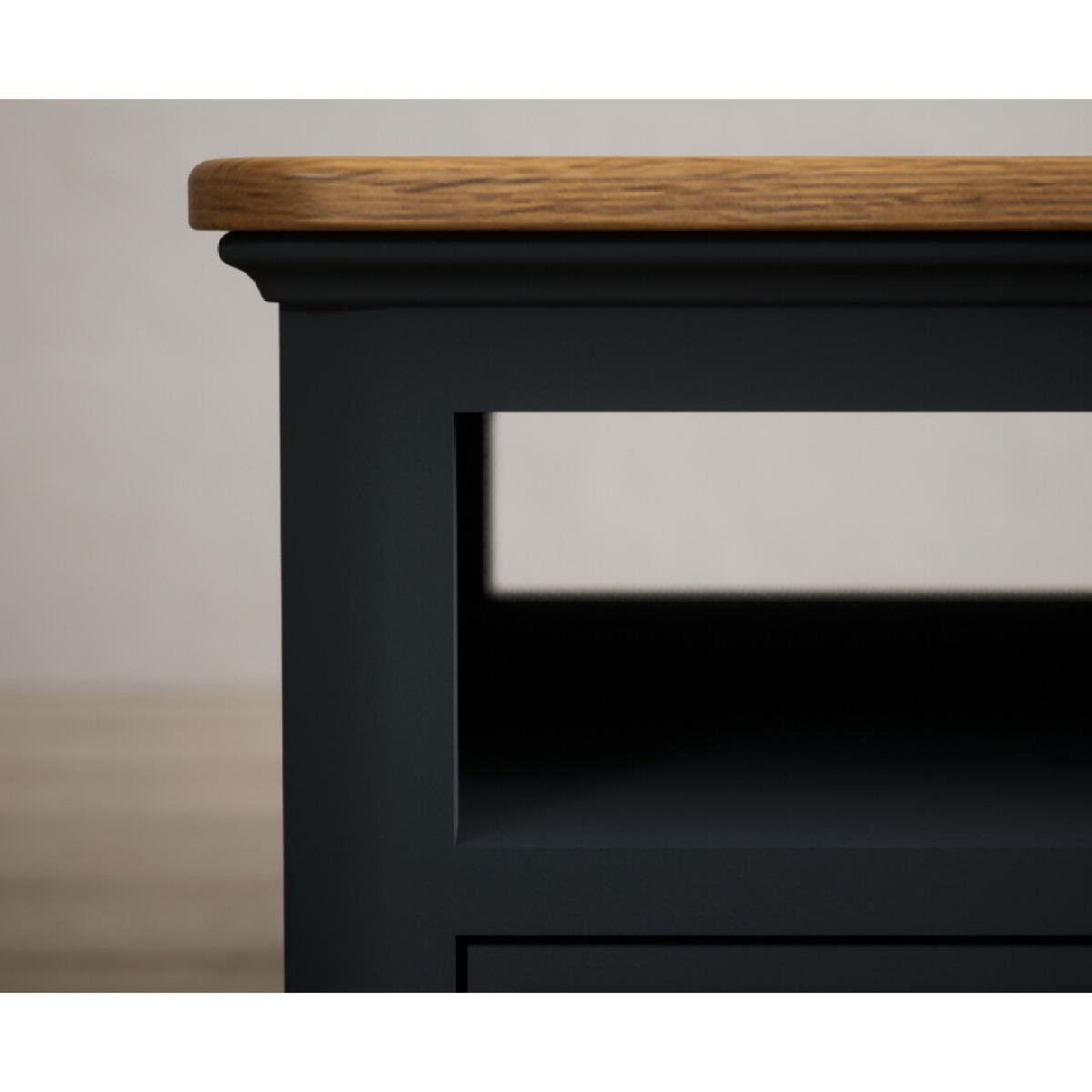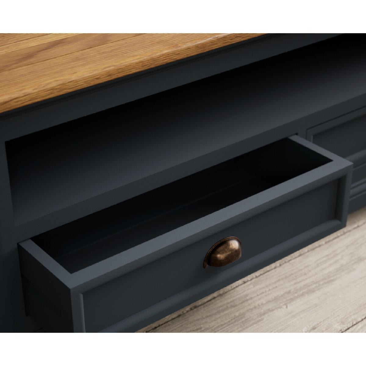 The Bridstow Blue 4 Drawer Coffee Table has been crafted from durable solid hardwood with a slate blue painted finish, topped with solid oak and complete with two drawers.
