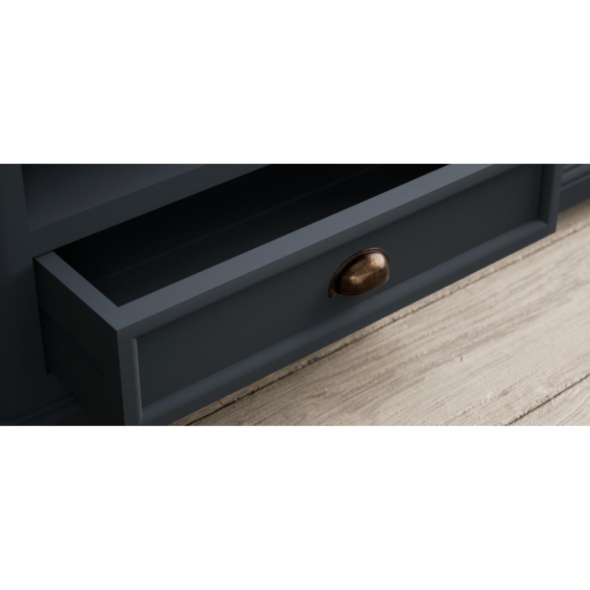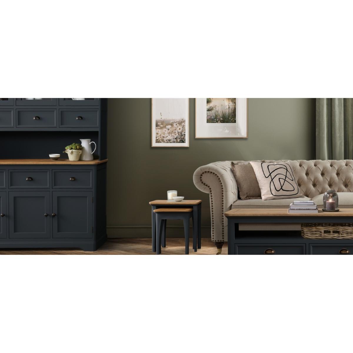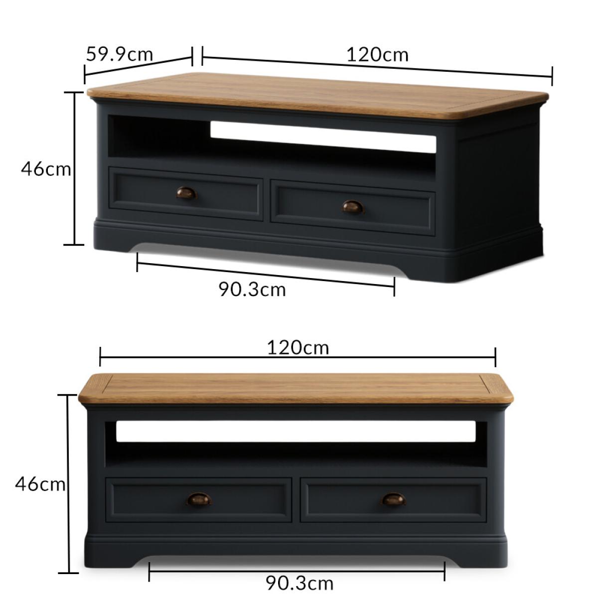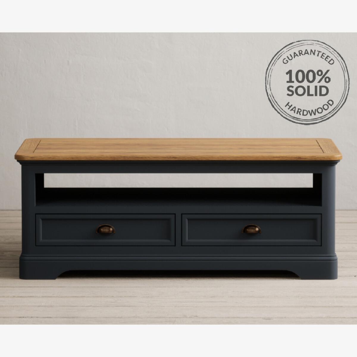 The Bridstow Blue 4 Drawer Coffee Table has been crafted from durable solid hardwood with a slate blue painted finish, topped with solid oak and complete with two drawers.