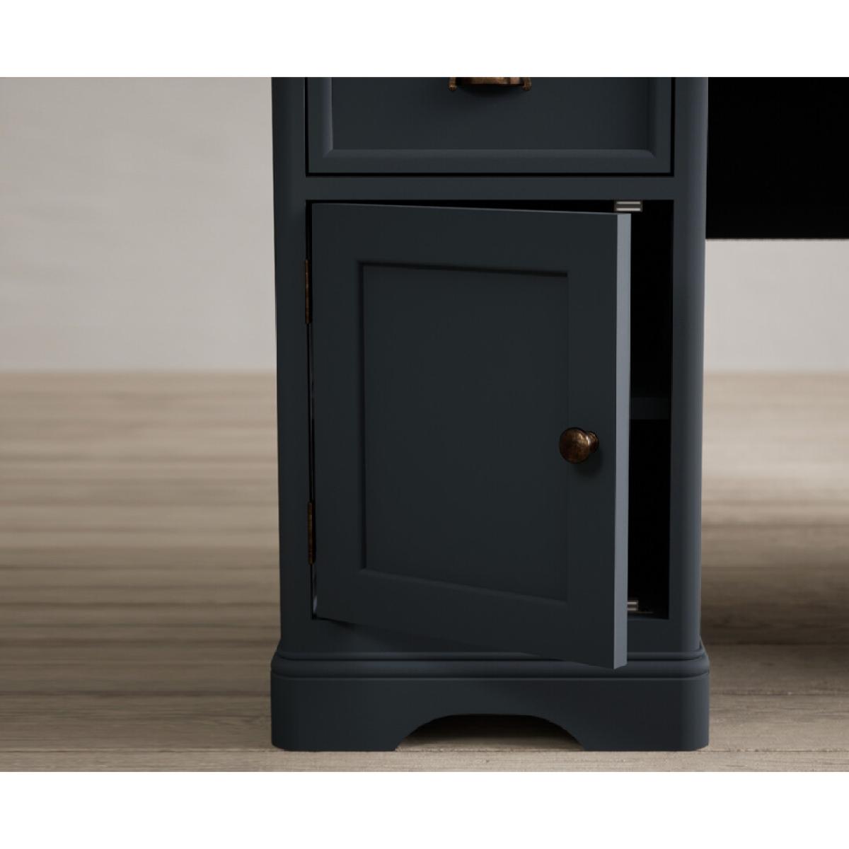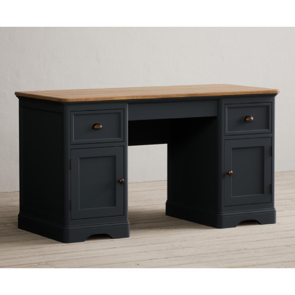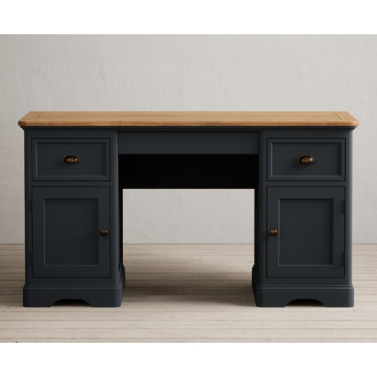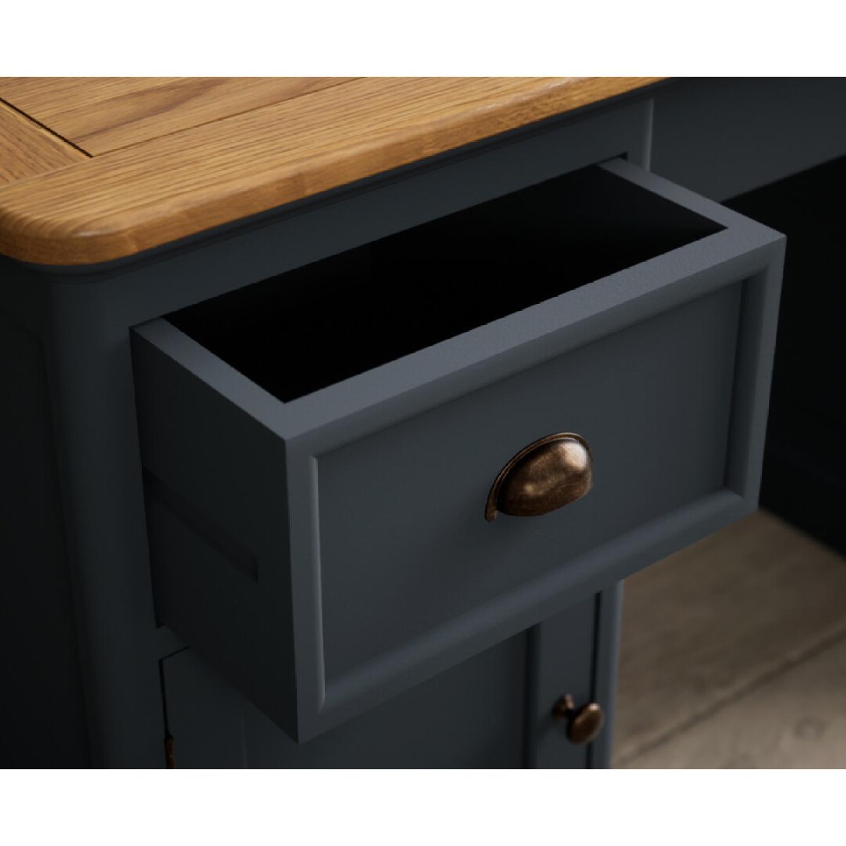 The Bridstow Blue Computer Desk is crafted from solid hardwood with a slate blue painted finish and topped with solid oak, with two cupboards and two Dovetail drawers.