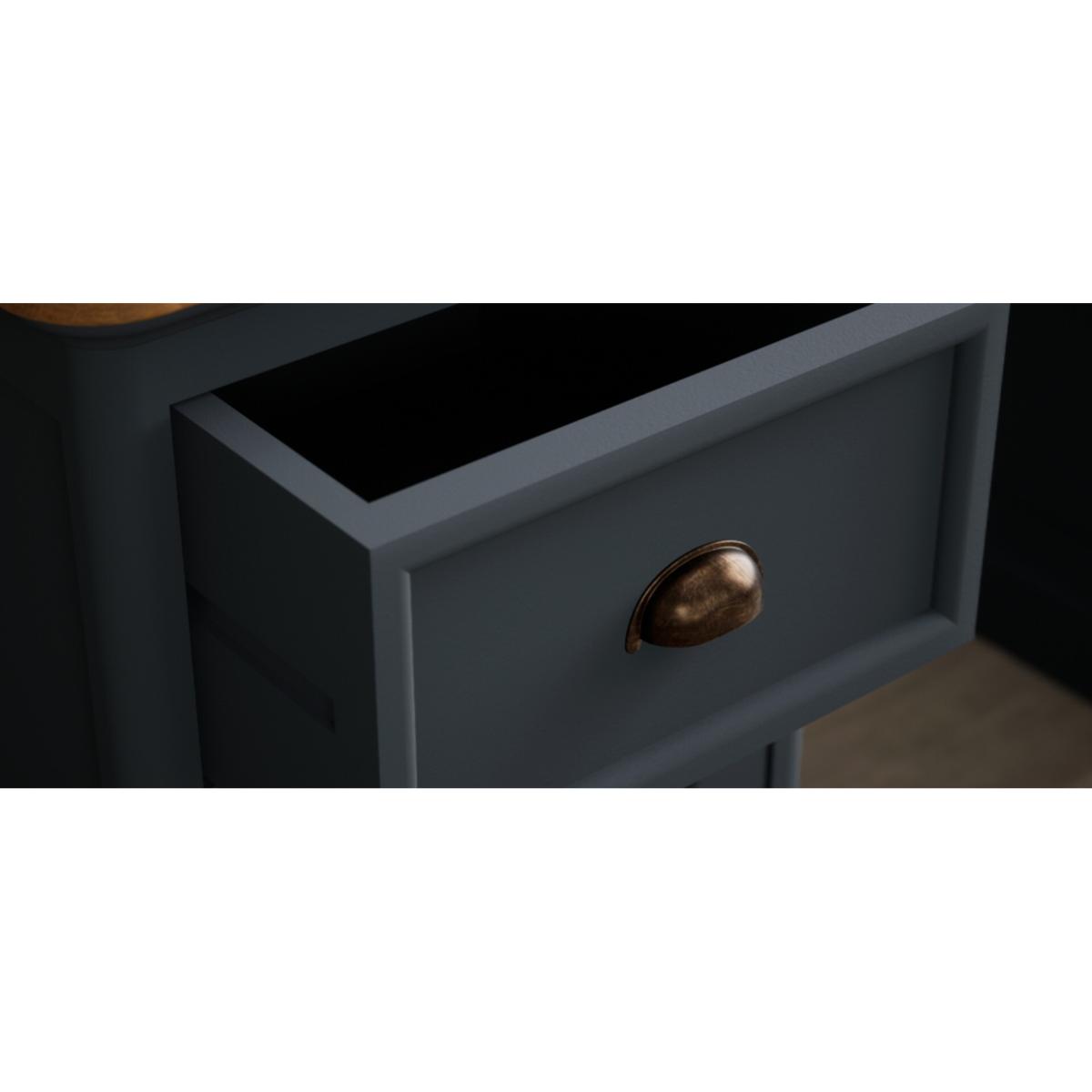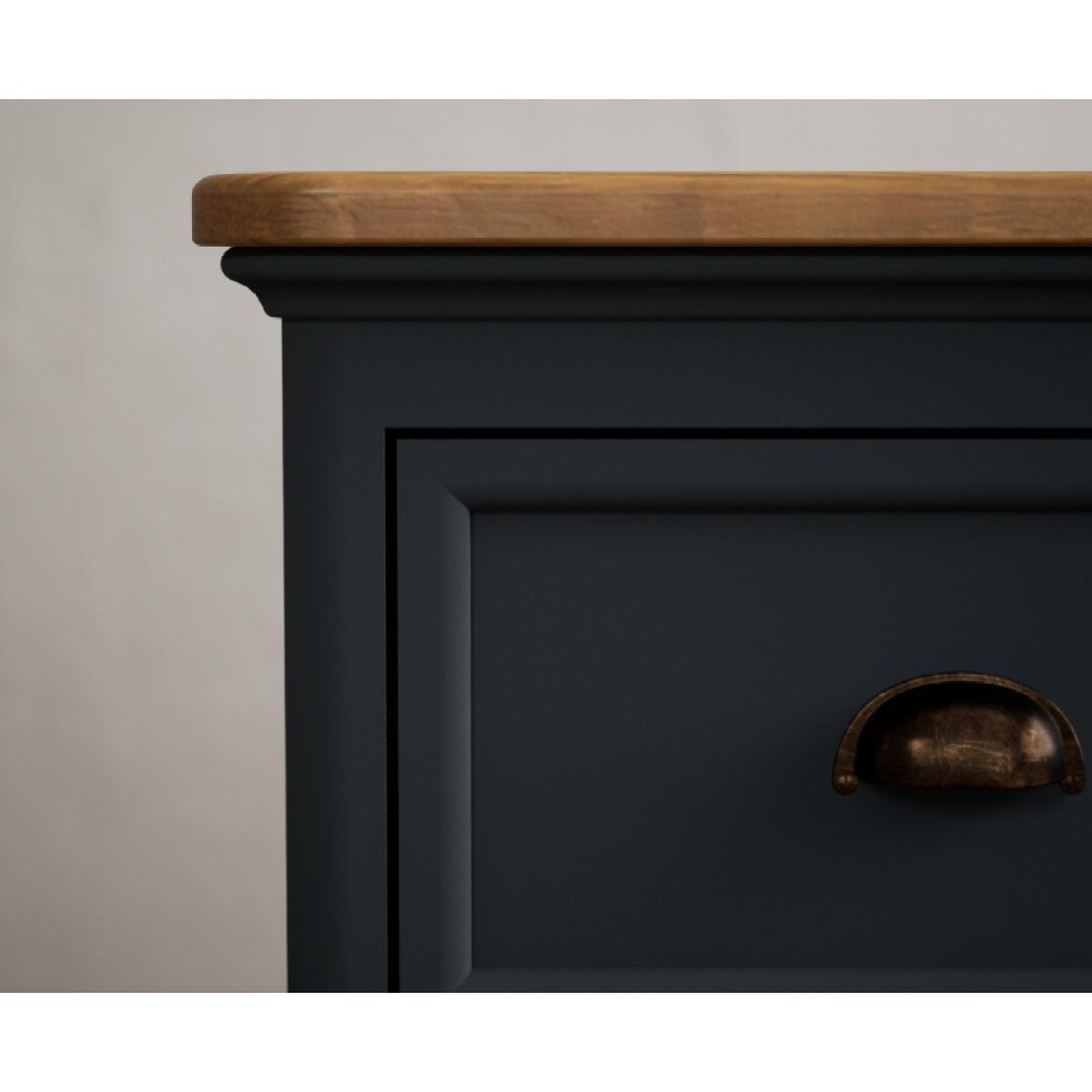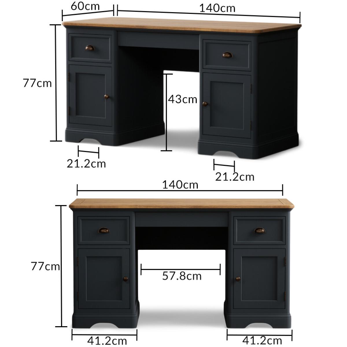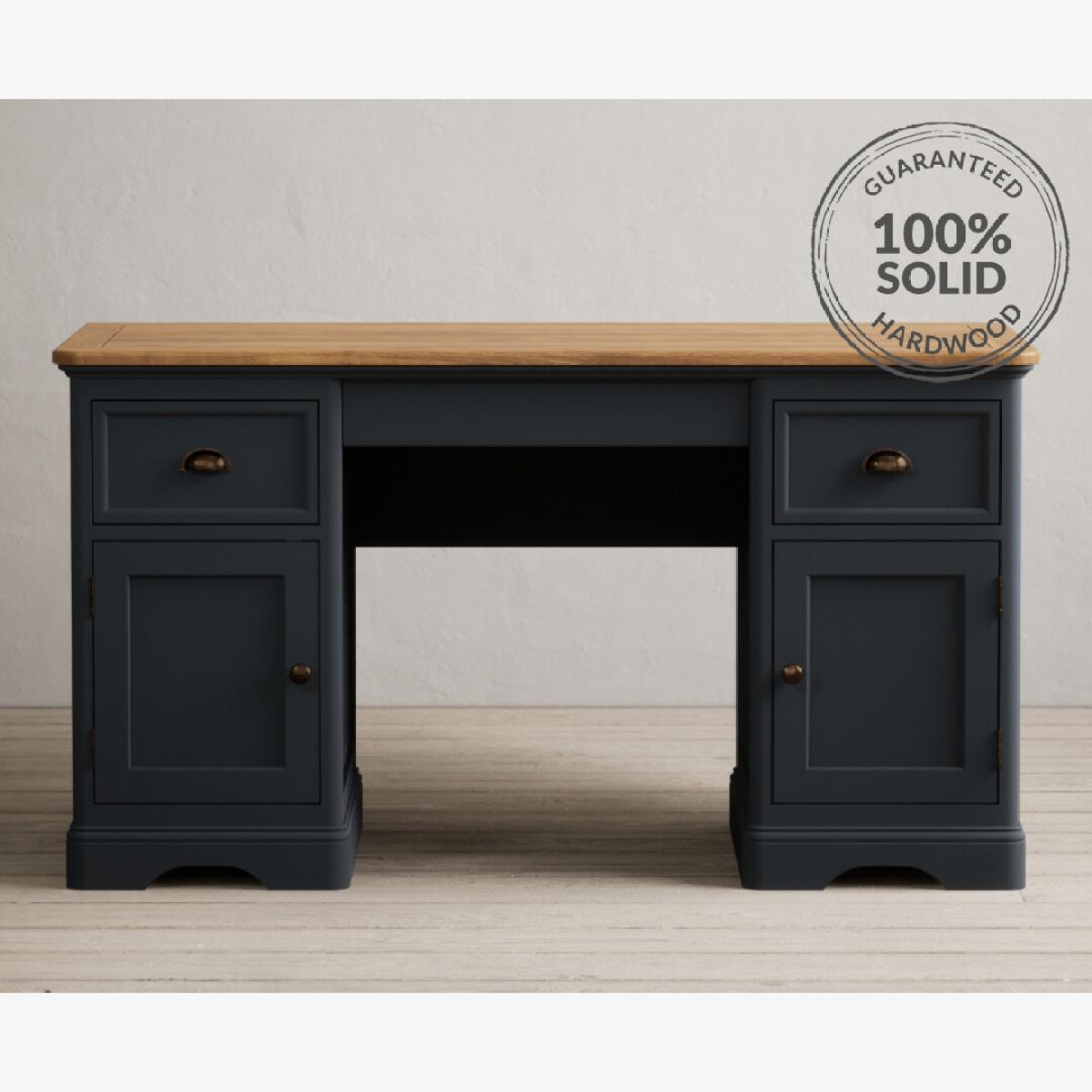 The Bridstow Blue Computer Desk is crafted from solid hardwood with a slate blue painted finish and topped with solid oak, with two cupboards and two Dovetail drawers.