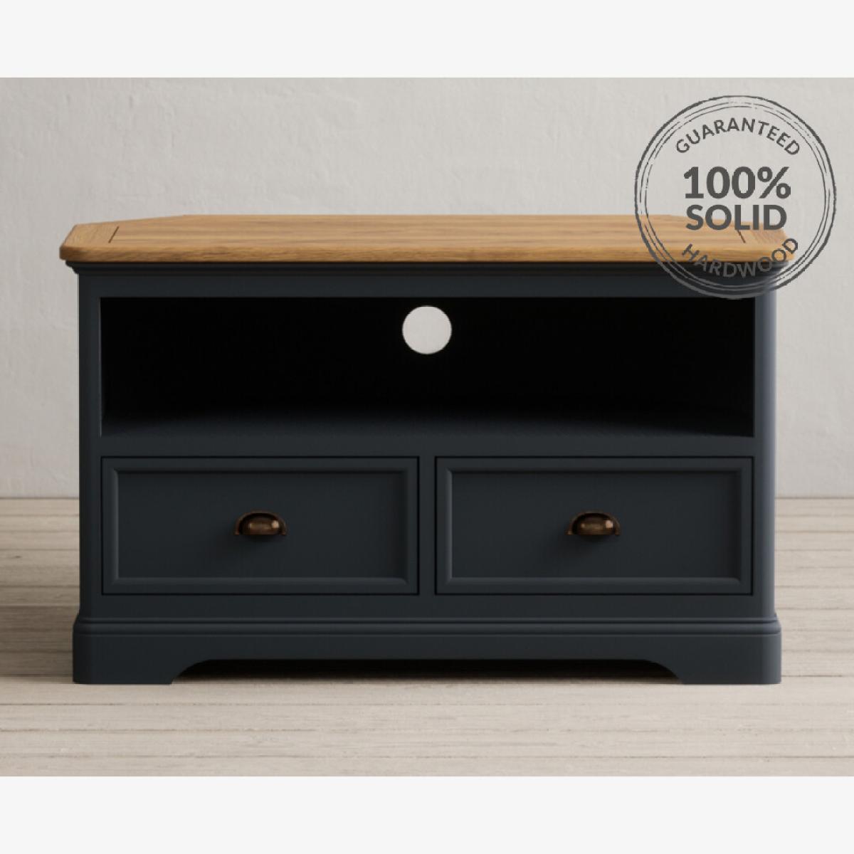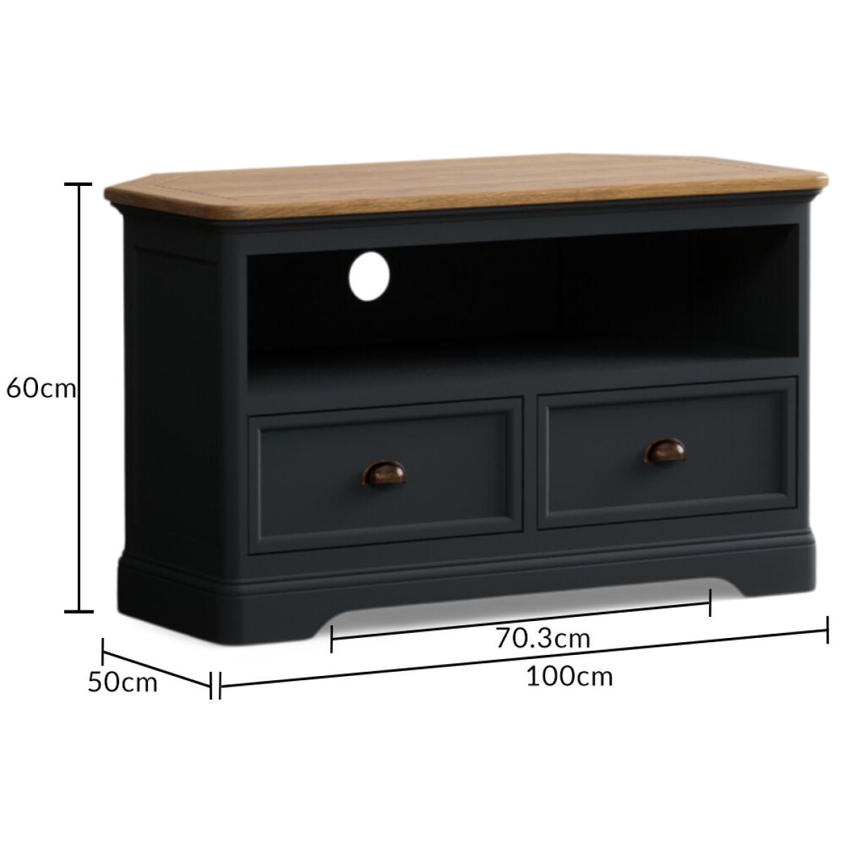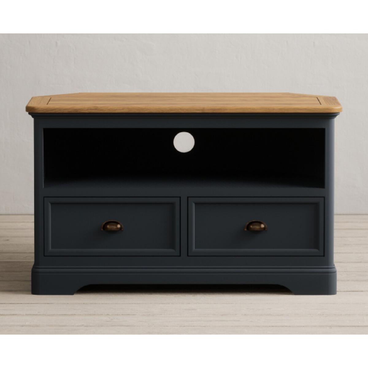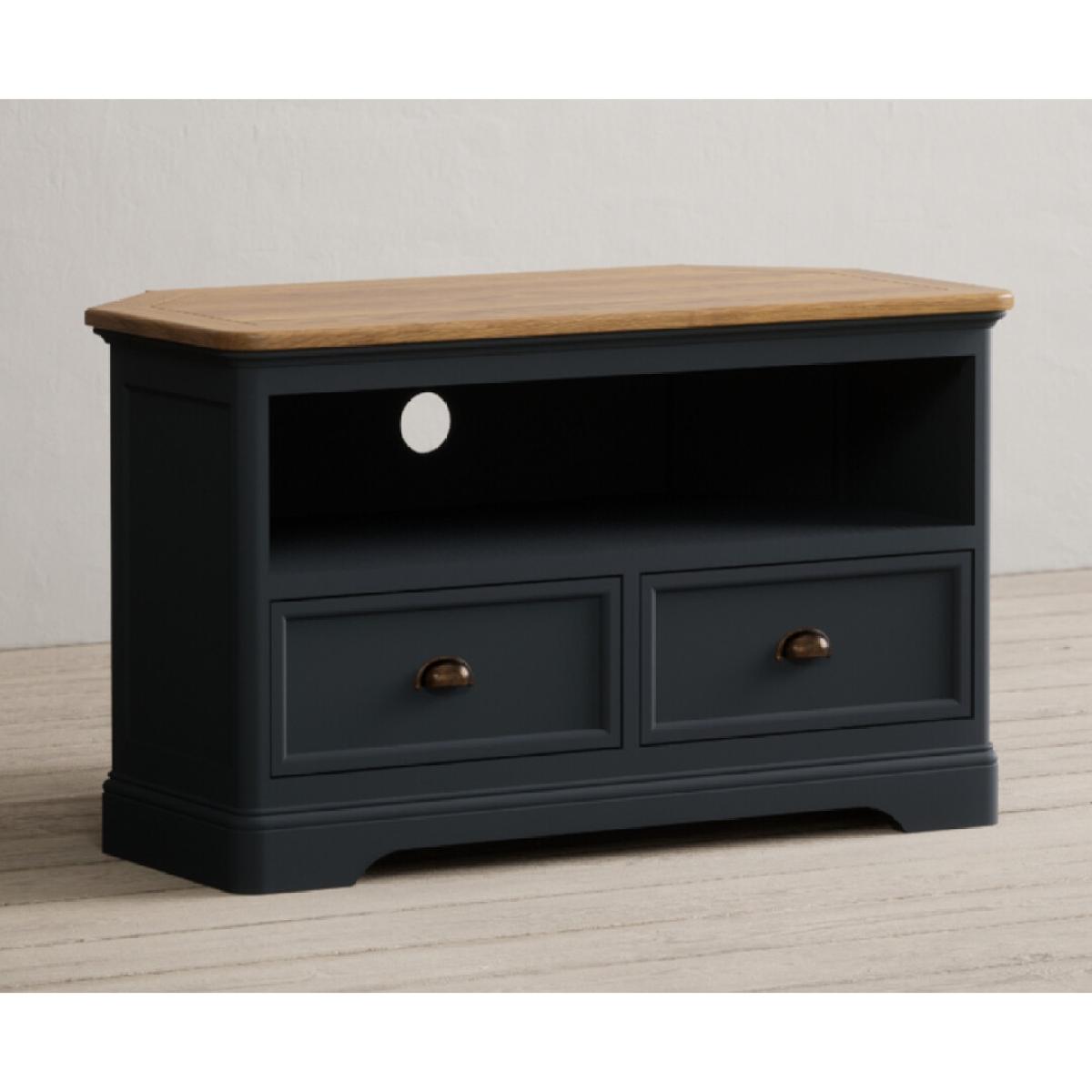 The Bridstow Blue Corner TV Cabinet is crafted from solid hardwood with a slate blue painted finish and topped with solid oak, complete with an open shelf, cable management hole and two drawers.
