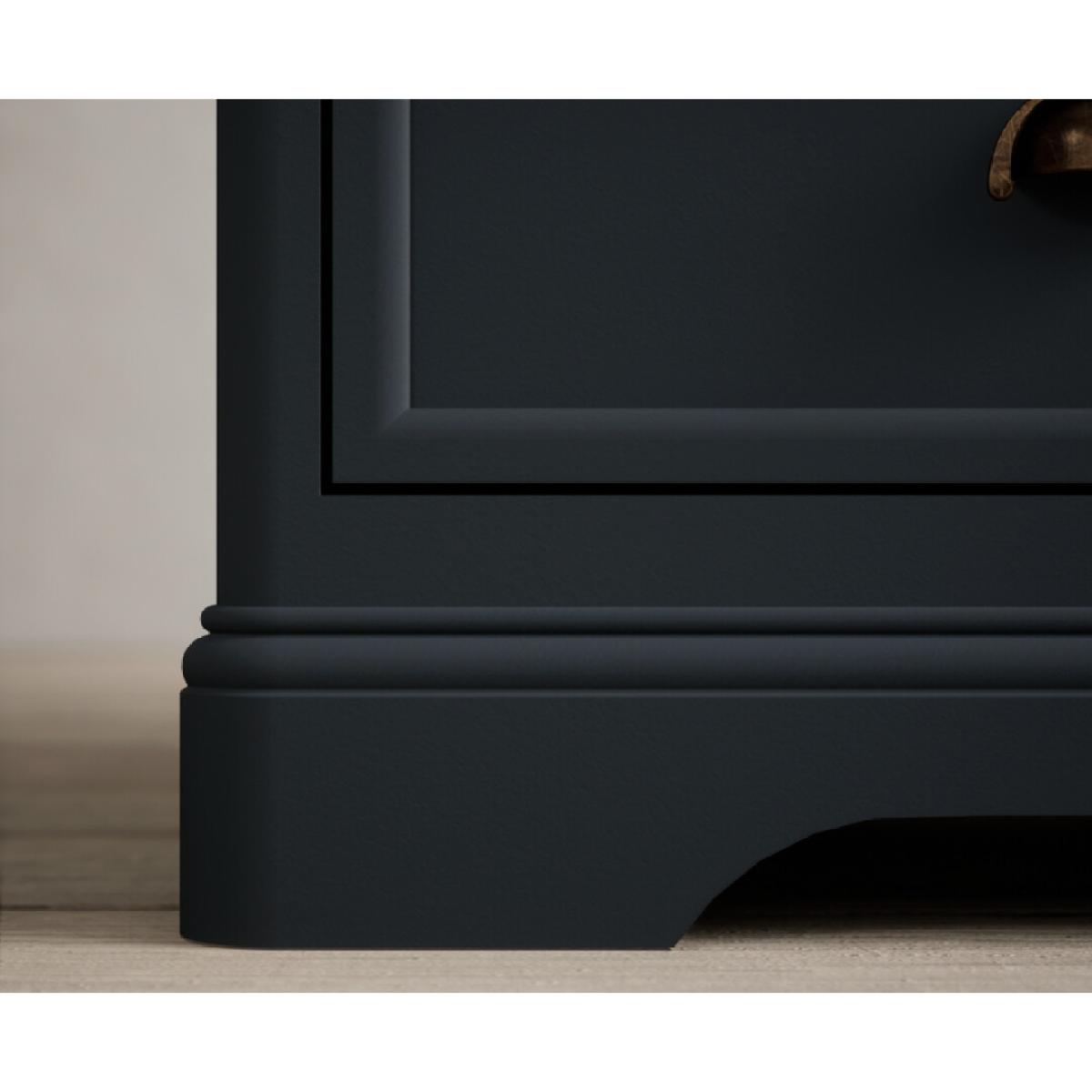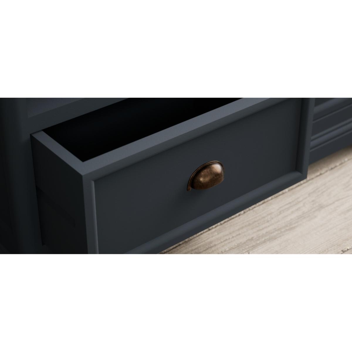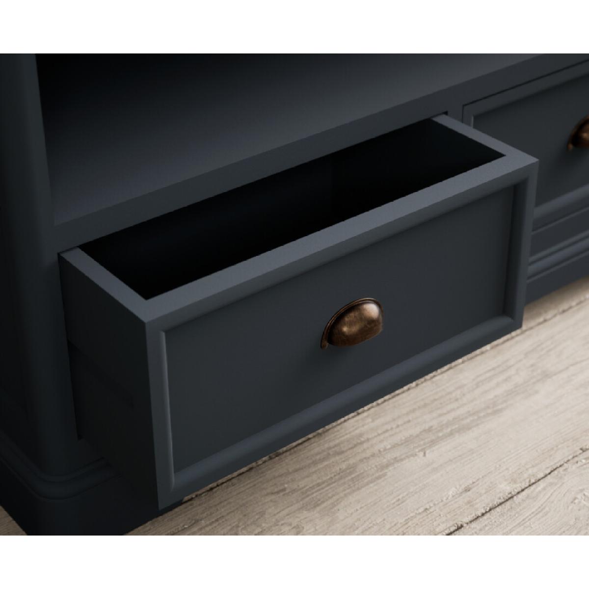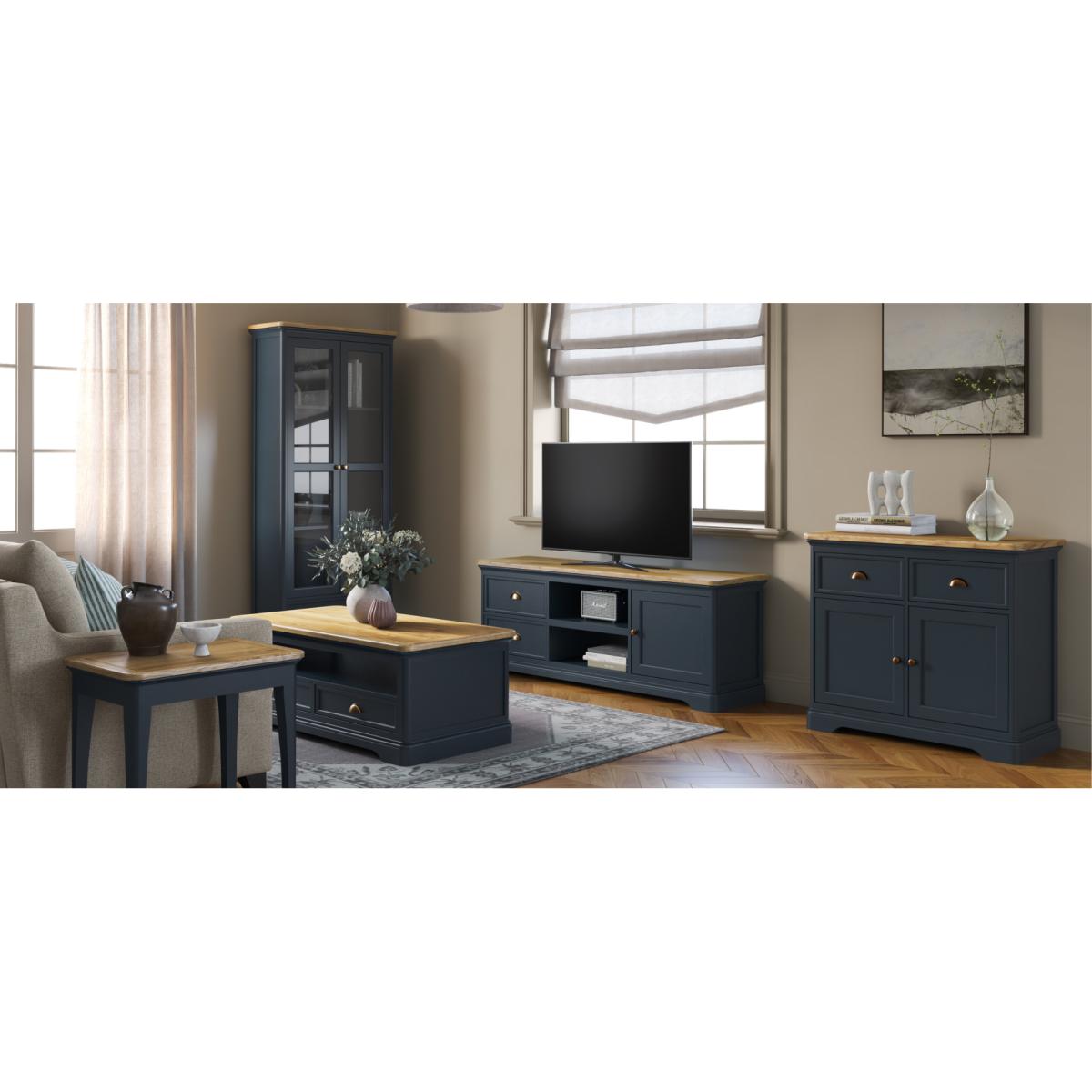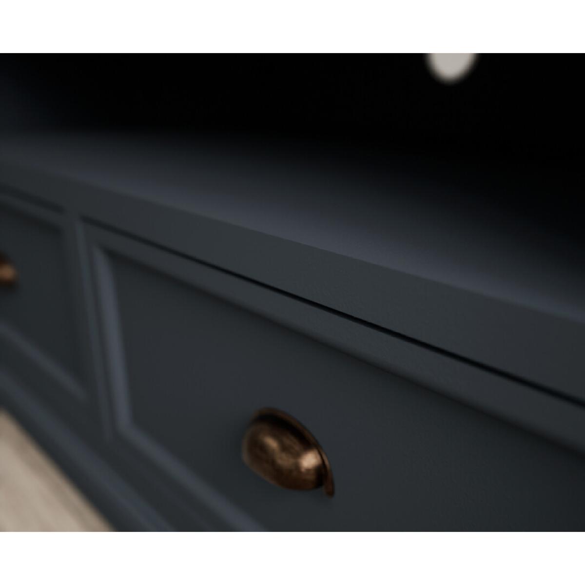 The Bridstow Blue Corner TV Cabinet is crafted from solid hardwood with a slate blue painted finish and topped with solid oak, complete with an open shelf, cable management hole and two drawers.