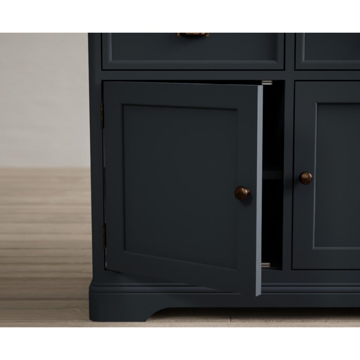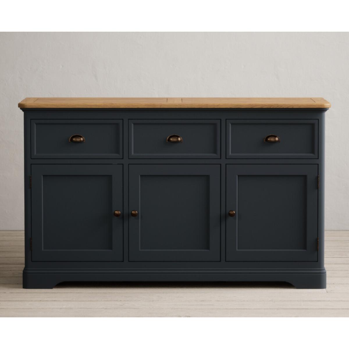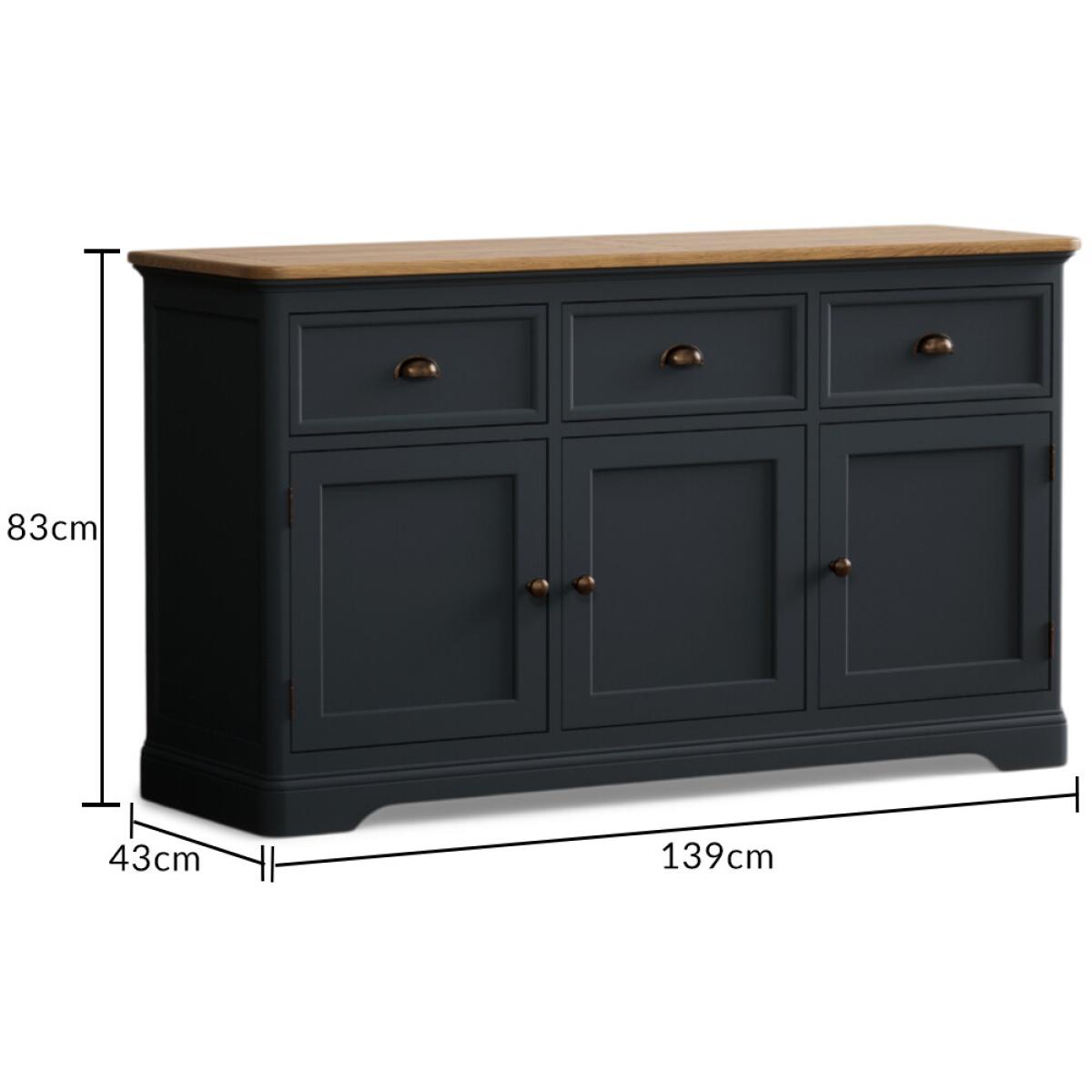 The Bridstow Blue Large Sideboard is crafted from solid hardwood with a slate blue painted finish, topped with solid oak and complete with cupboards and Dovetail drawers.