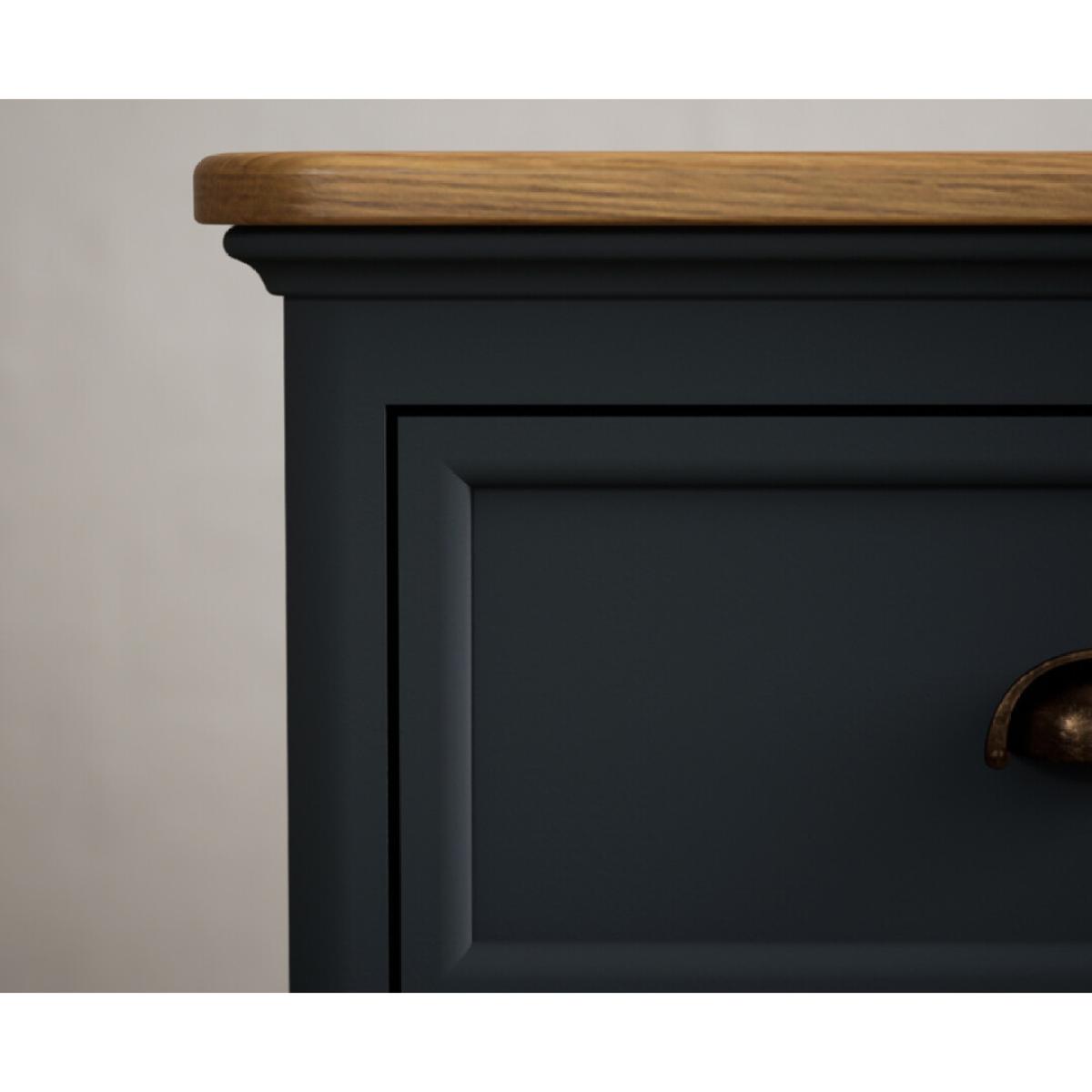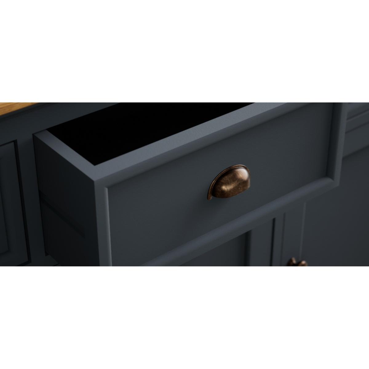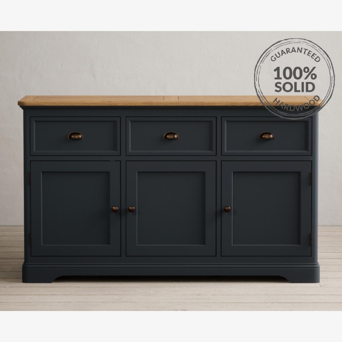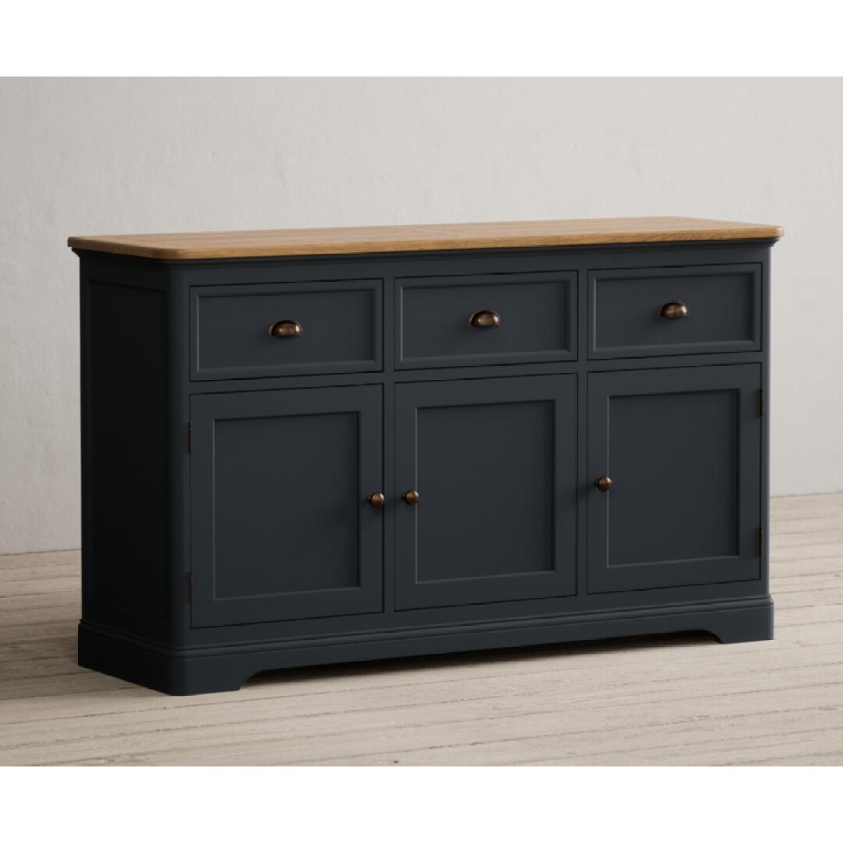 The Bridstow Blue Large Sideboard is crafted from solid hardwood with a slate blue painted finish, topped with solid oak and complete with cupboards and Dovetail drawers.