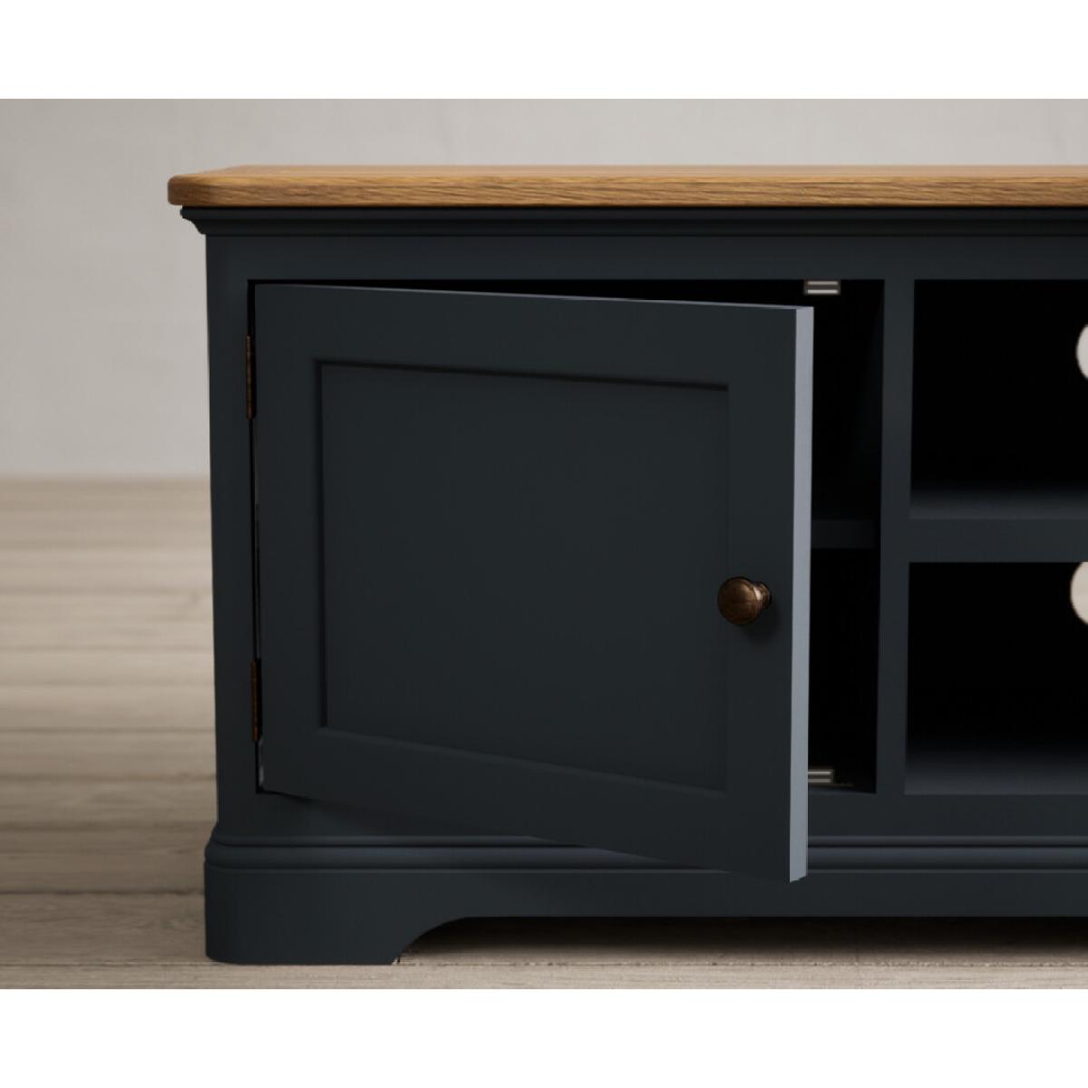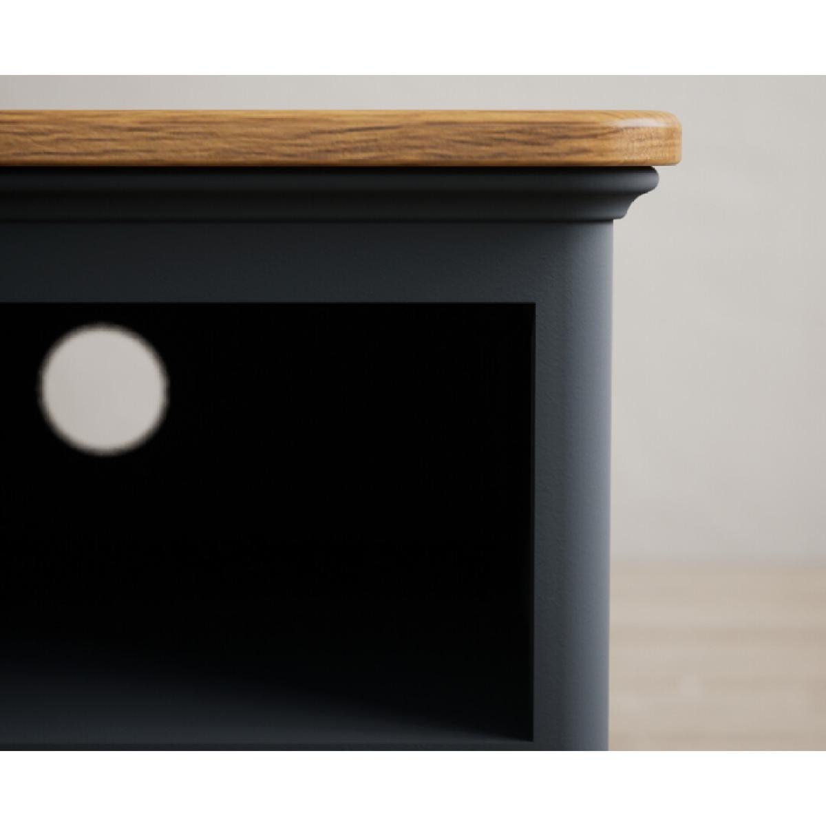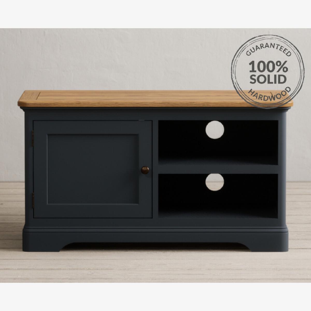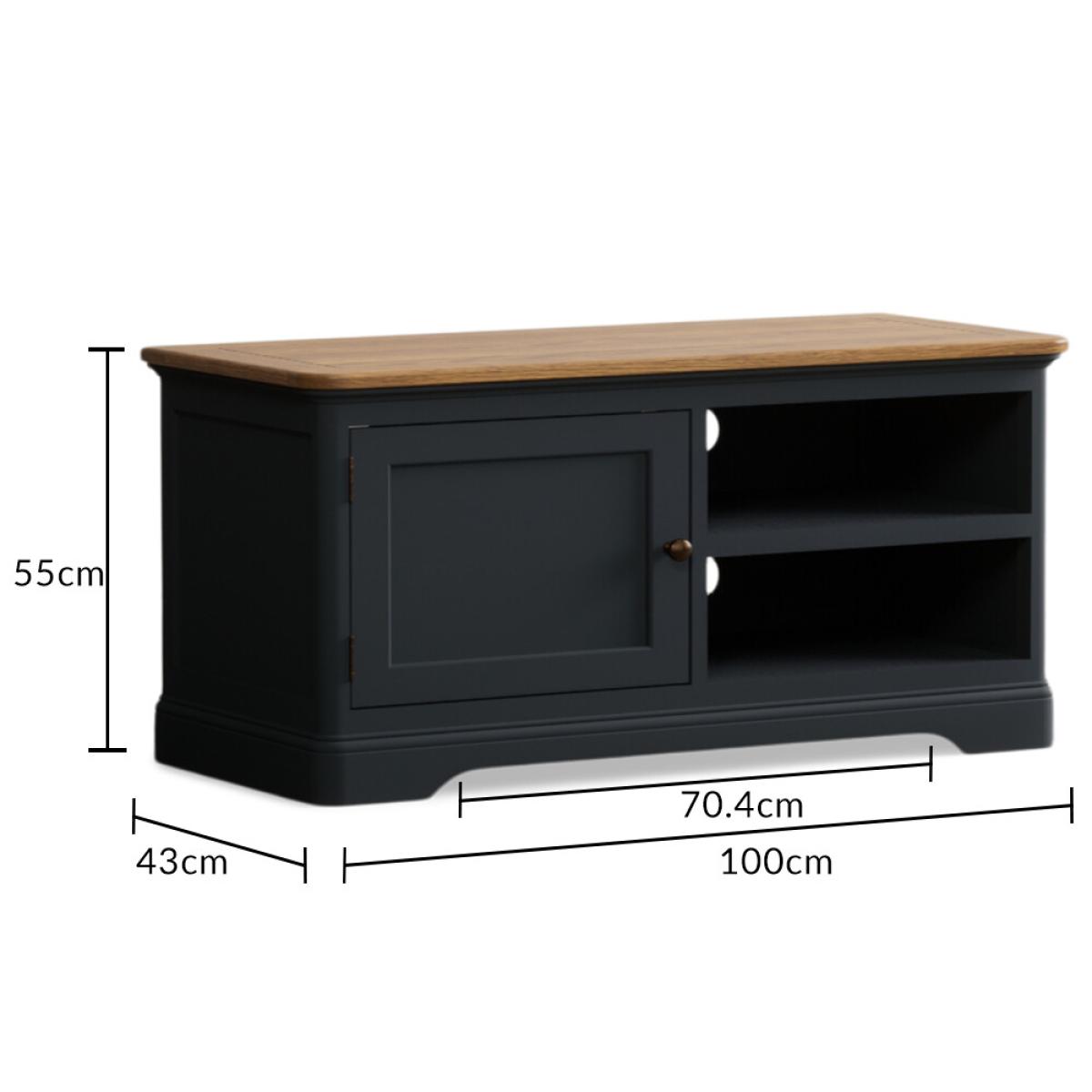The Bridstow Blue Small TV Cabinet is crafted from solid hardwood with a blue painted finish and solid oak top, cable holes at the back, two open shelf spaces and a cupboard.