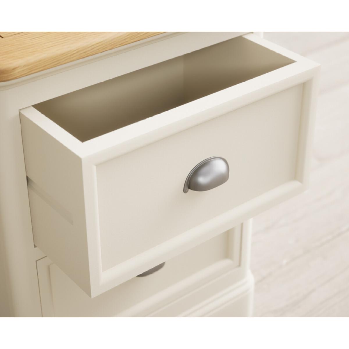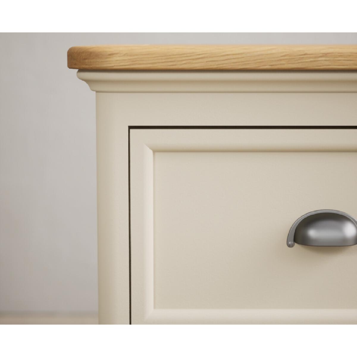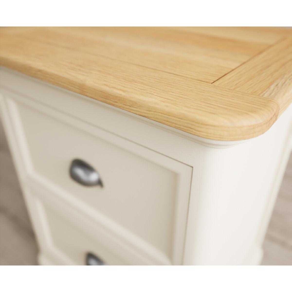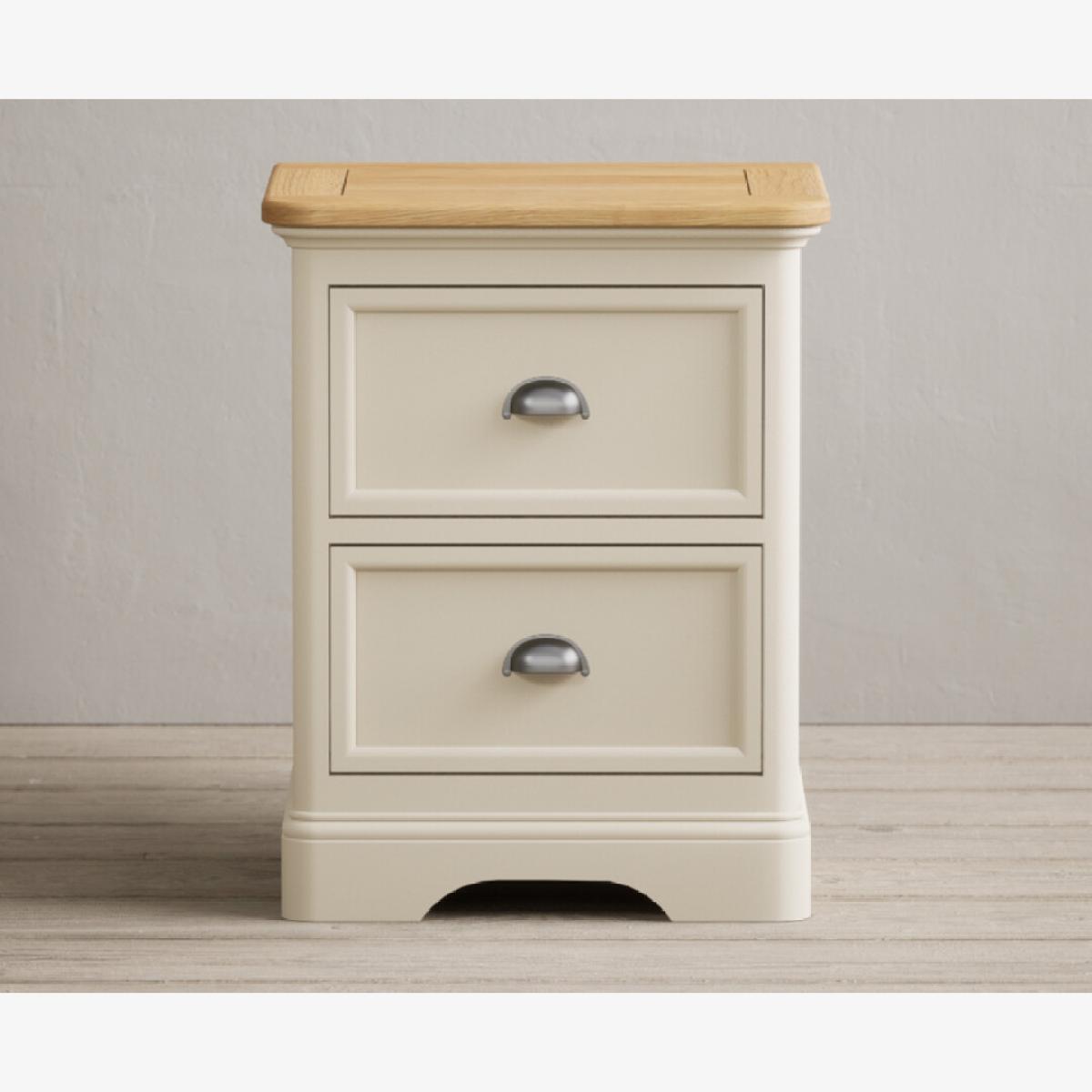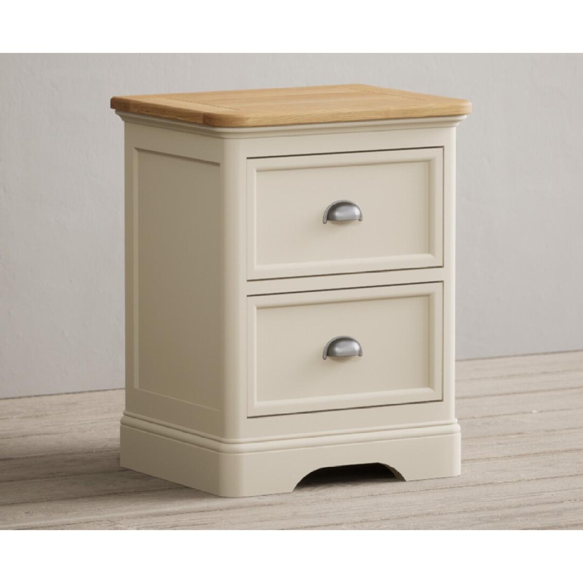 The Bridstow Oak and Cream Painted 2 Drawer Bedside Chest is crafted from solid hardwood with a cream painted finish, with a solid oak top and two dovetail drawers.