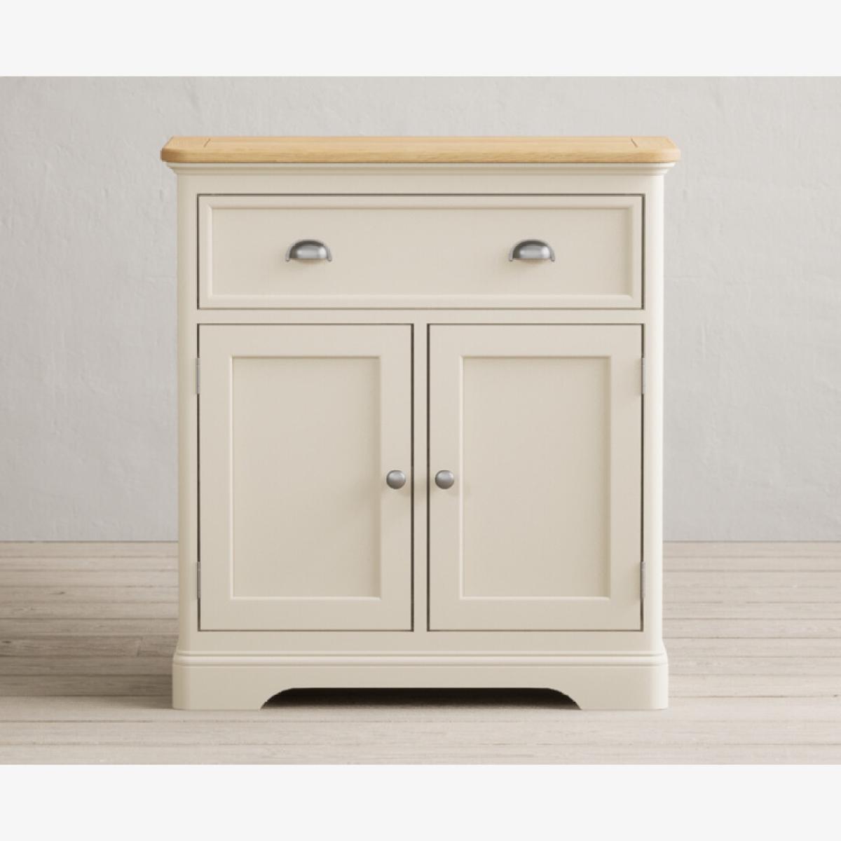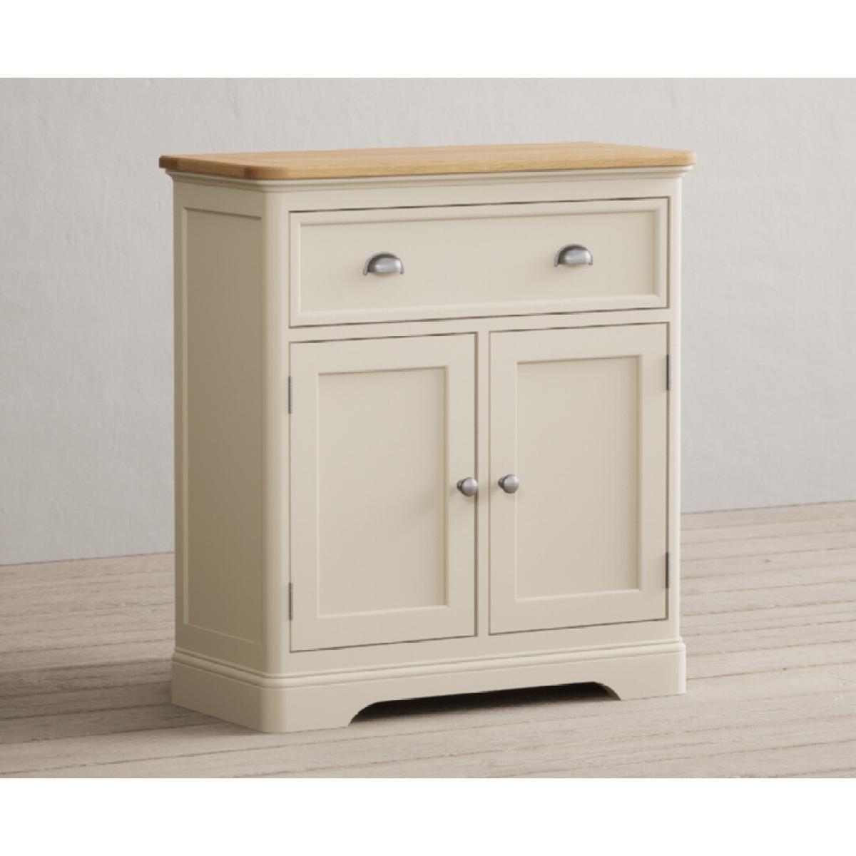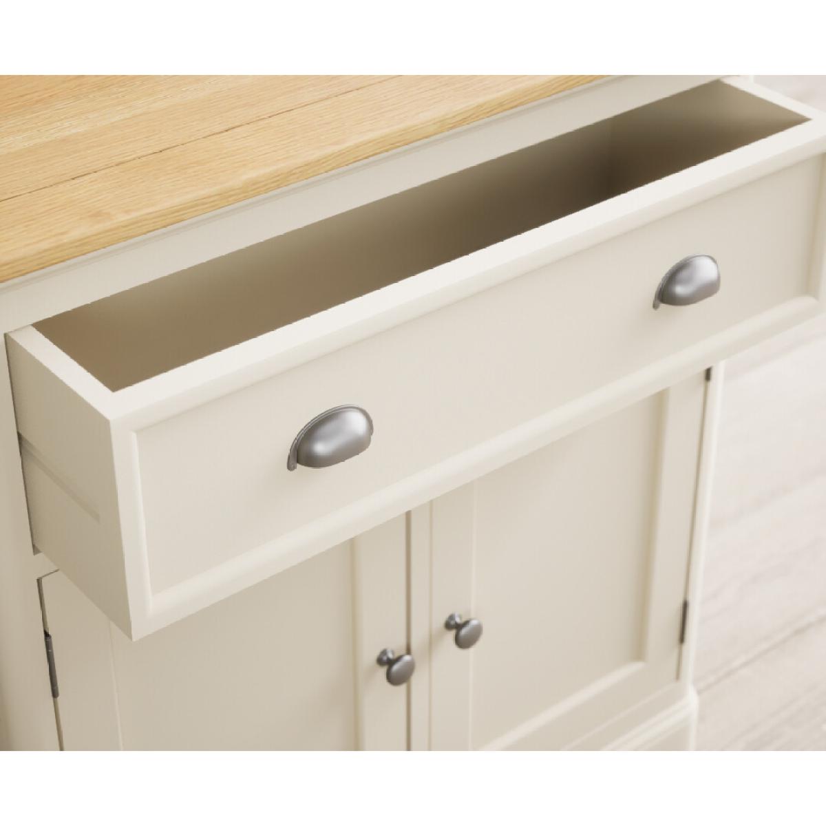 The Bridstow Oak and Cream Painted Hallway Sideboard is crafted from solid hardwood with a cream painted finish, topped with solid oak and complete with a two door cupboard and Dovetail drawer.