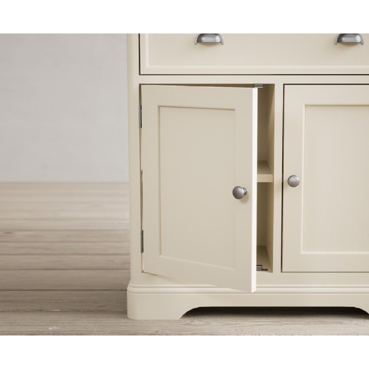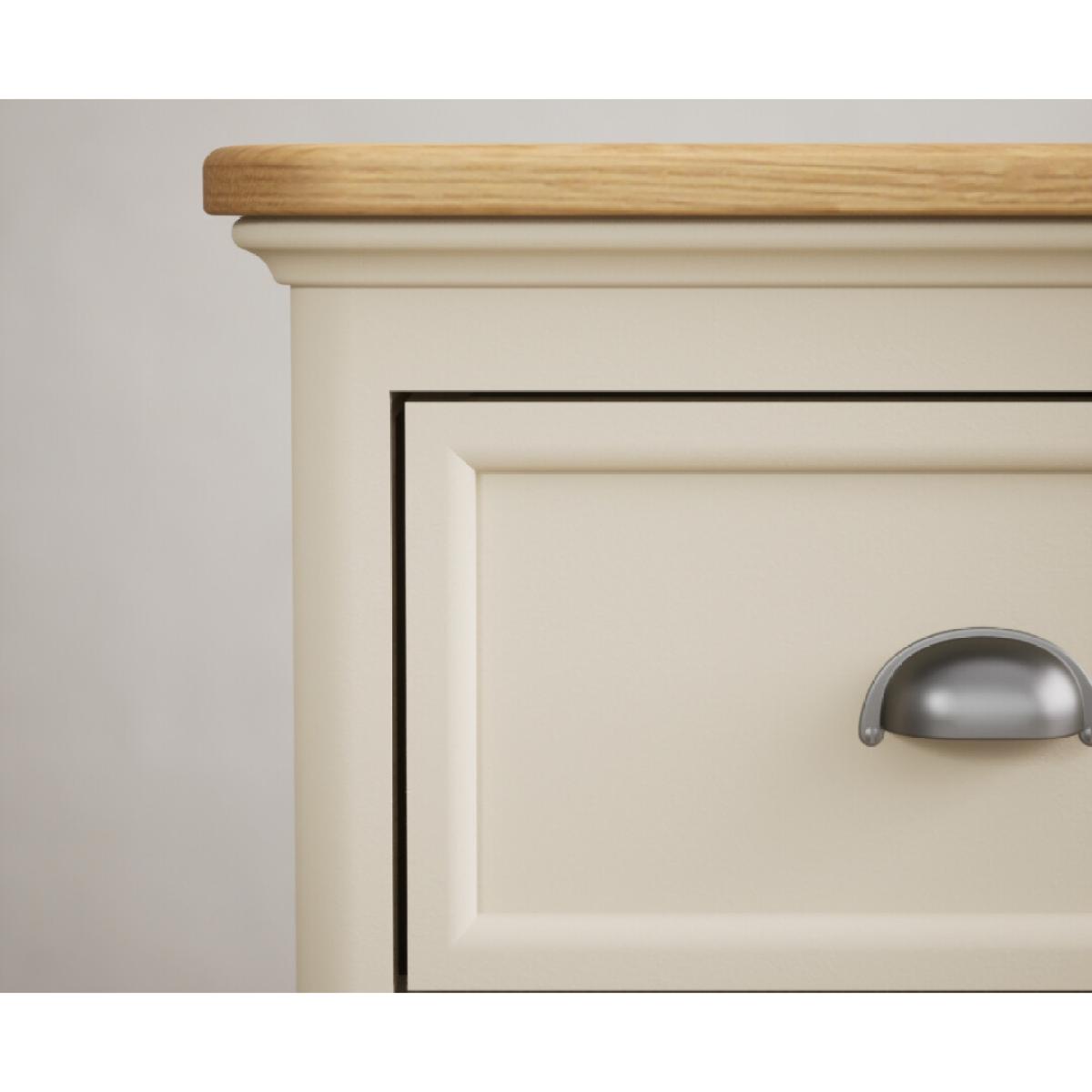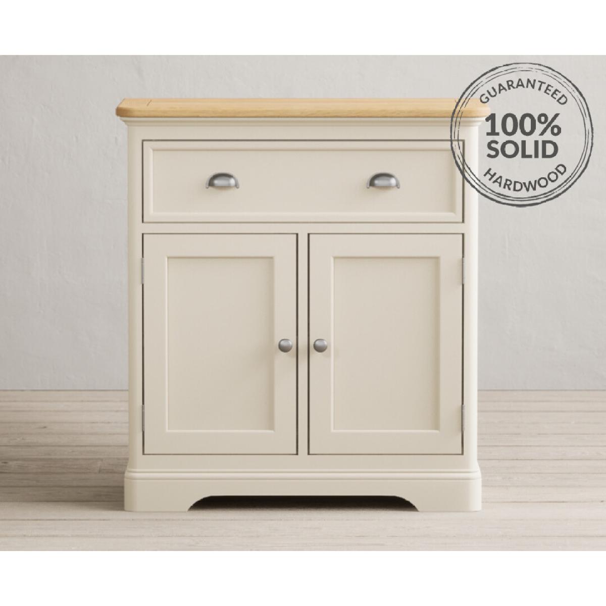 The Bridstow Oak and Cream Painted Hallway Sideboard is crafted from solid hardwood with a cream painted finish, topped with solid oak and complete with a two door cupboard and Dovetail drawer.