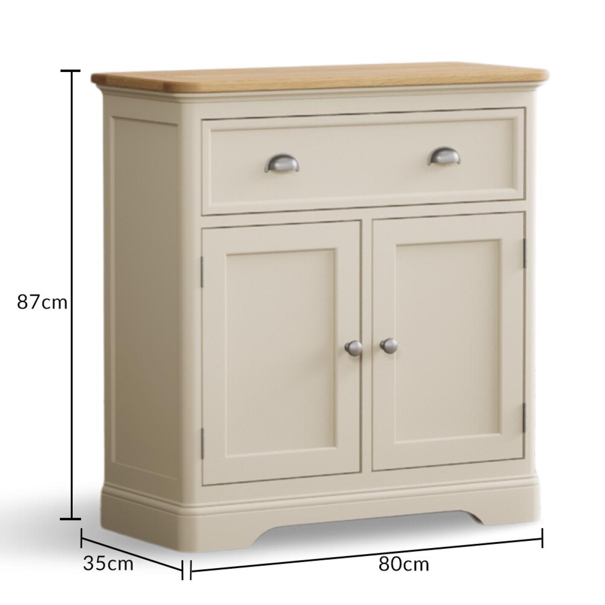 I’m a fan of this Bridstow sideboard because its oak top pairs neatly with the cream paint, so it sits comfortably in both modern country and coastal-inspired hallways. The compact footprint makes it ideal for narrow spaces, yet you still get a handy drawer for keys and two cupboards for wellies or shopping bags. To style it, hang a simple round mirror above, add a slim table lamp at one end and a small plant or ceramic jug at the other. Tuck low baskets inside the cupboards to keep scarves and gloves neatly organised.