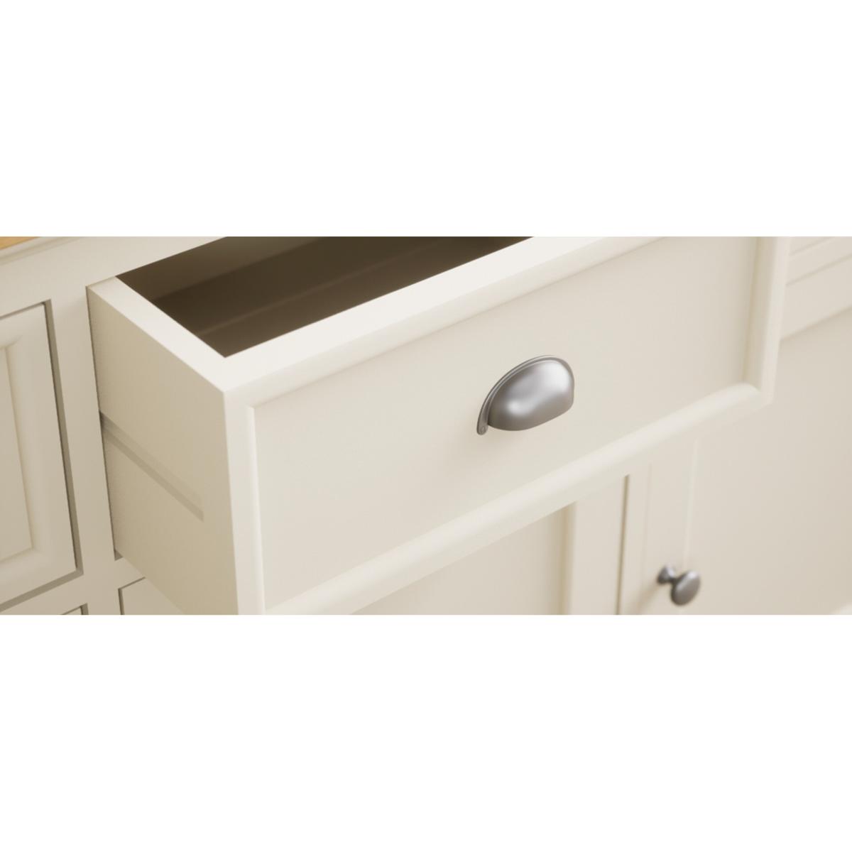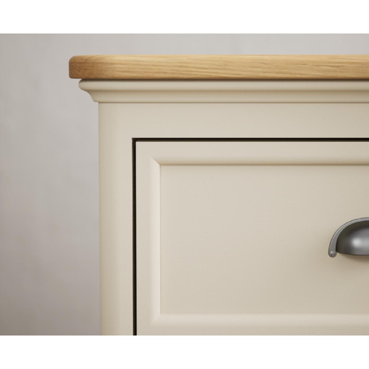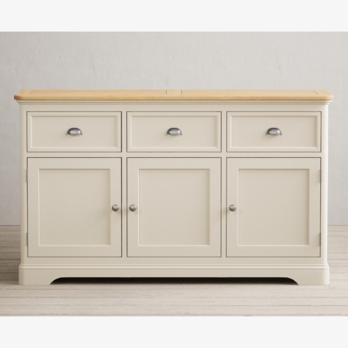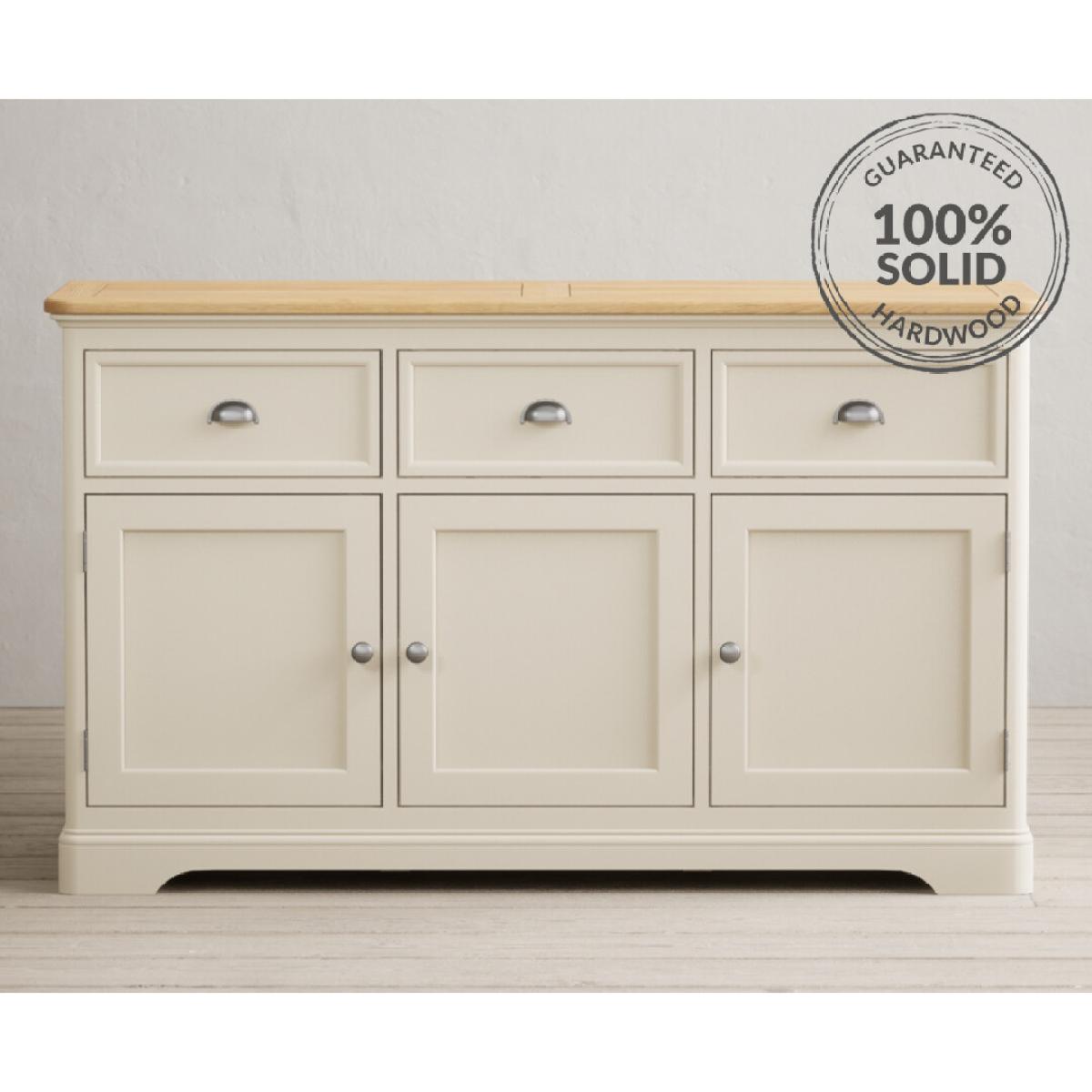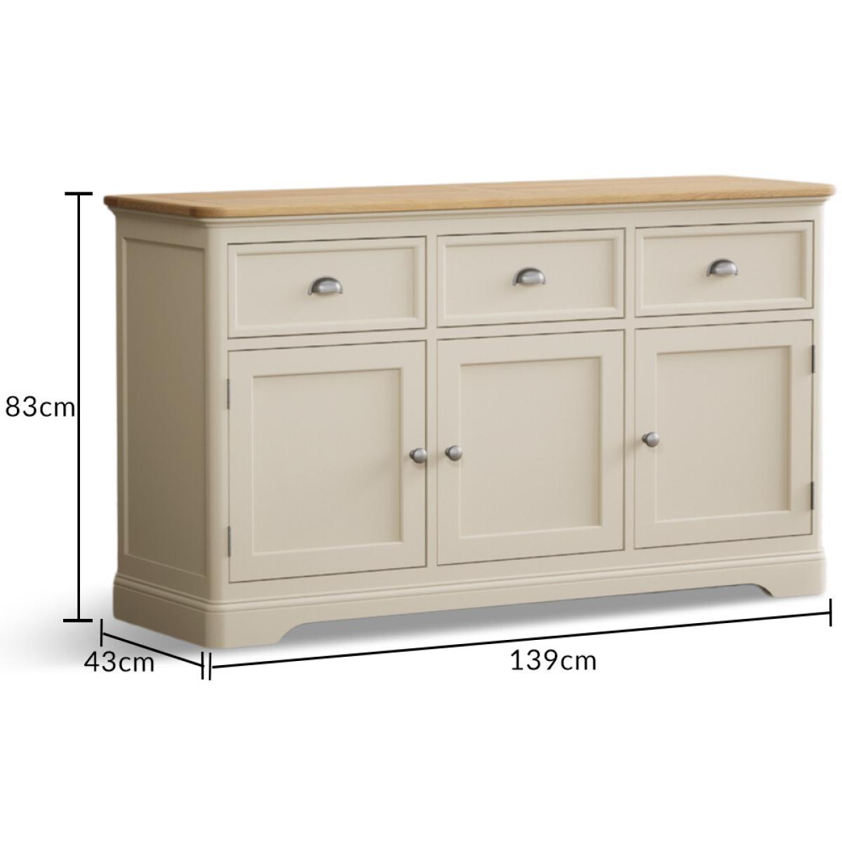 The Bridstow Oak and Cream Painted Large Sideboard is crafted from solid hardwood with a cream painted finish, topped with solid oak and complete with cupboards and Dovetail drawers.