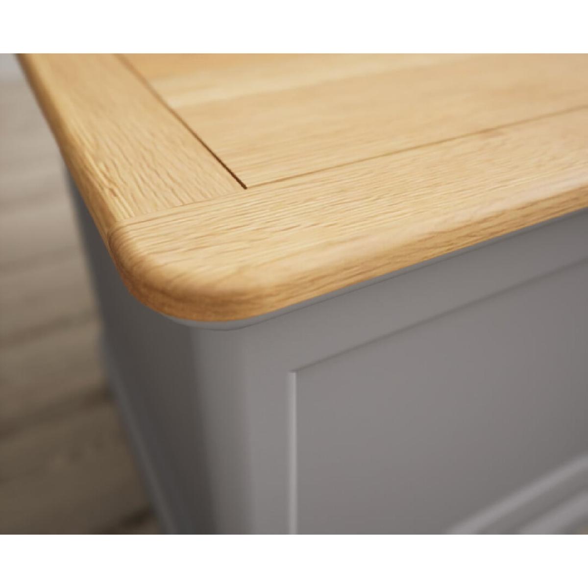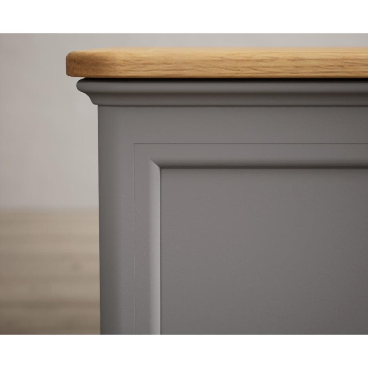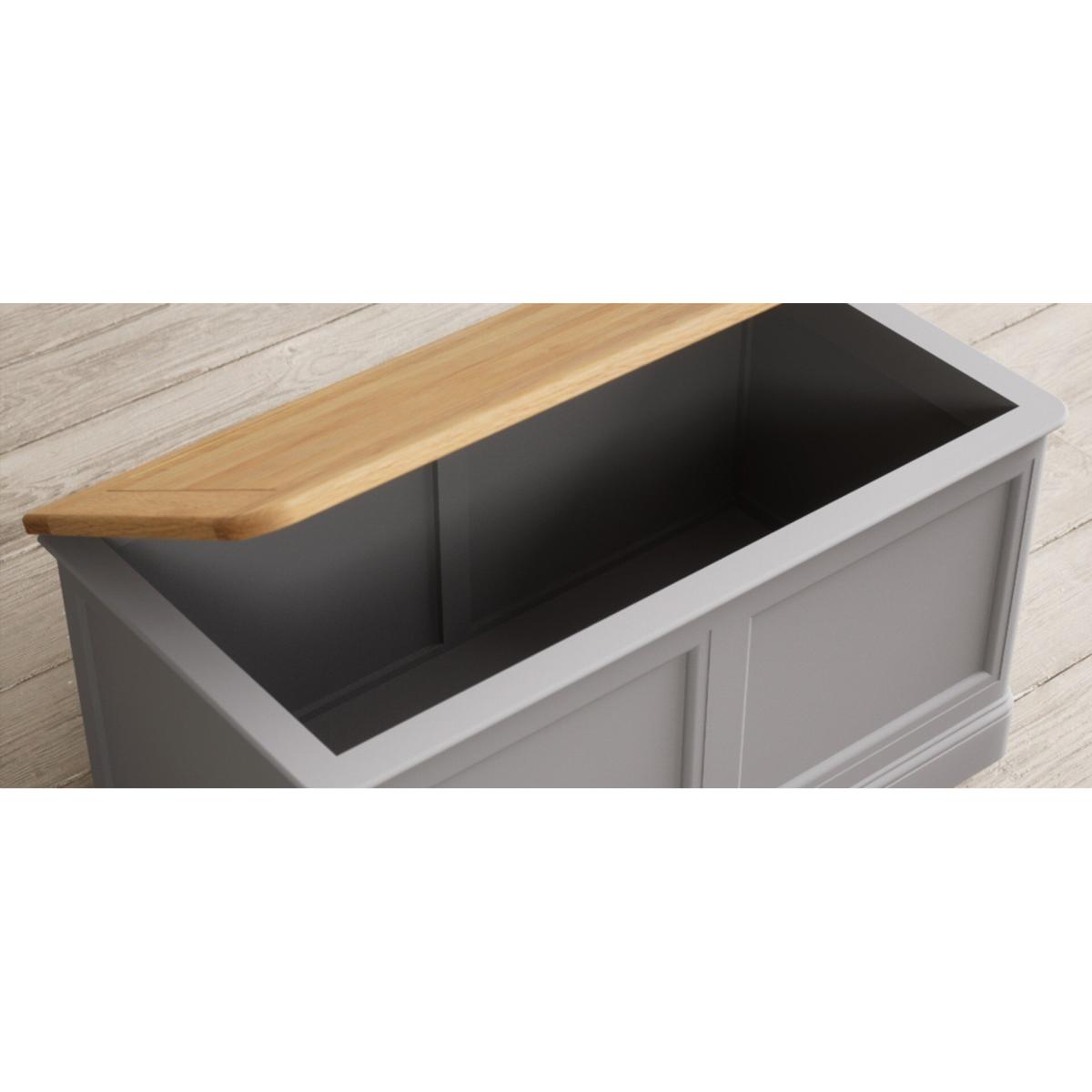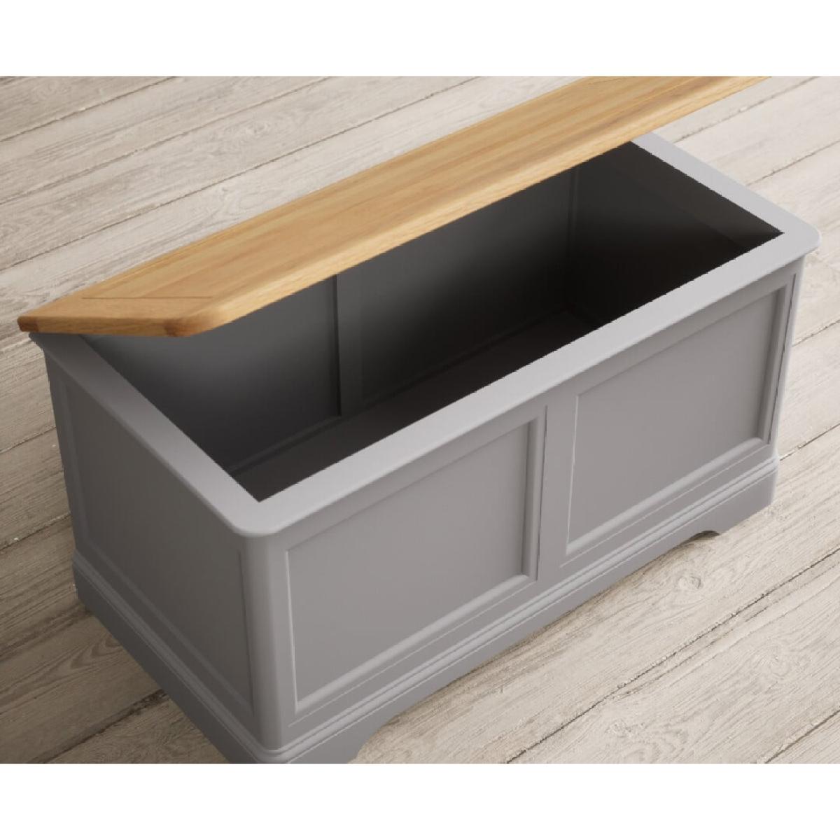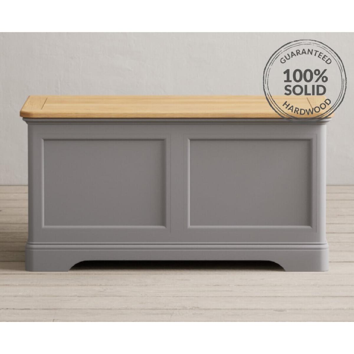 The Bridstow grey Blanket Box is crafted from durable solid hardwood, with a light grey painted finish and panelled design, topped with 100% solid oak.