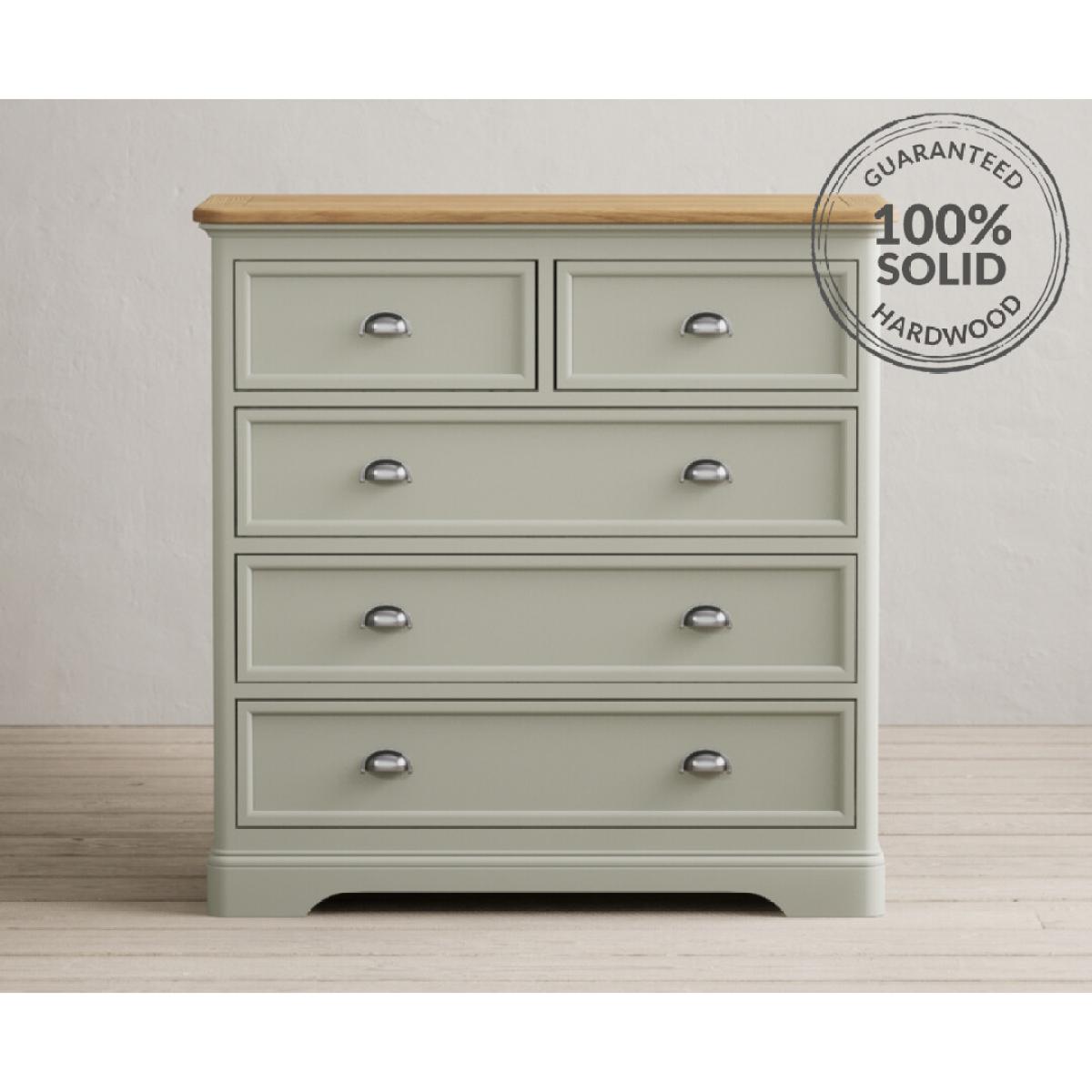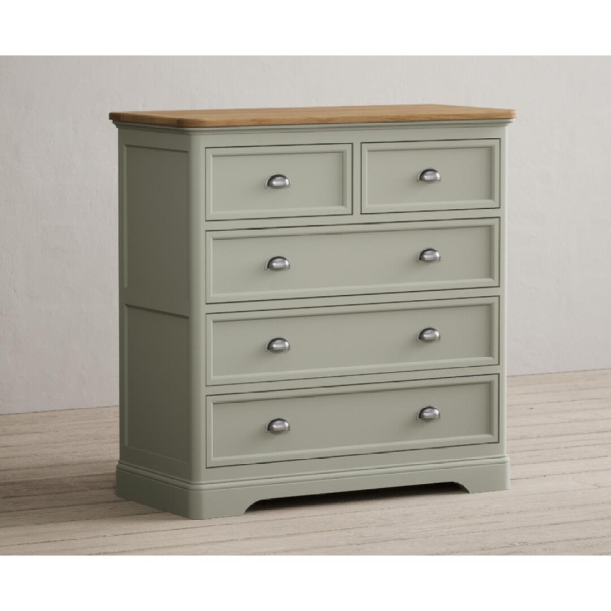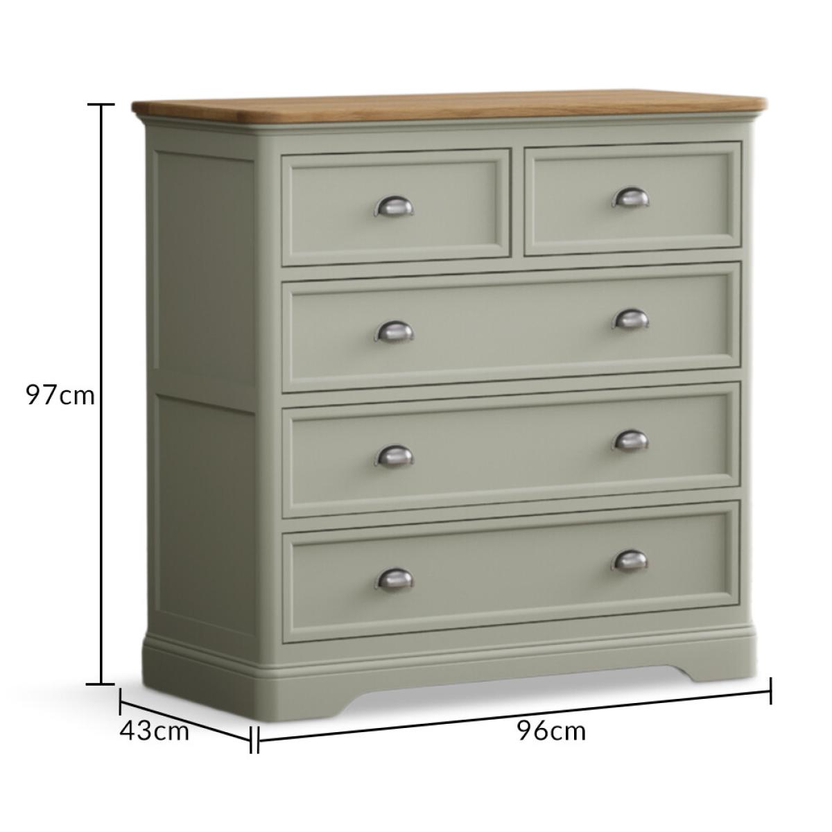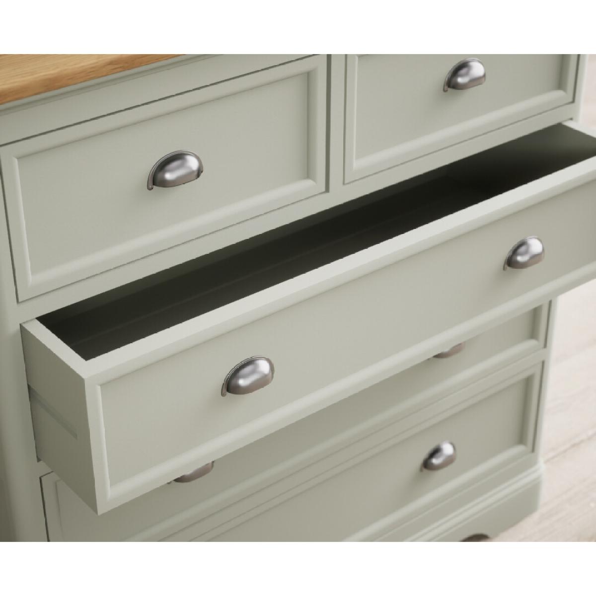The Bridstow Soft Green 2 Over 3 Chest of Drawers features a soft green painted solid hardwood frame topped with solid oak, with five dovetail drawers on wooden runners.
