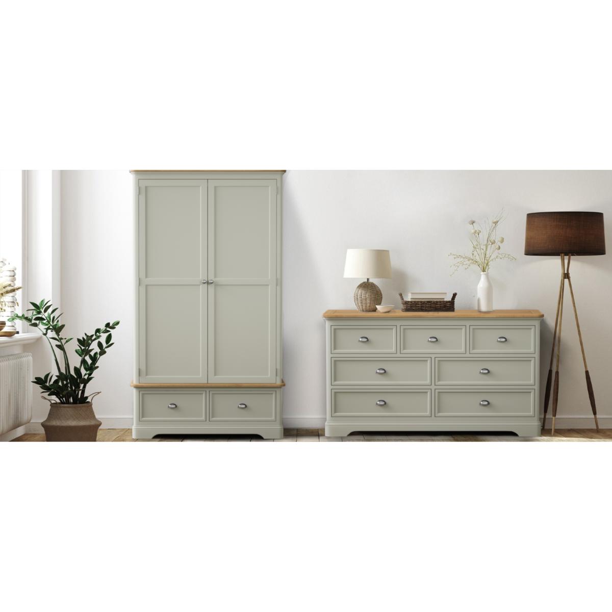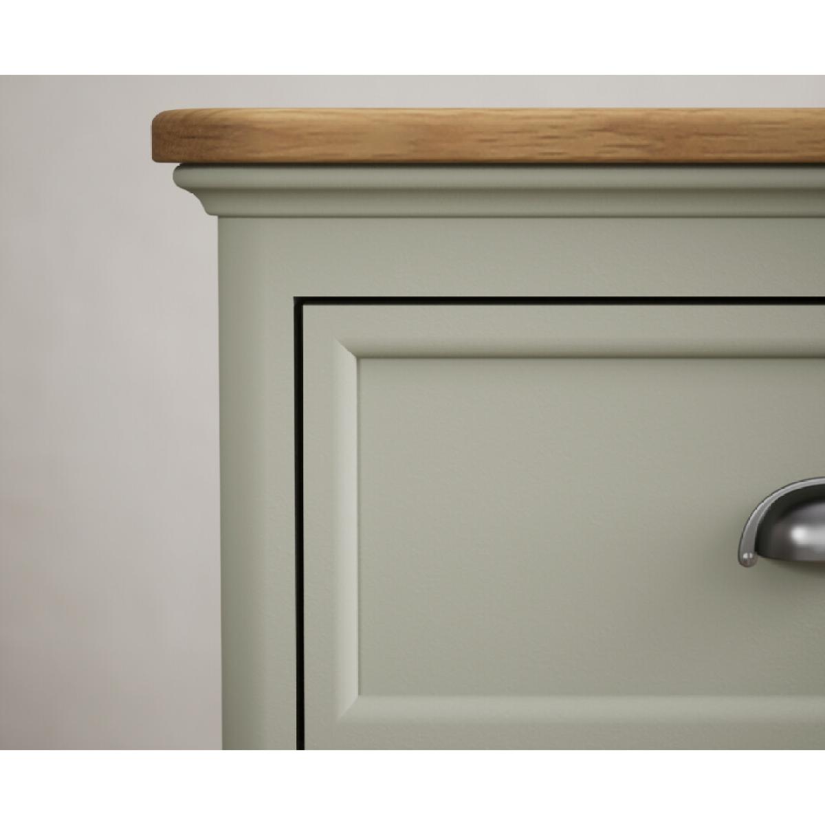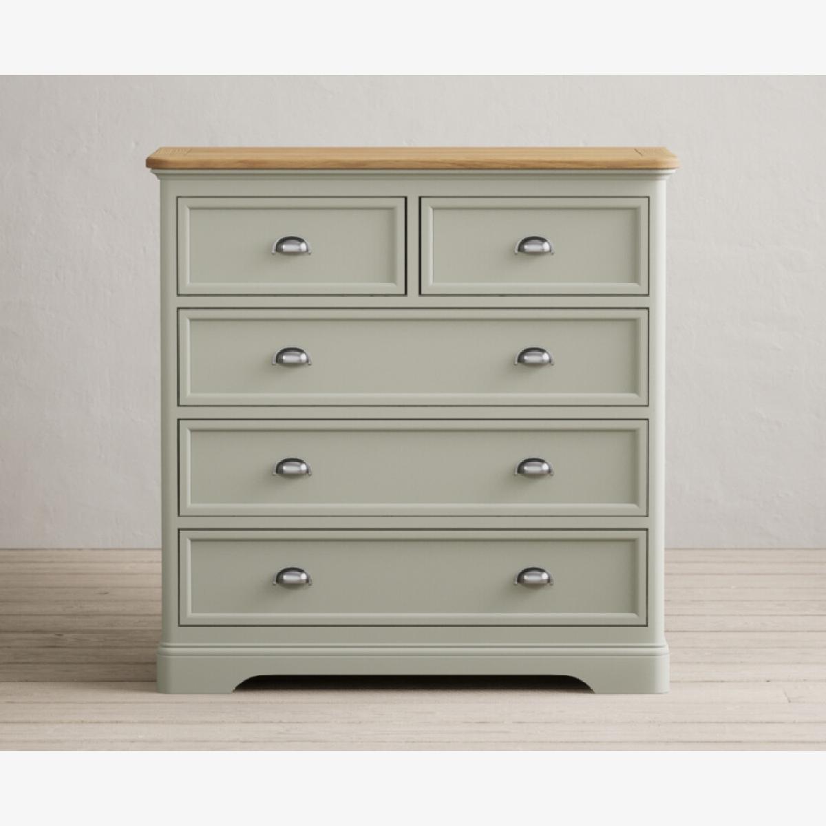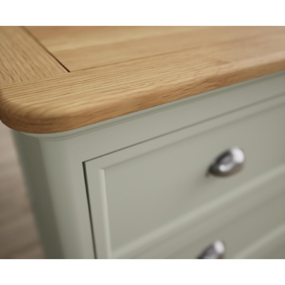 The Bridstow Soft Green 2 Over 3 Chest of Drawers features a soft green painted solid hardwood frame topped with solid oak, with five dovetail drawers on wooden runners.