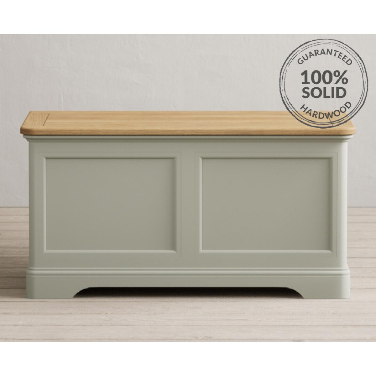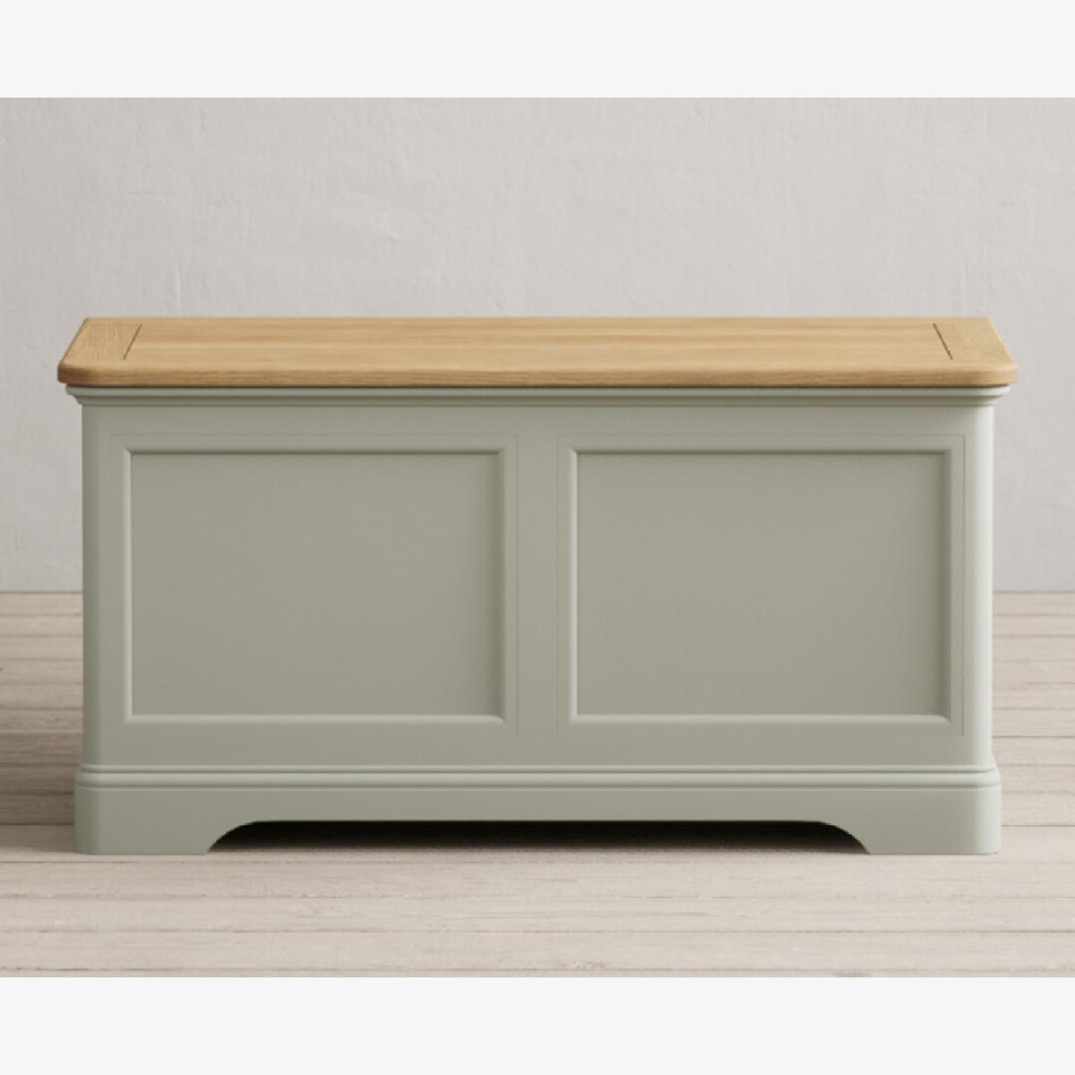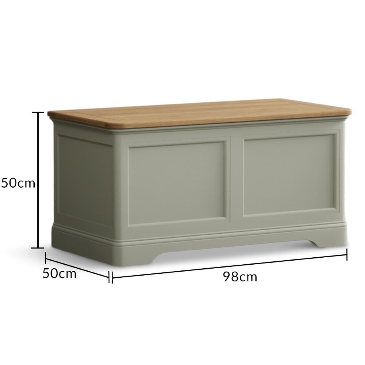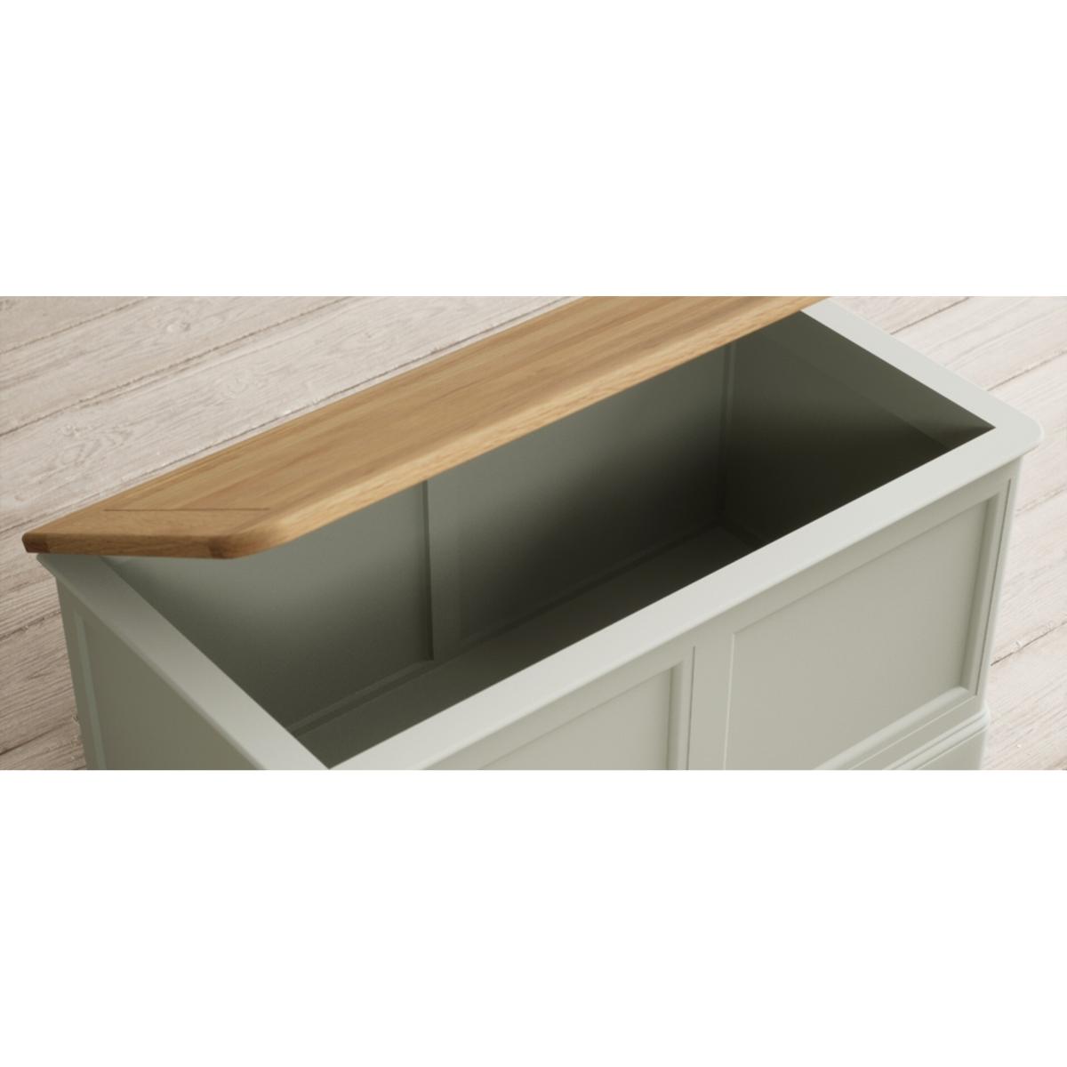 The Bridstow Soft Green Blanket Box is crafted from durable solid hardwood, with a soft green painted finish and panelled design, topped with 100% solid oak.