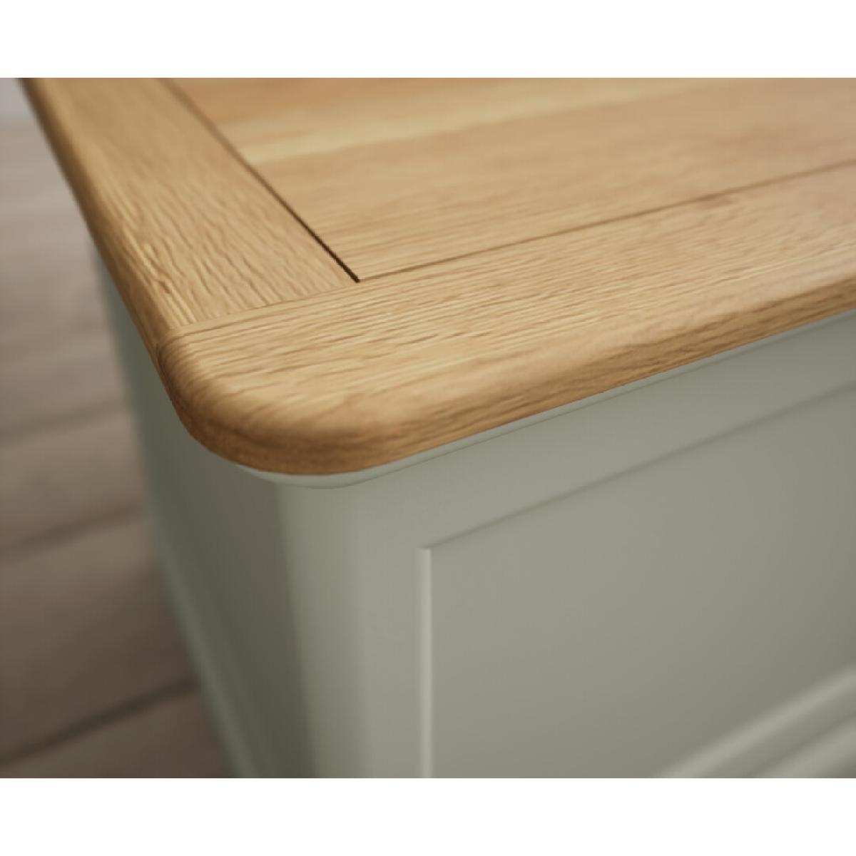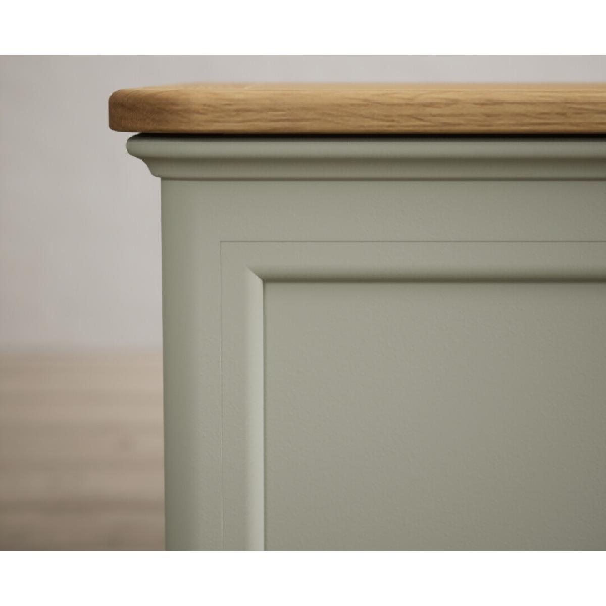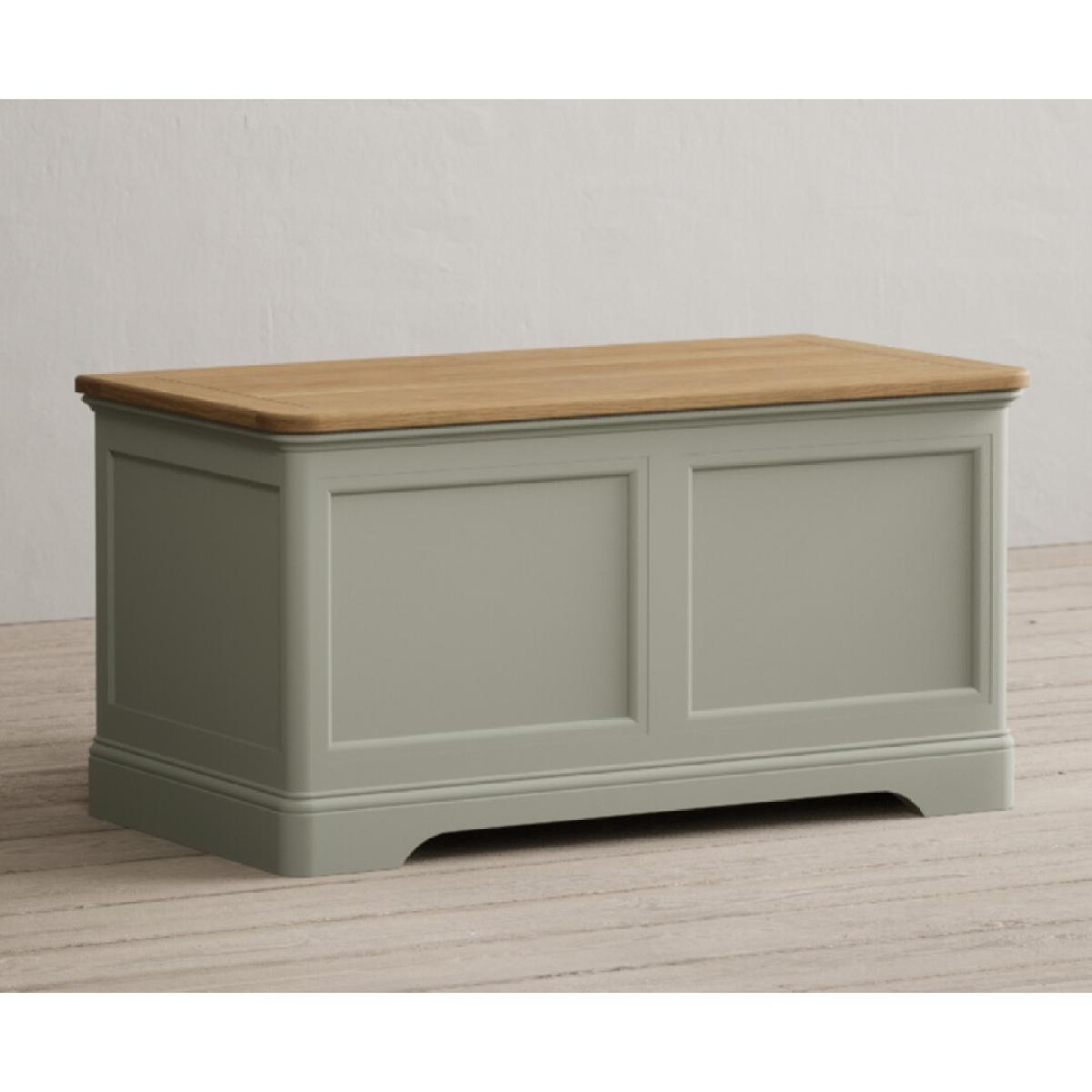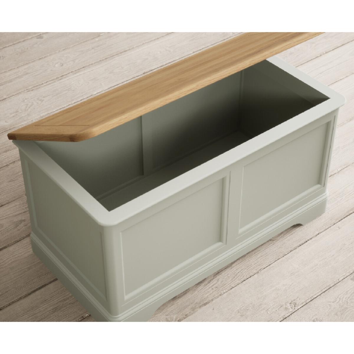 The Bridstow Soft Green Blanket Box is crafted from durable solid hardwood, with a soft green painted finish and panelled design, topped with 100% solid oak.