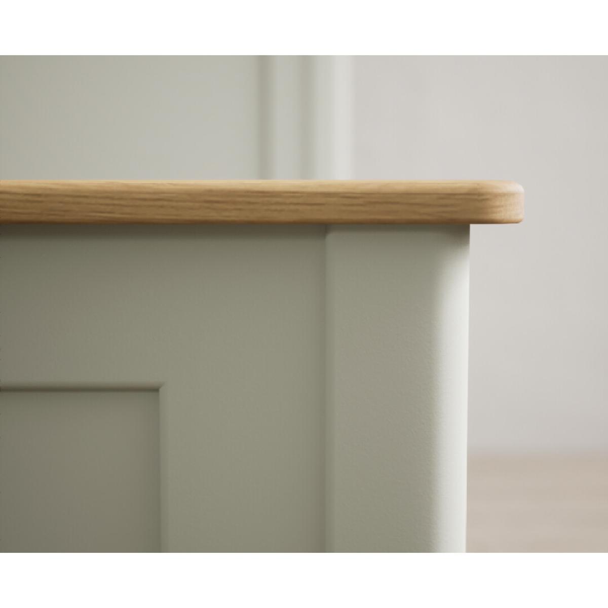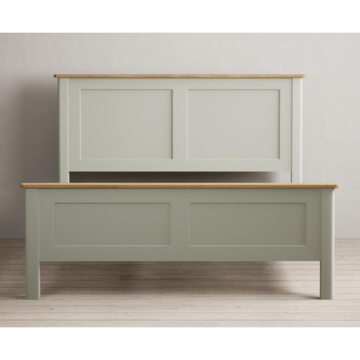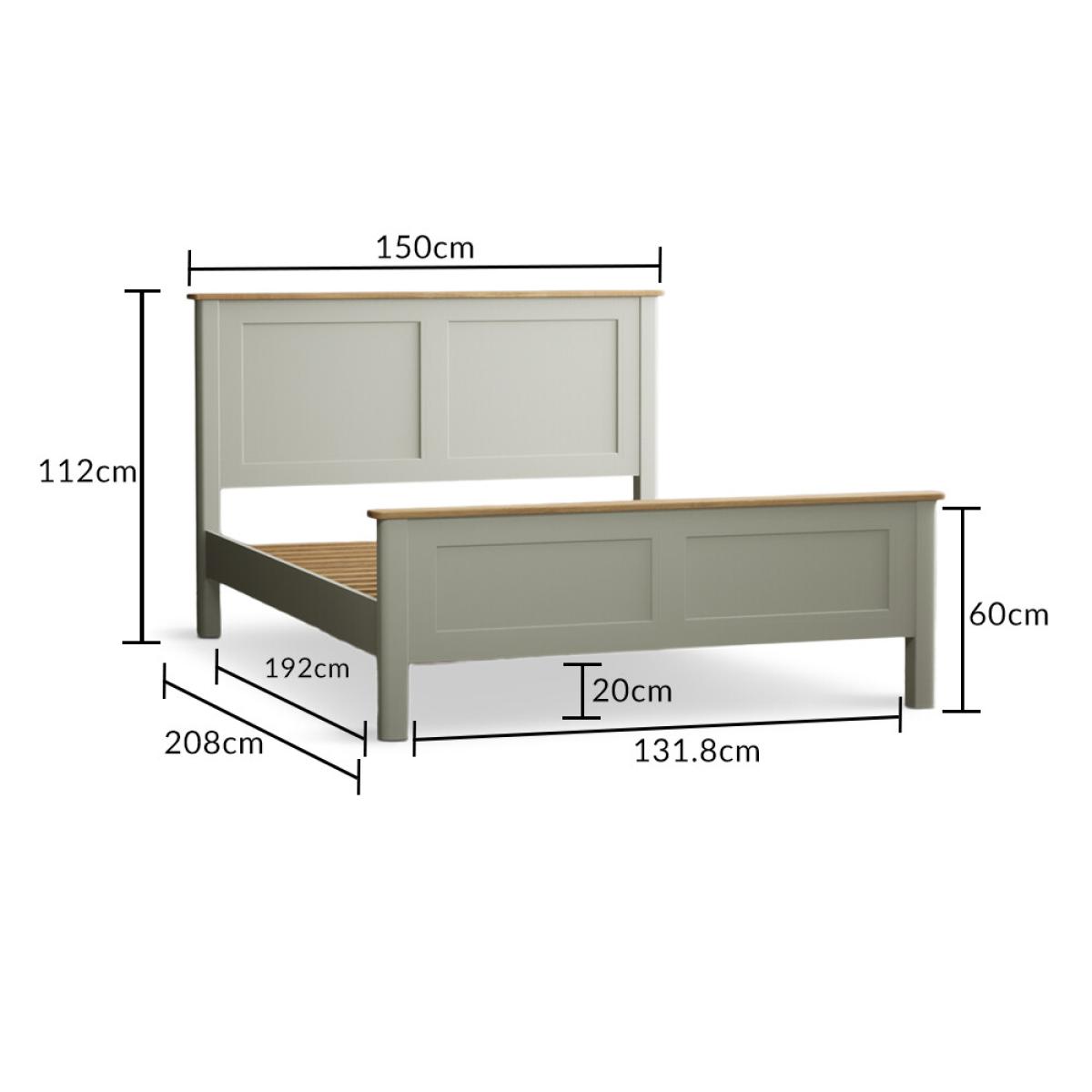 The Bridstow Soft Green Double Bed is crafted from solid hardwood with a soft green painted finish, with solid oak topping the headboard and footboard and complete with solid wood slats.