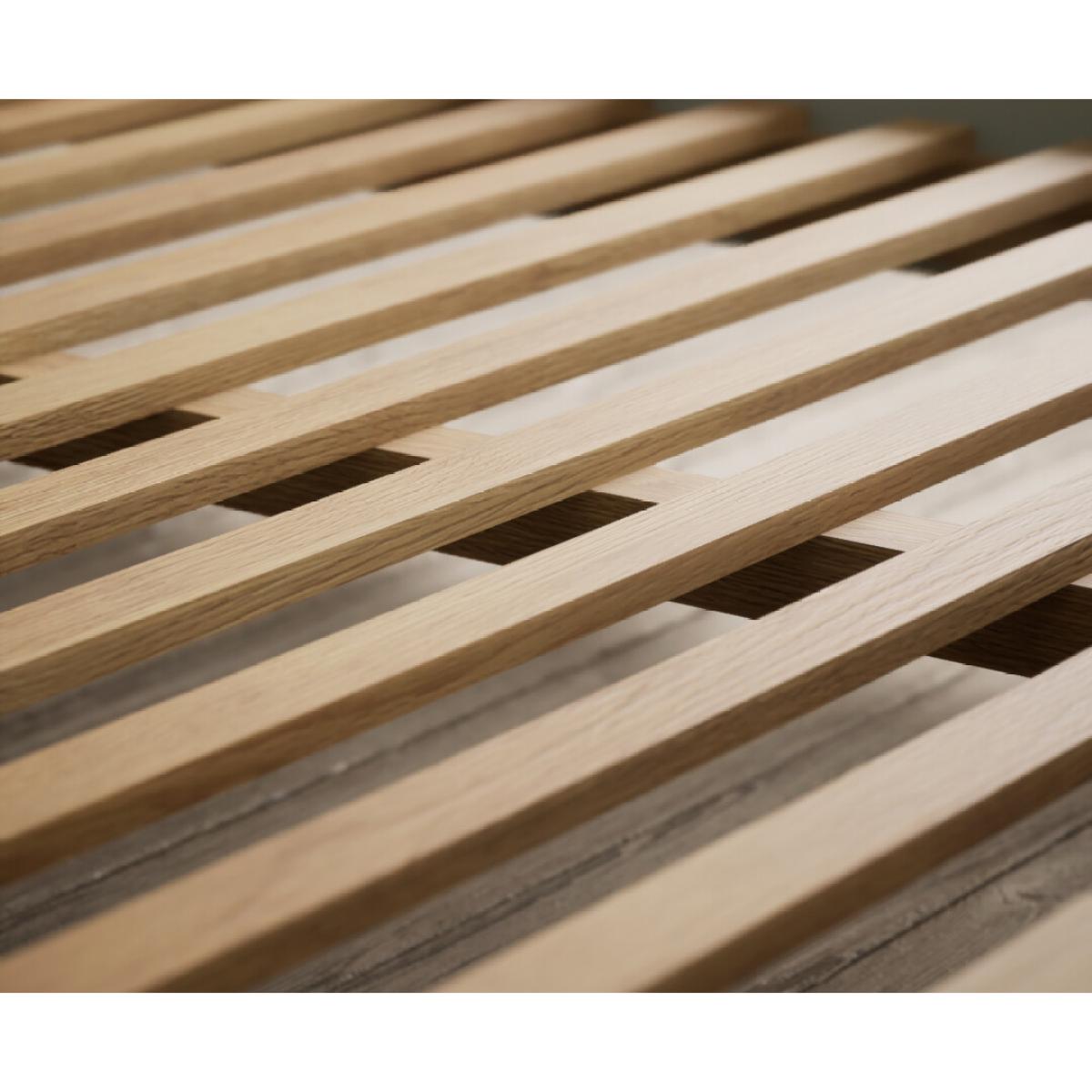 I’d recommend this soft green bed frame for its clean, panelled design and oak top rail, which brings a subtle warmth to the bedroom. It works equally well in a Scandi-inspired scheme - think pale walls, simple linens and minimal accessories - as it does in a modern country look with botanical prints or floral cushions. For styling, layer crisp white or natural-linen bedding and add a chunky knit throw at the foot. Introduce texture with a jute rug or woven baskets and pick bedside tables in light wood or rattan to echo the oak detail. A couple of potted plants and brass-finish lamps complete the scheme without overpowering the calm palette.