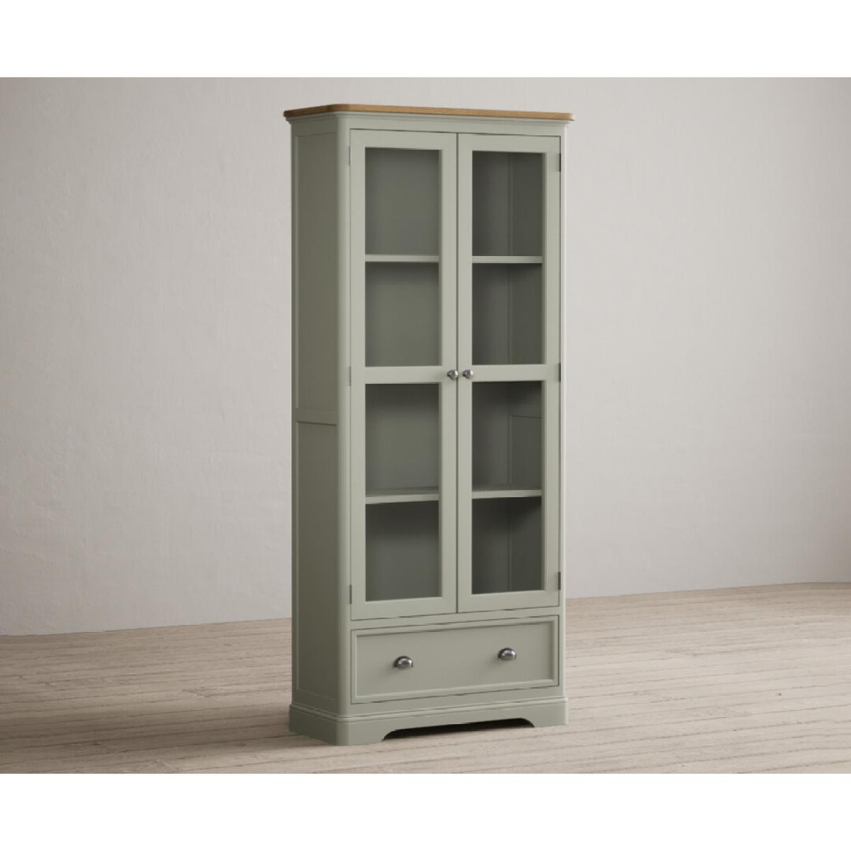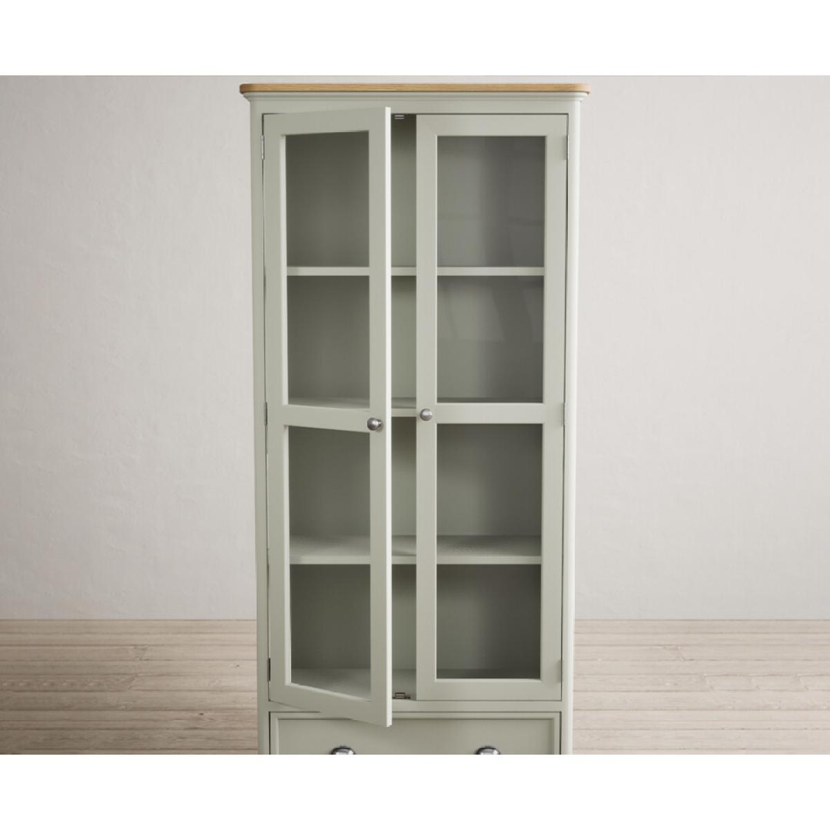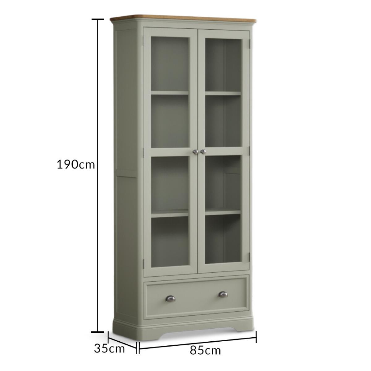 The Bridstow Soft Green Glazed Display Cabinet features a soft green painted solid hardwood frame, topped with 100% solid oak and complete with dovetail drawers.